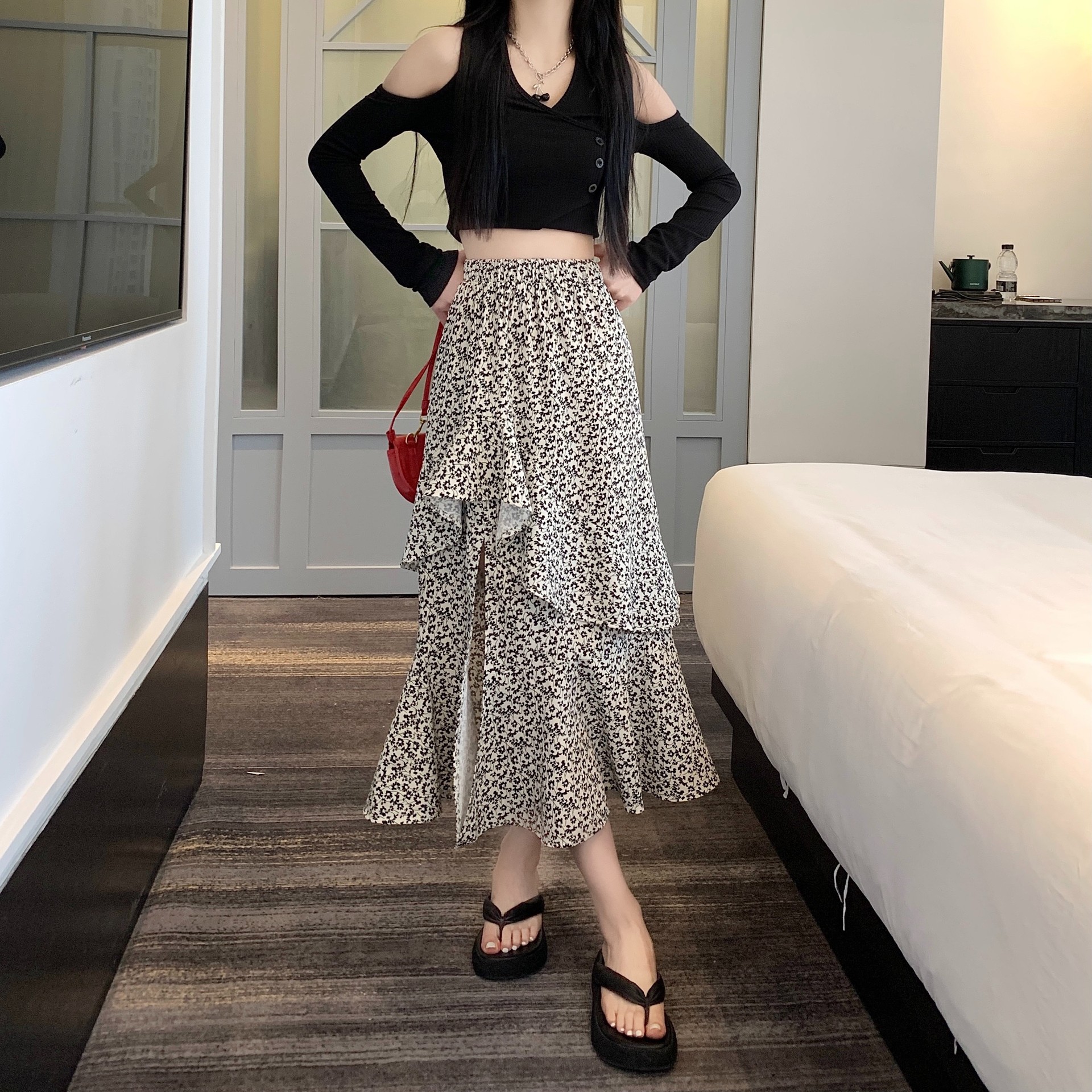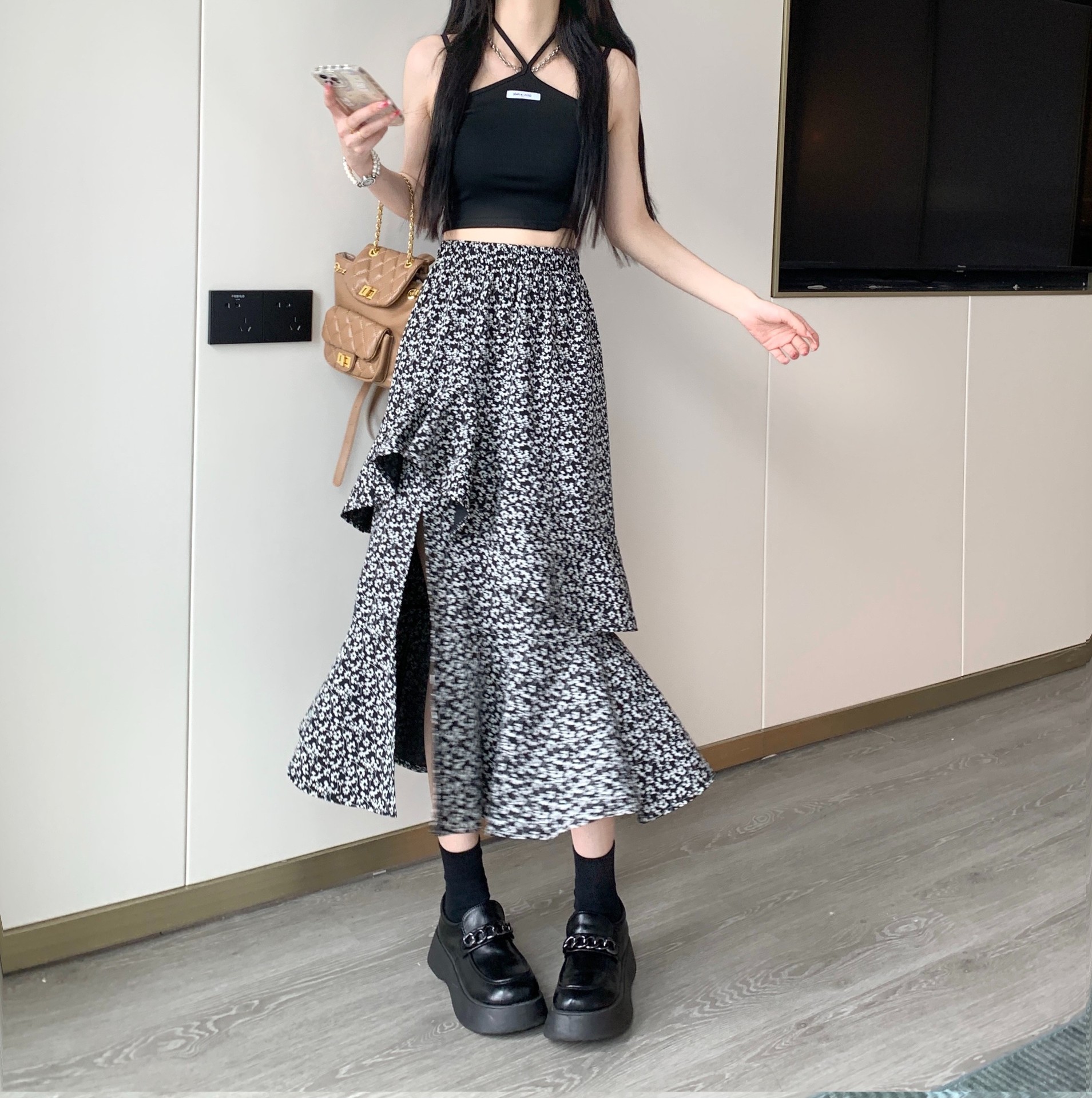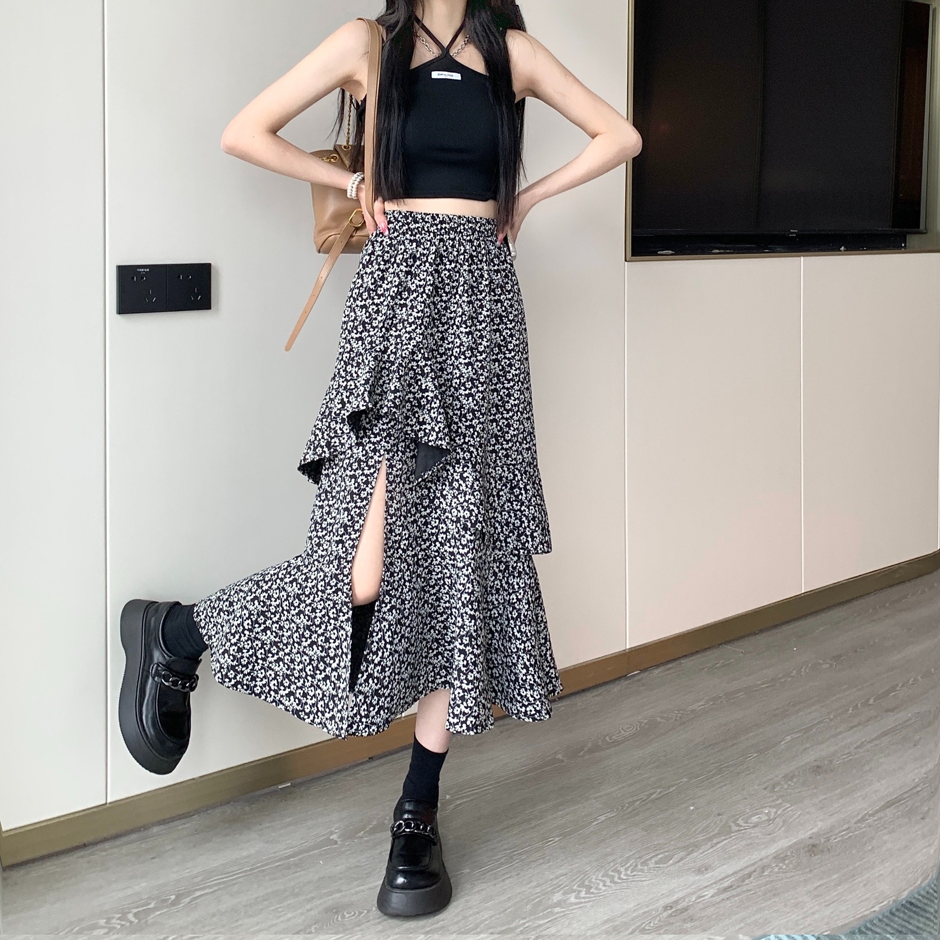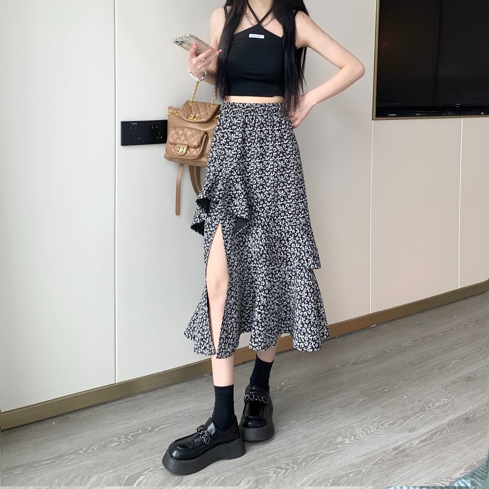 2024 봄/여름 높은 허리 슬리밍 중간 길이 불규칙한 러플 꽃 스플릿 하프 A 라인 피쉬 테일 스커트