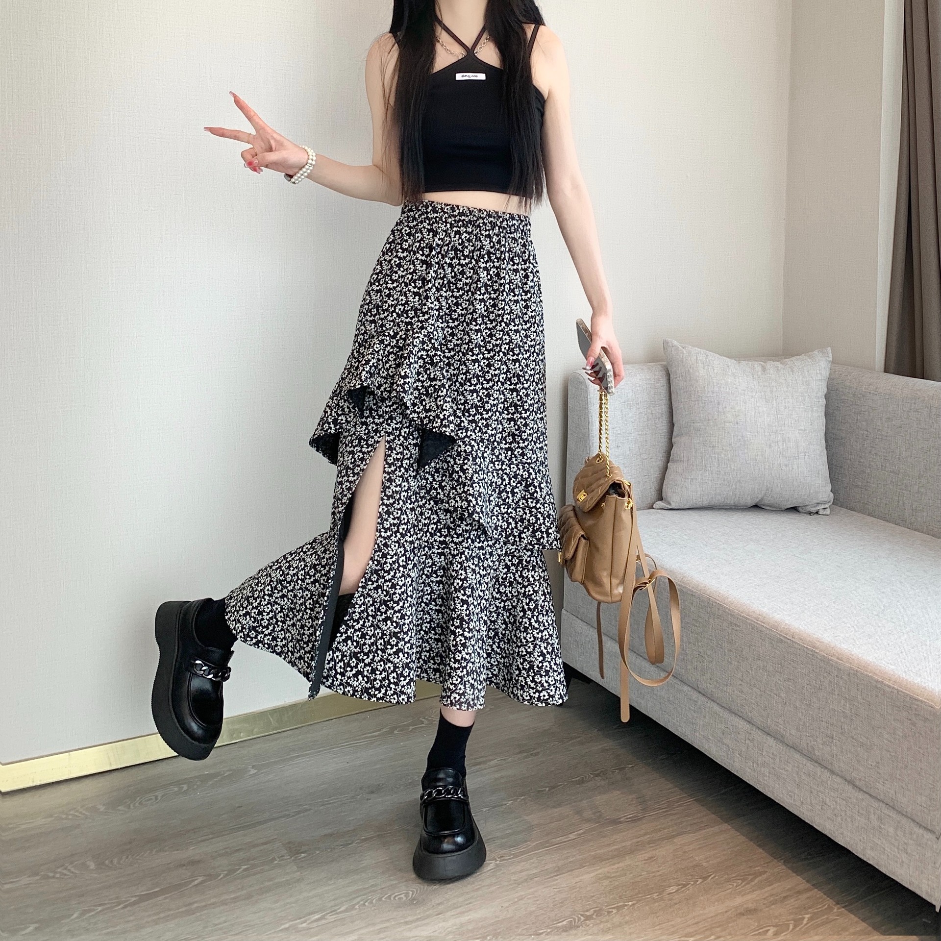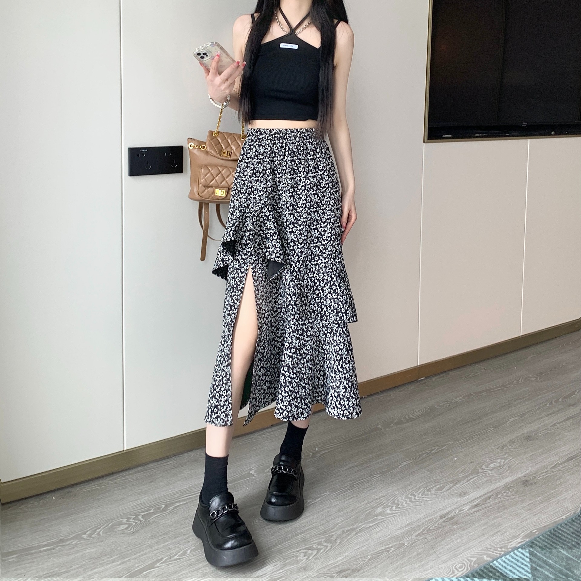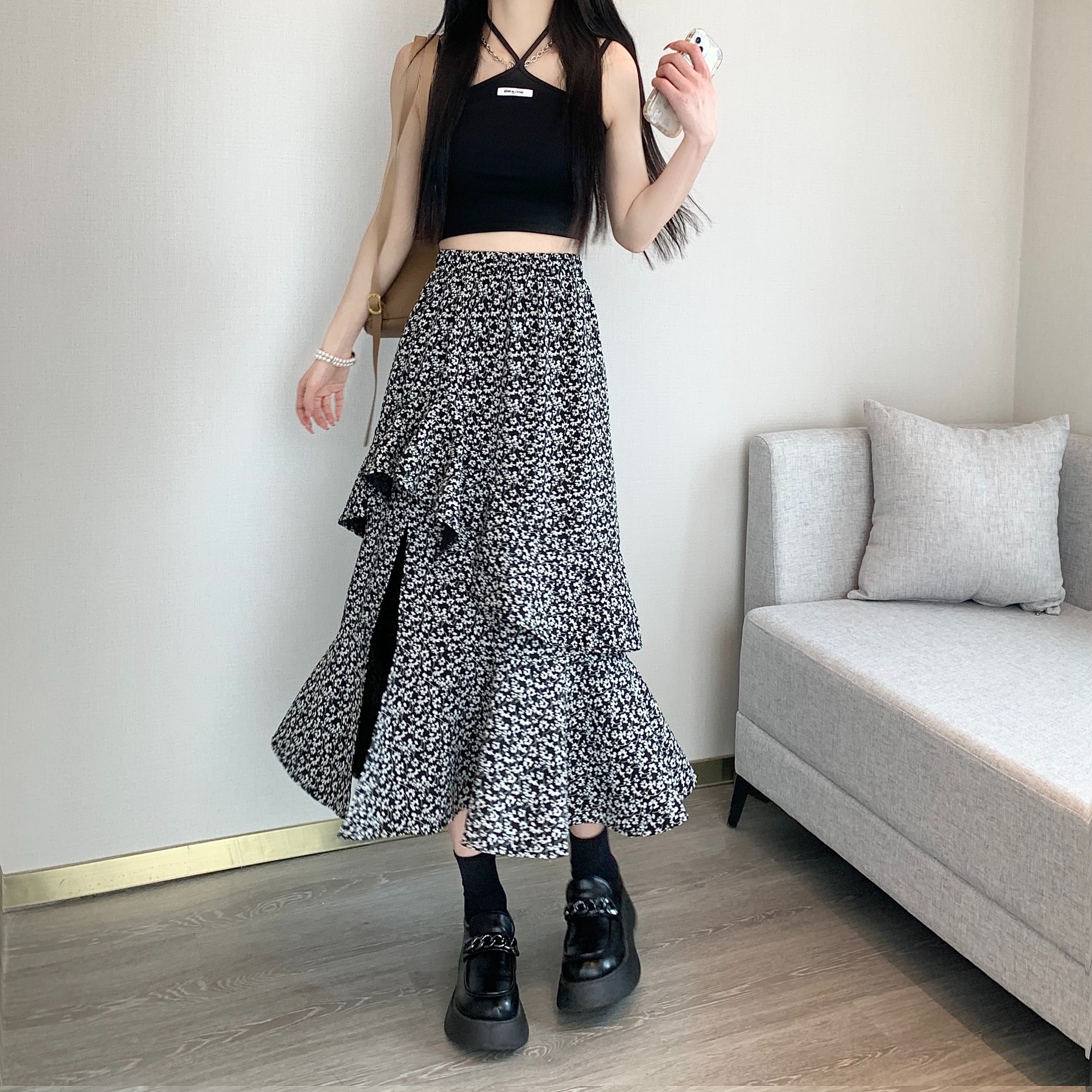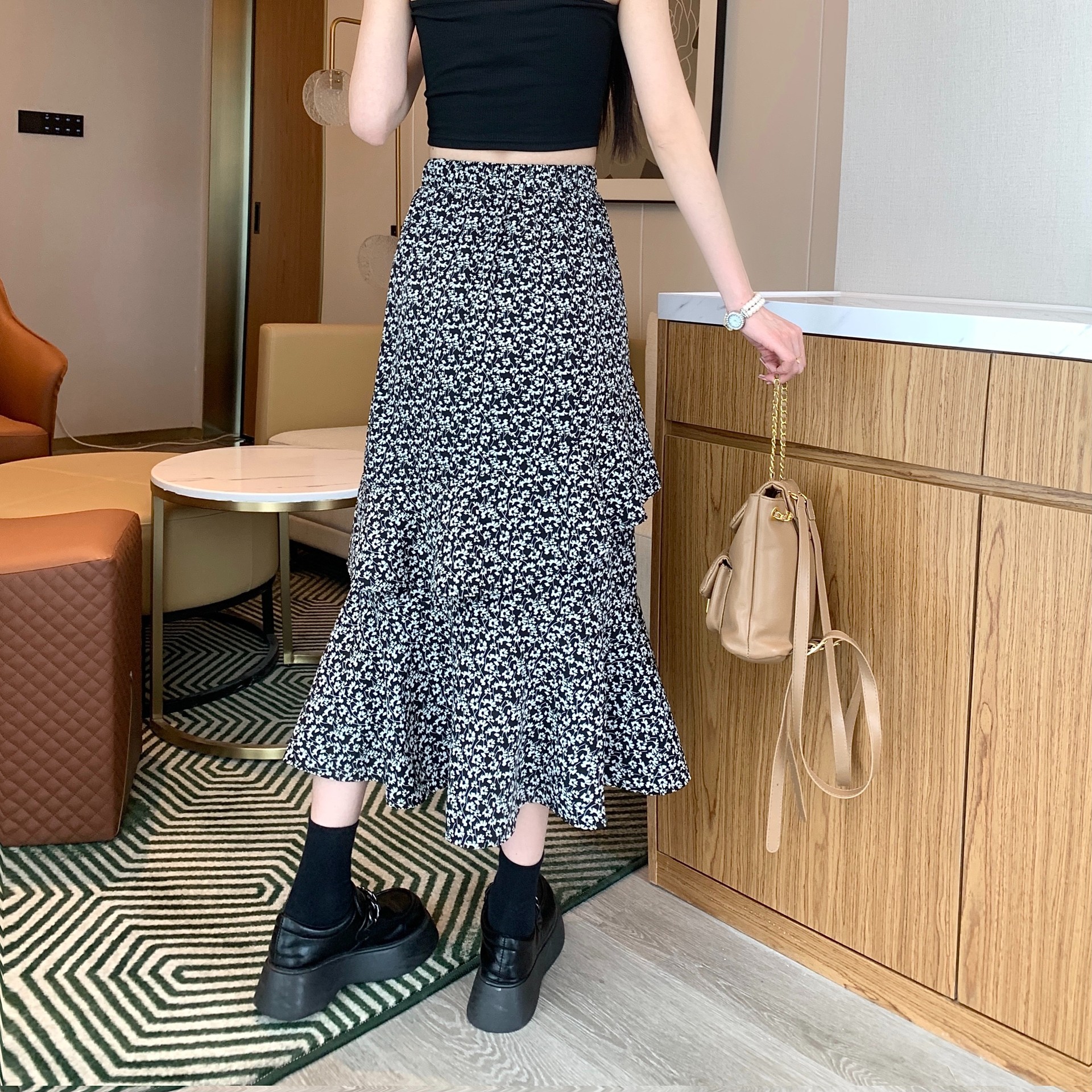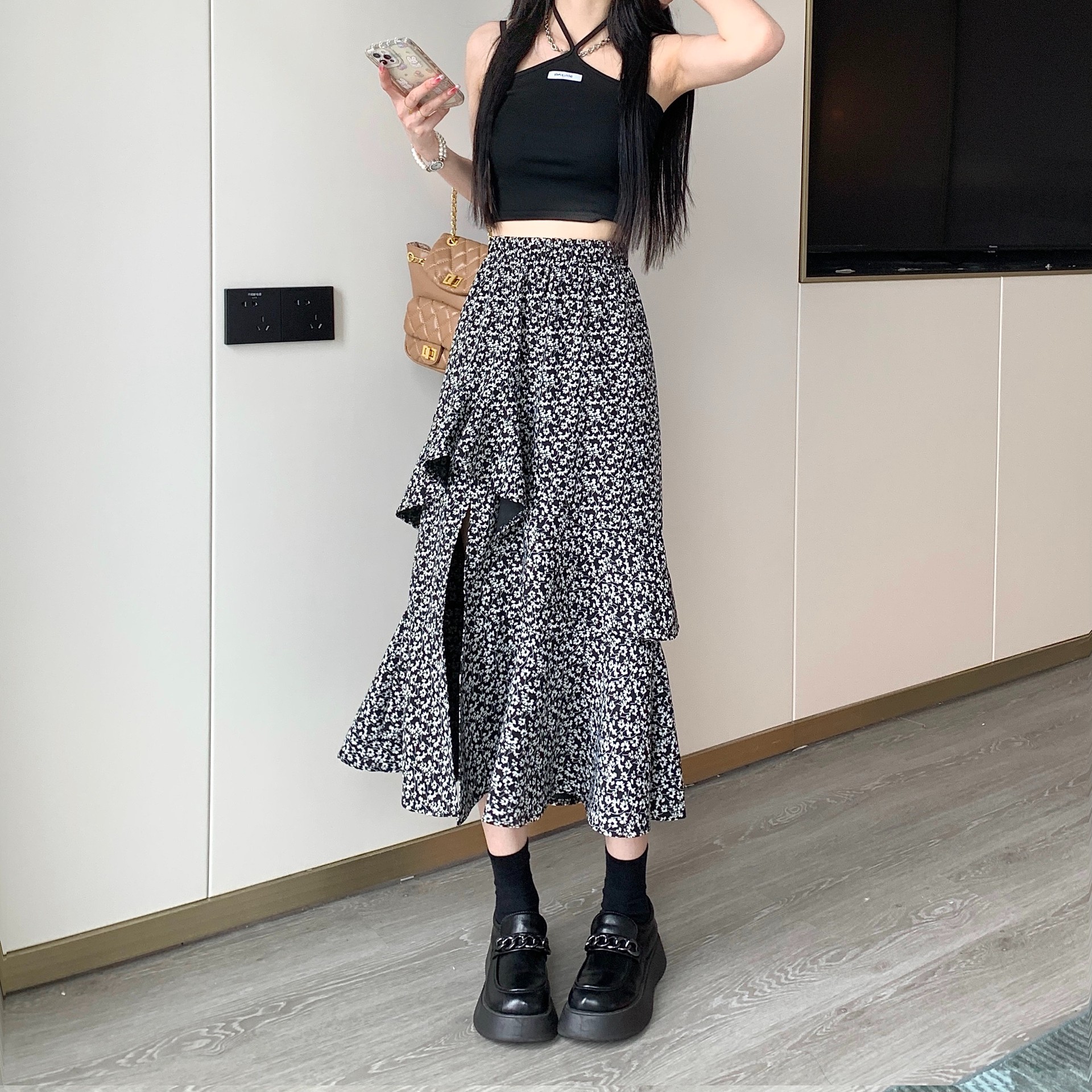 2024 봄/여름 높은 허리 슬리밍 중간 길이 불규칙한 러플 꽃 스플릿 하프 A 라인 피쉬 테일 스커트