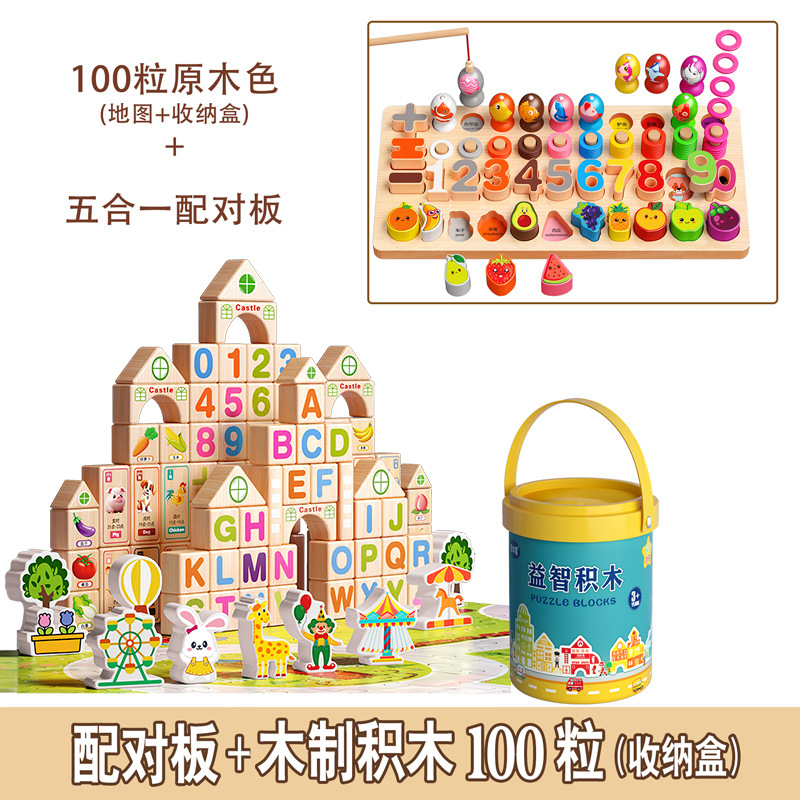 • 원목 대형 빌딩 블록 100개 [퍼즐이 있는 통] + 5-in-1 [숫자 + 과일 + 낚시 + 반지 + 덧셈 및 뺄셈]