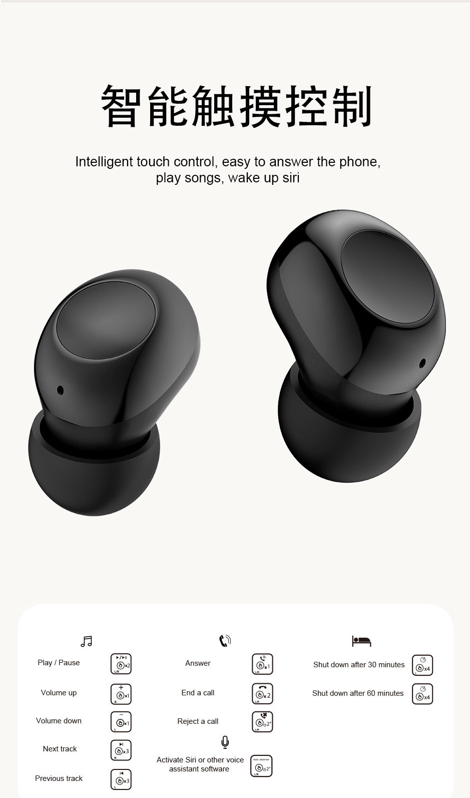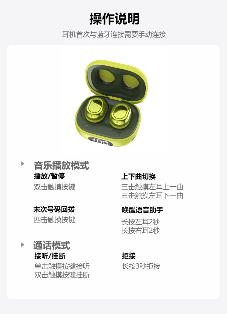 支持功能: 接、打电话/暂停/播放/上一曲/下一曲/音量+/音量-/睡眠模式
