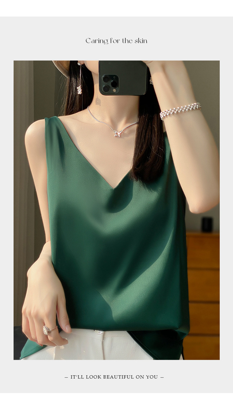 실크 실크 어깨 끈 여성 조끼 2024 여름 새로운 슬림 핏 V 넥 짧은 우아한 이너 탑 티셔츠