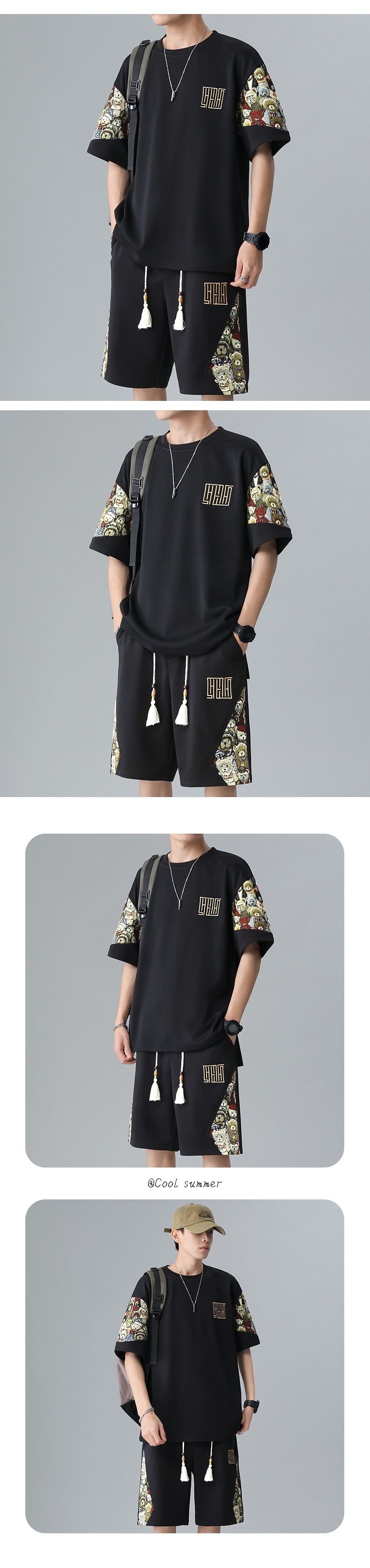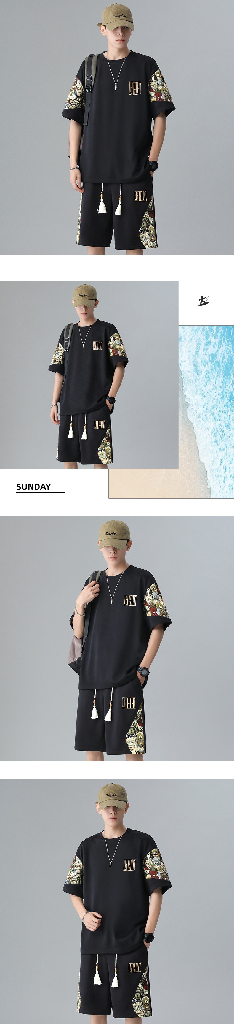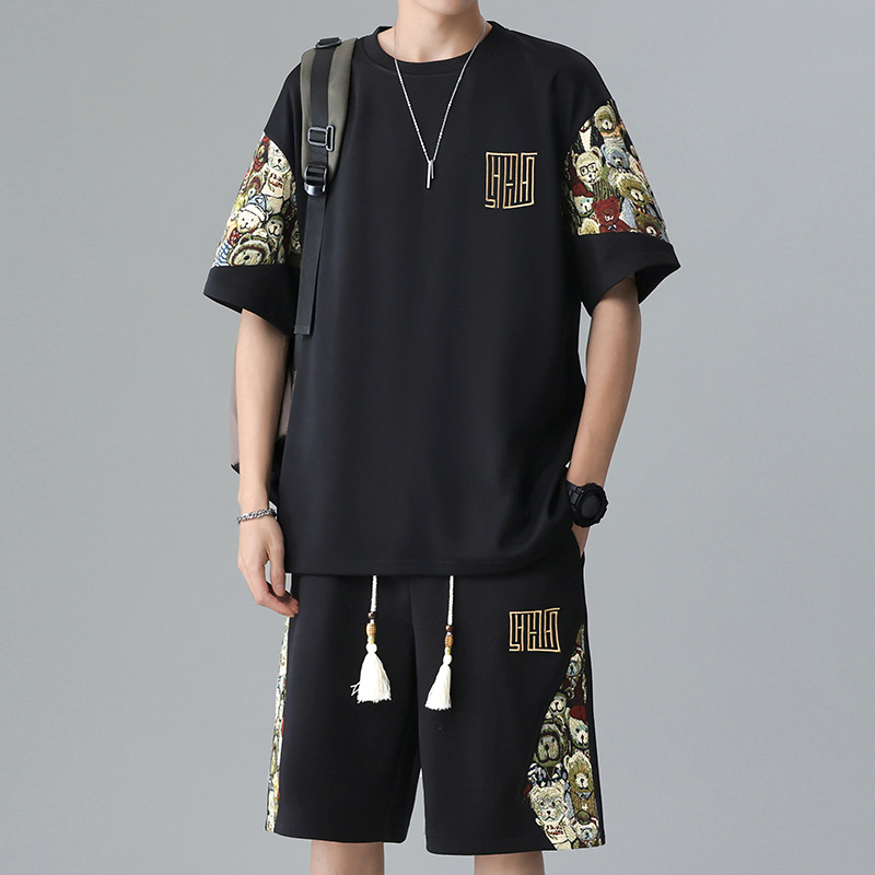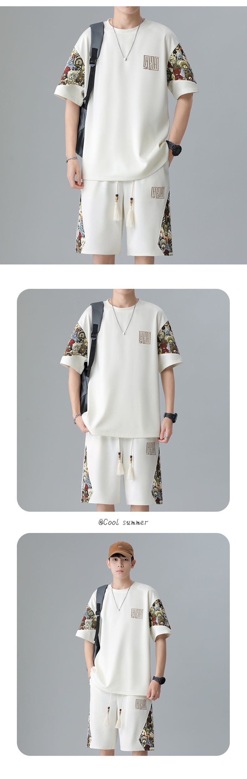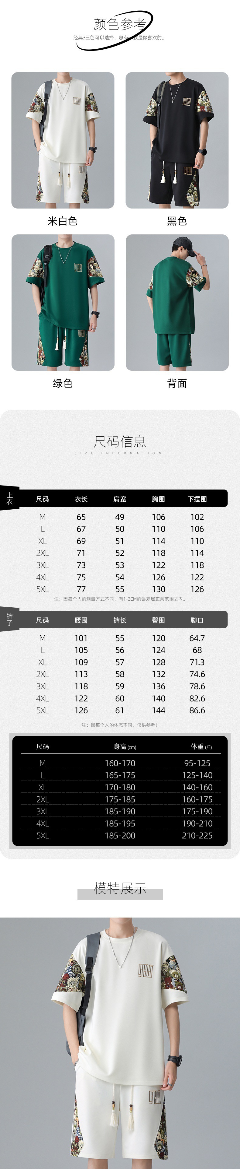 2024 여름 새로운 반팔 티셔츠 반바지 세트 남성 자수 바느질 투피스 세트 플러스 사이즈 청소년 인기 세트