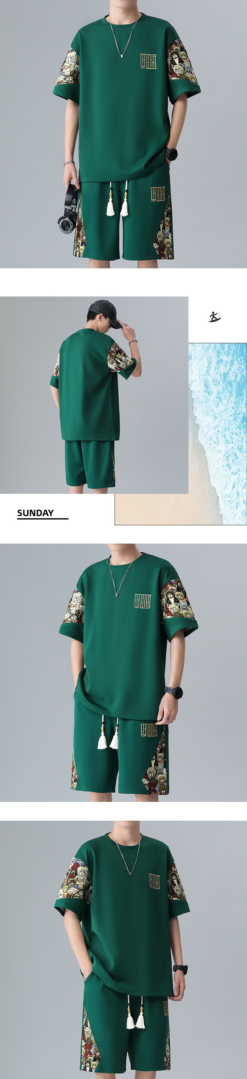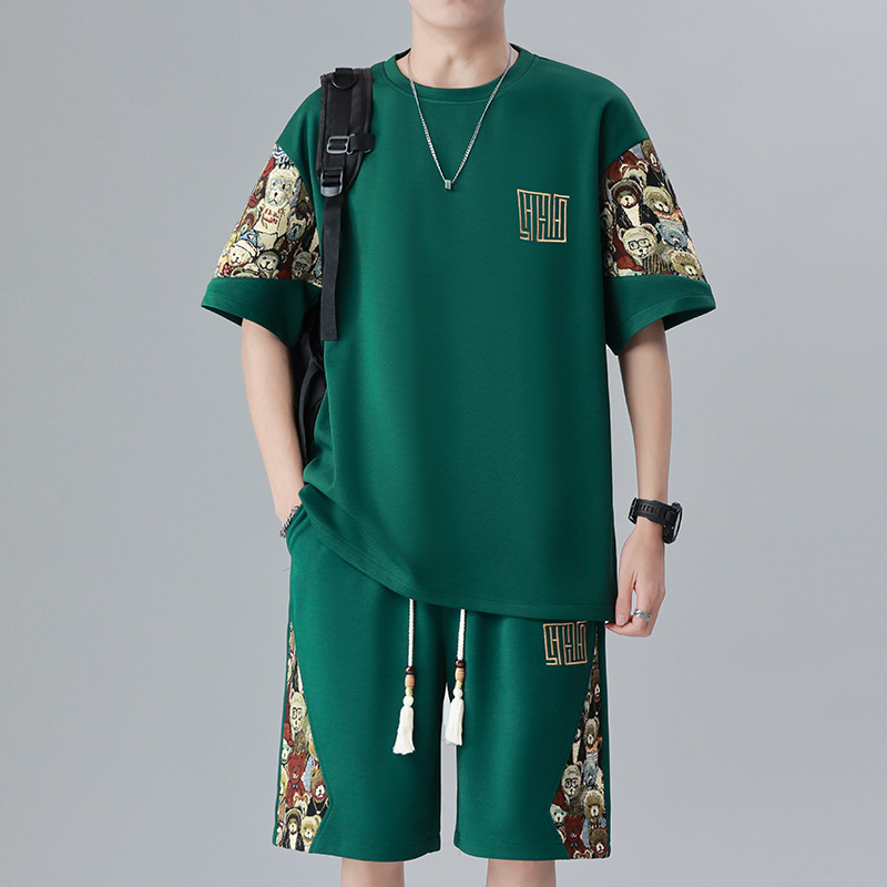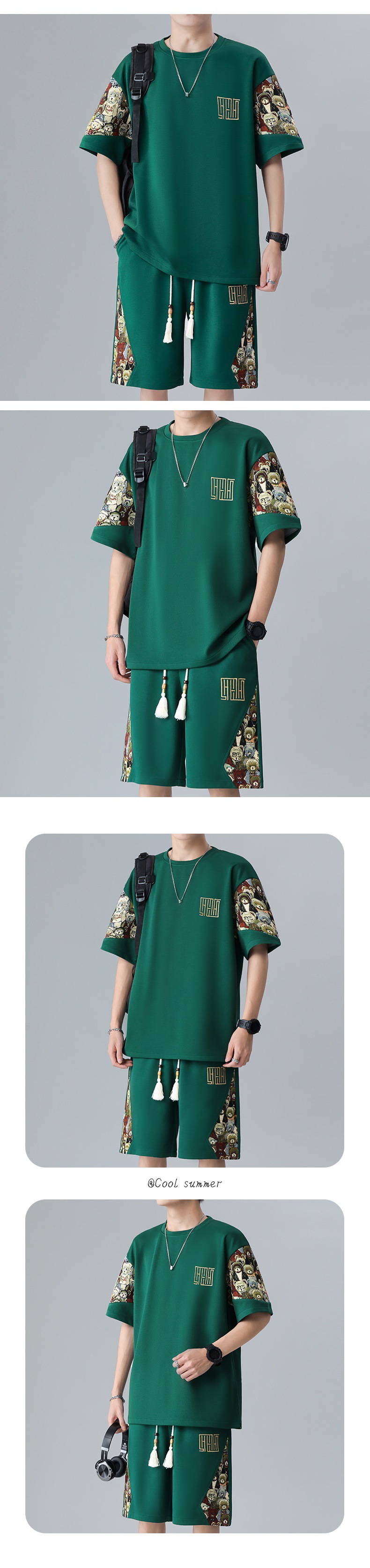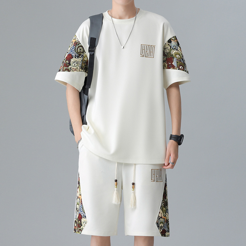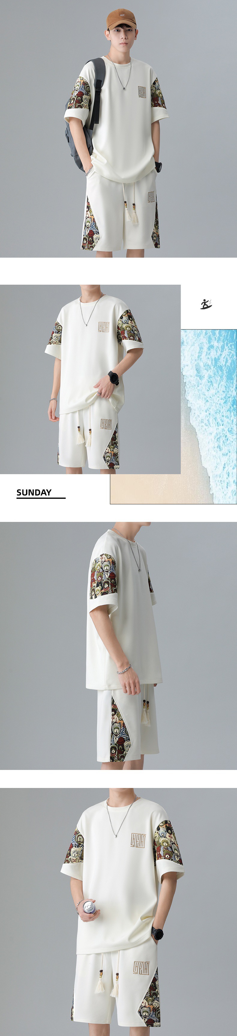 2024 여름 새로운 반팔 티셔츠 반바지 세트 남성 자수 바느질 투피스 세트 플러스 사이즈 청소년 인기 세트