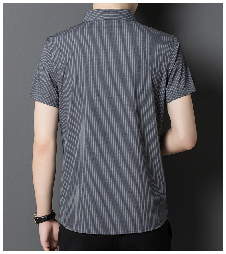 여름 아이스 실크 반팔 셔츠 무표식 남성용 비 다림질 통기성 신속 건조 옷깃 줄무늬 중년 남성 반팔 셔츠