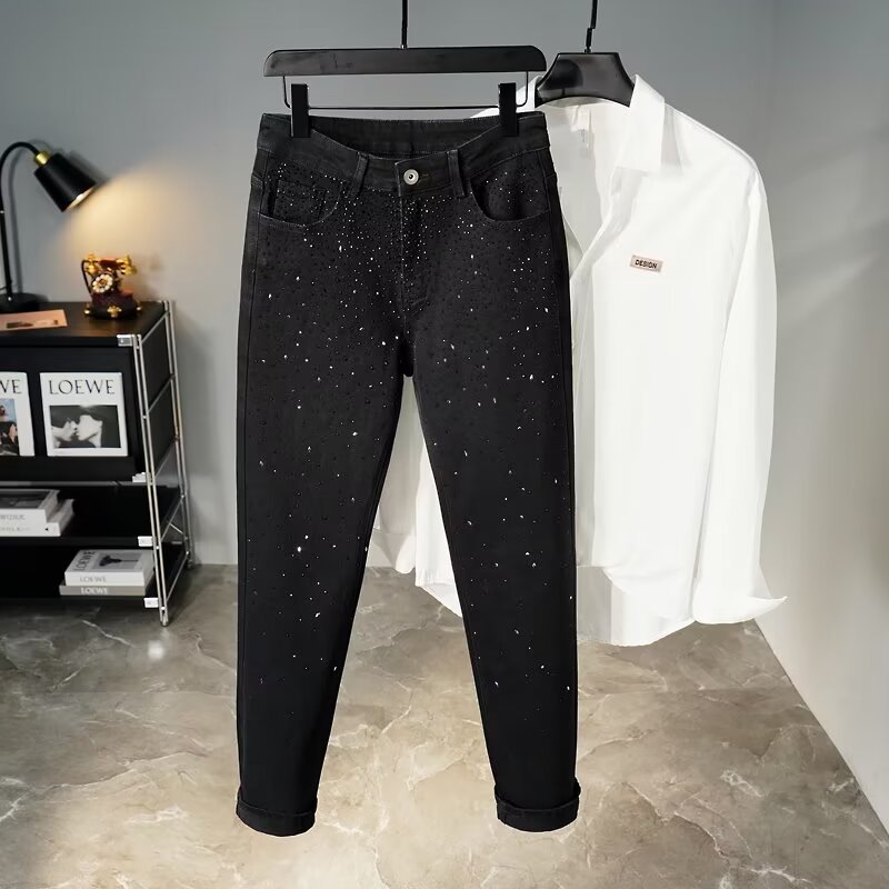 미국식 하이 스트리트 슬림 핏 청바지 인터넷-유명한 Gymnopus Rhinestone Black All-match Small Foot Men's Trendy Brand Starry Sky Pants