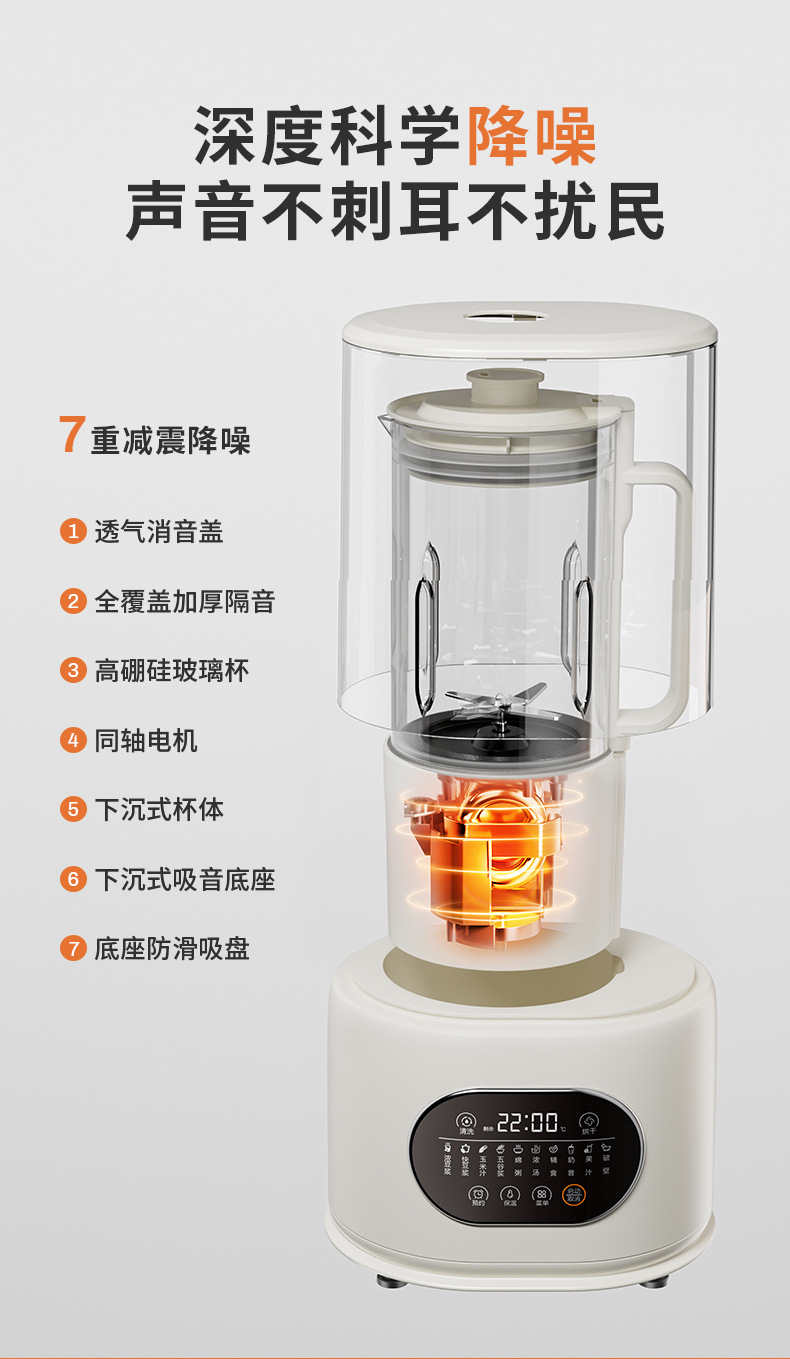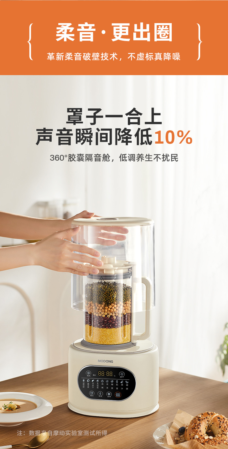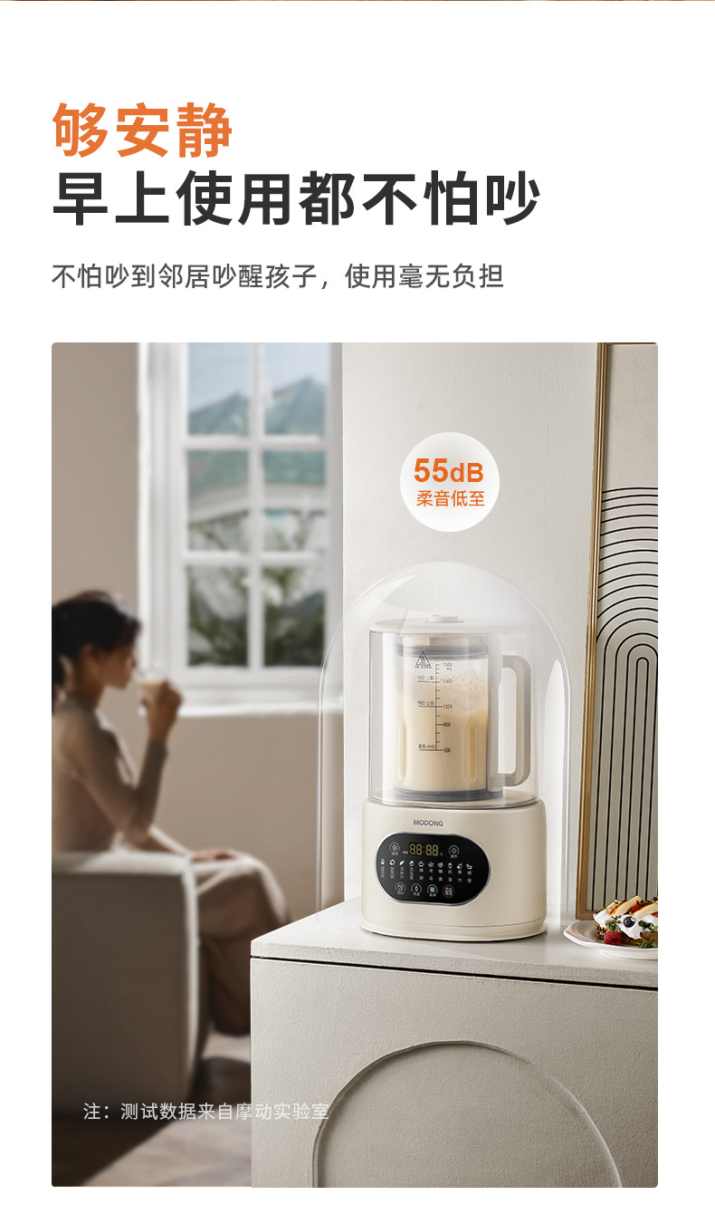 3.6重降噪,声音低至55dB左右(有证书)。密闭隔音罩,有效隔绝大量破壁时的声音;底部降噪风道,既能降低噪音也能快速散热