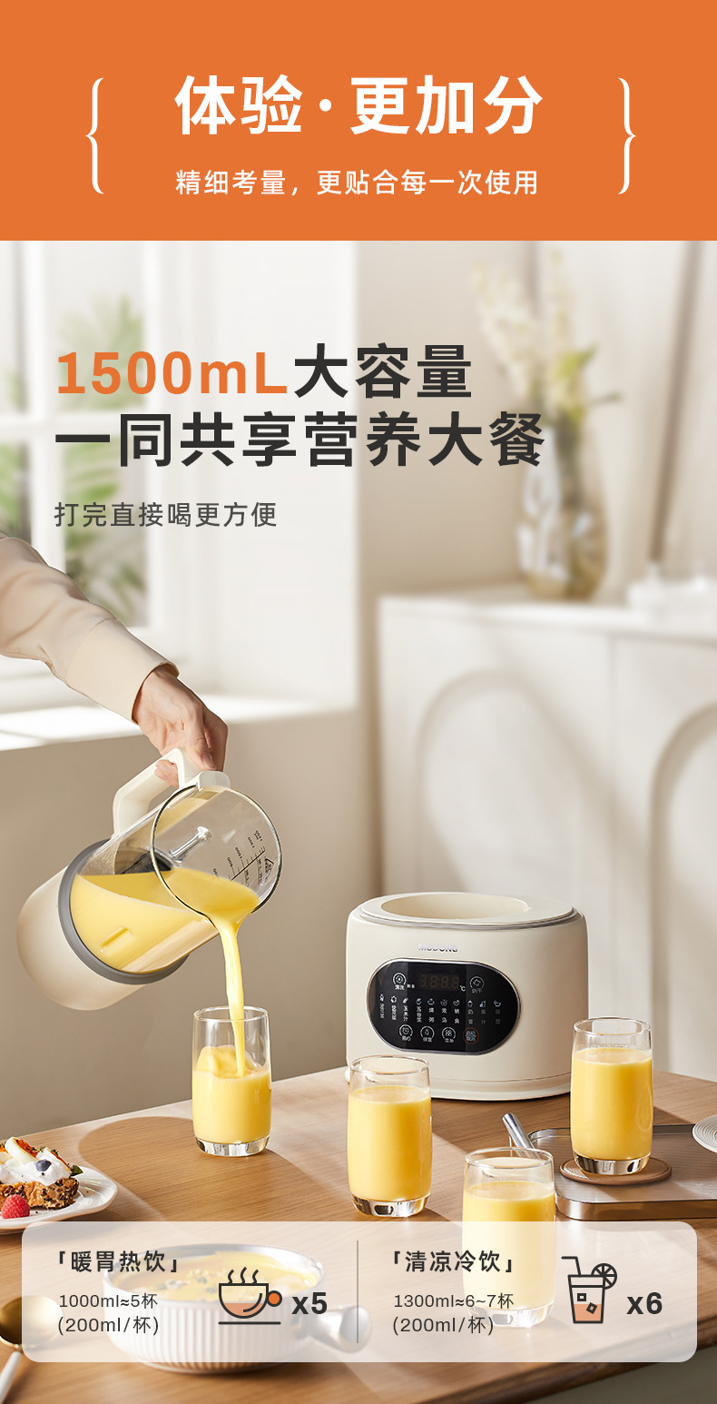 2.小机身大容量,冷饮上限1500ml可做约7杯,热饮1200ml可做约6杯(200ml杯),满足一家人的胃口