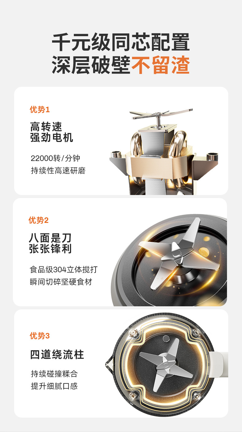 6.21000转数,食品级304八叶精钢刀头,3D立体搅打,刀锋交错设计,破壁更细腻
