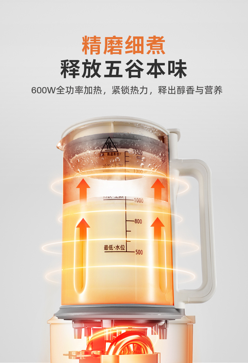 7.600W加热功率,高转速电机,快速粉碎食材,黄豆免泡直煮,立体环绕加热