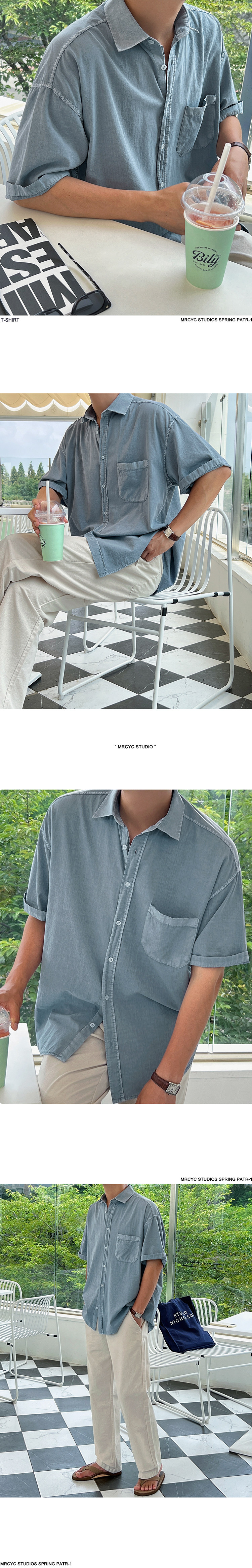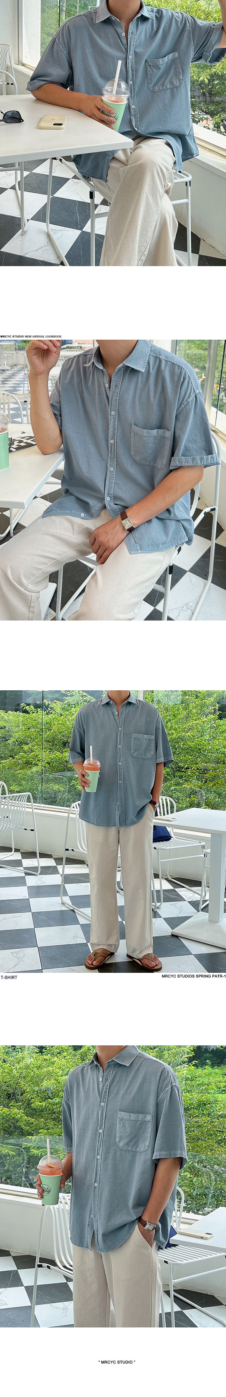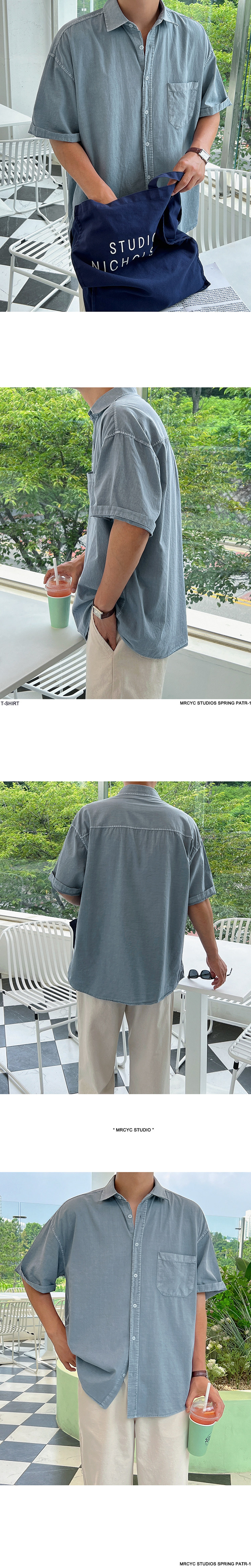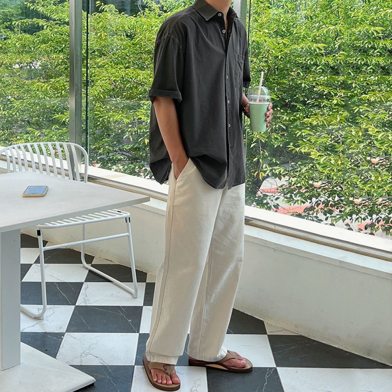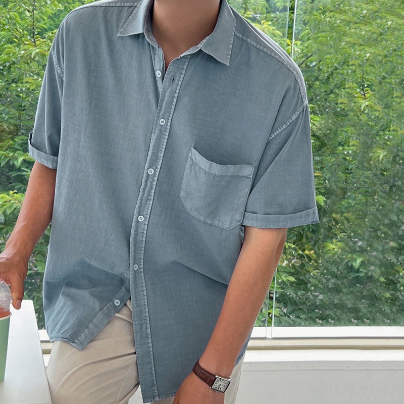 MYQ 심플 솔리드 컬러 반팔 셔츠 남성 여름 루즈 캐주얼 셔츠 한국 스타일 트렌디 라펠 반팔 탑스토어 가기