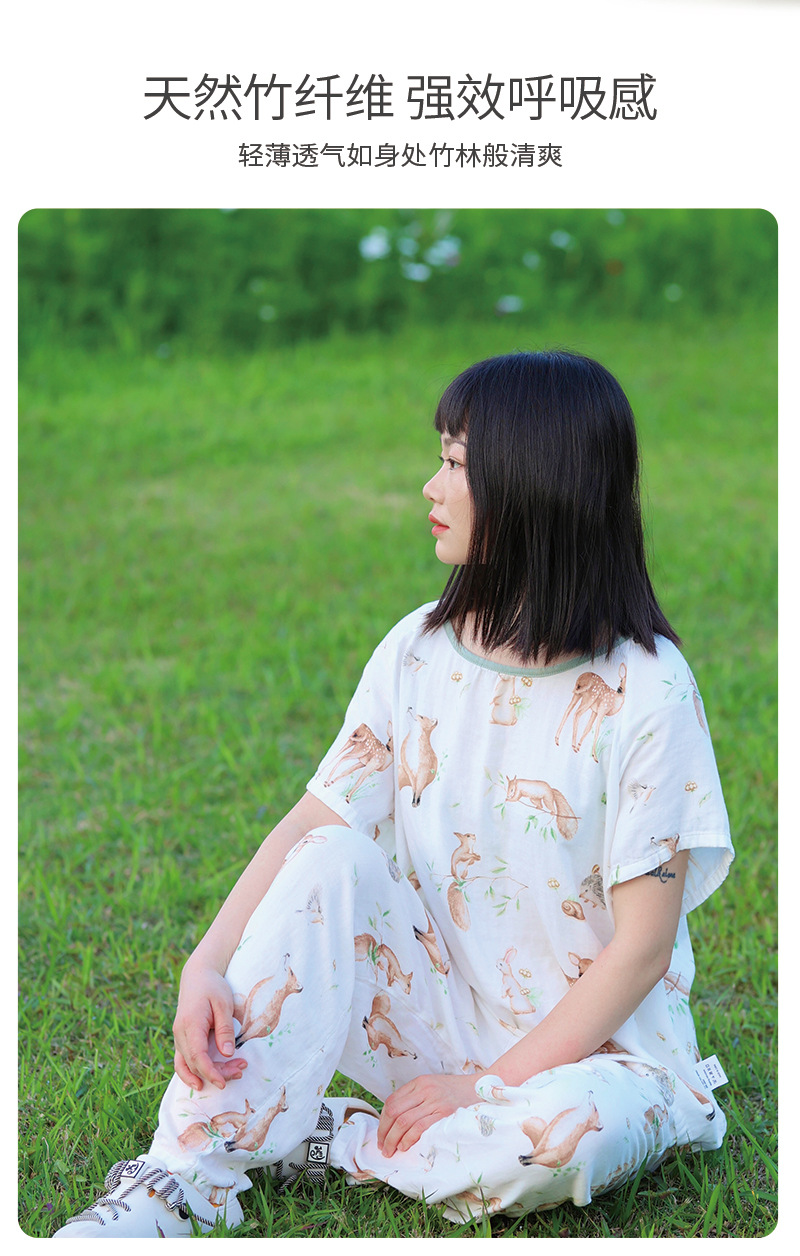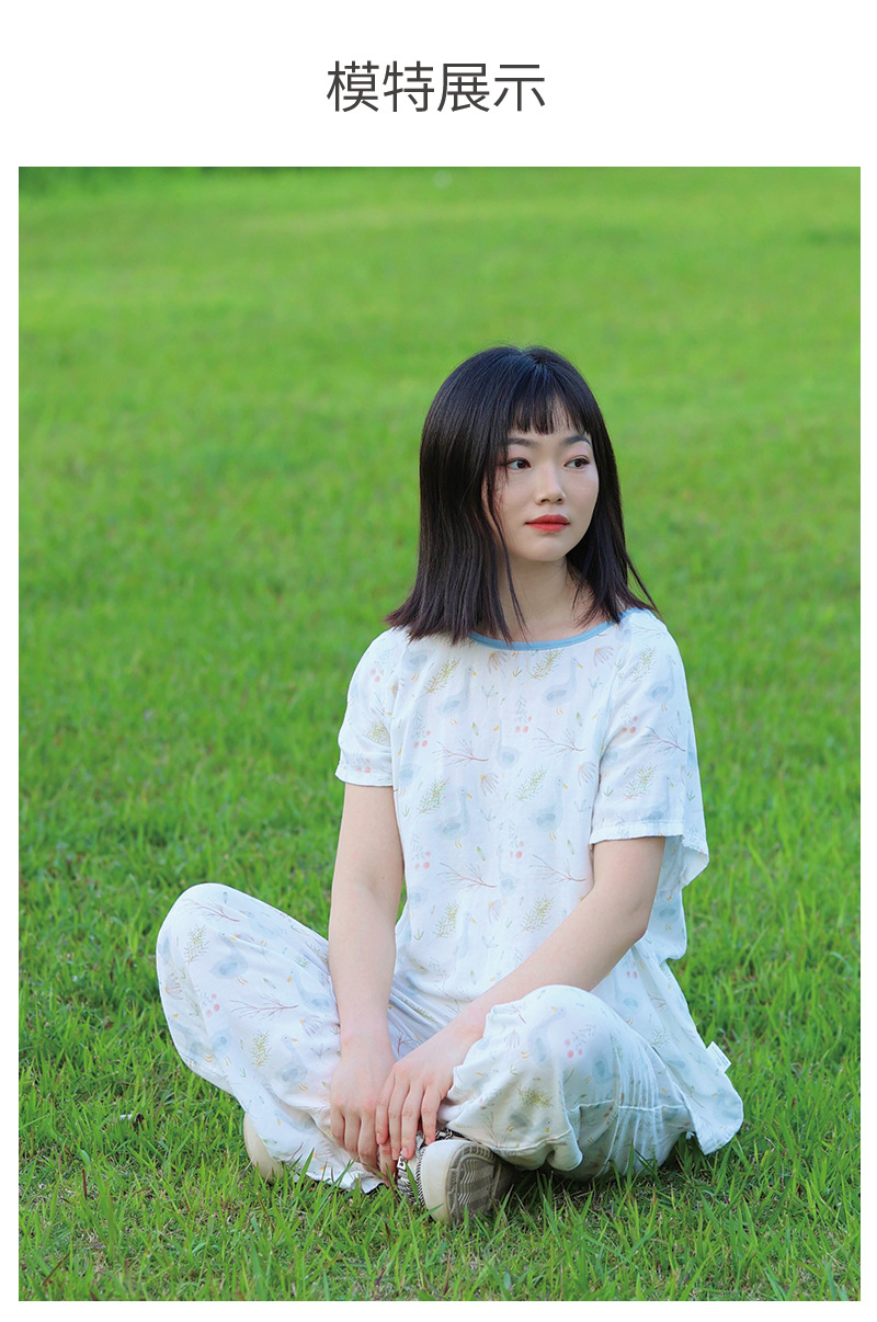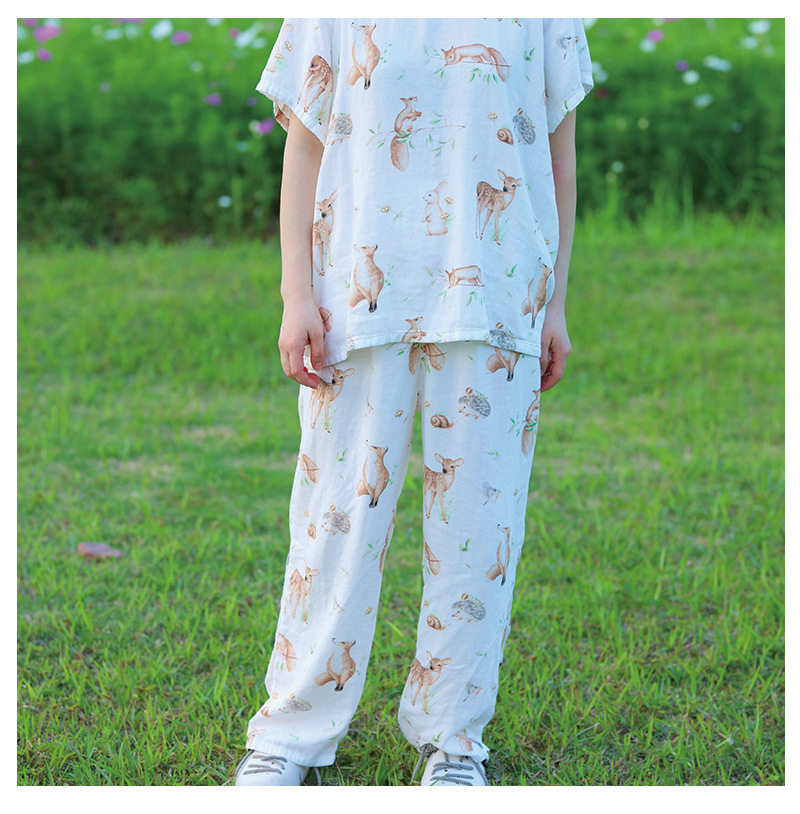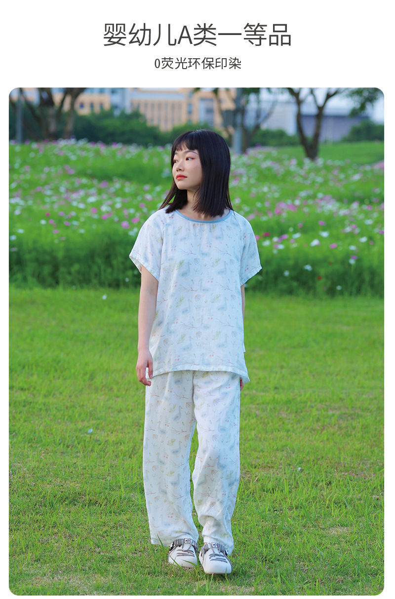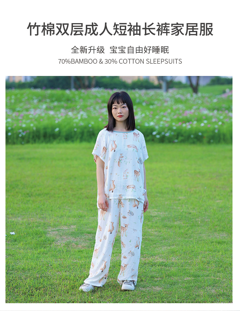 여성용 여름 홈 의류 반팔 바지 에어컨 룸 파자마 더블 레이어 대나무 코튼 거즈 홈 의류 얇은 세트스토어 가기