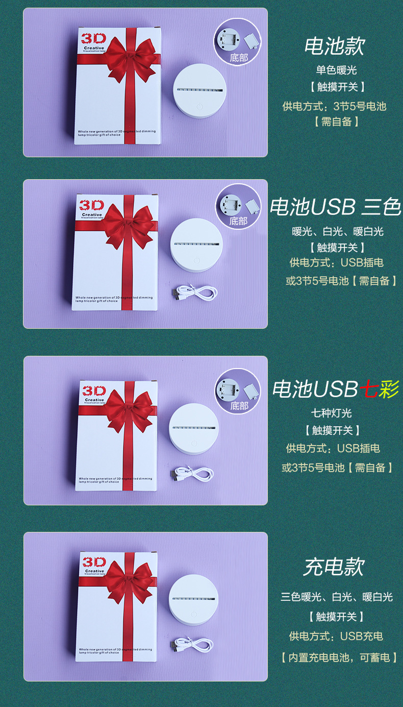 USB七彩充电款:七彩光,触摸开关内置锂电池+USB插电】只有此款有蓄电功能。