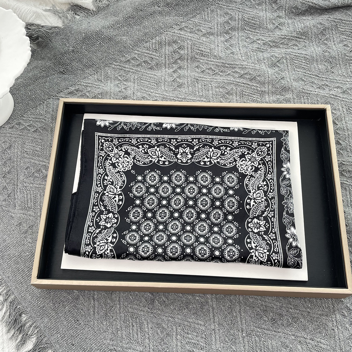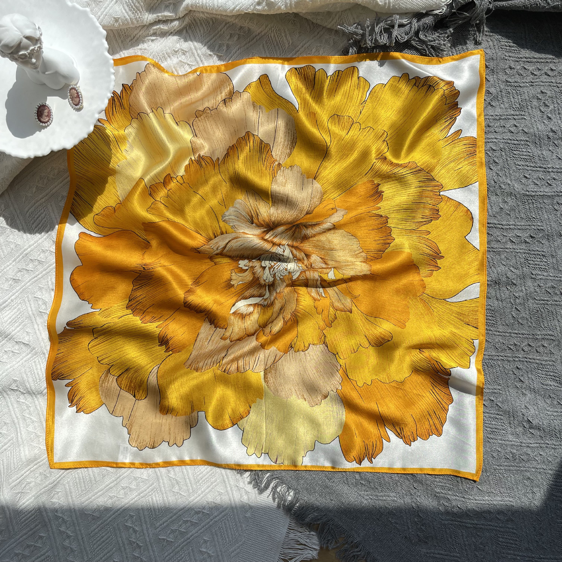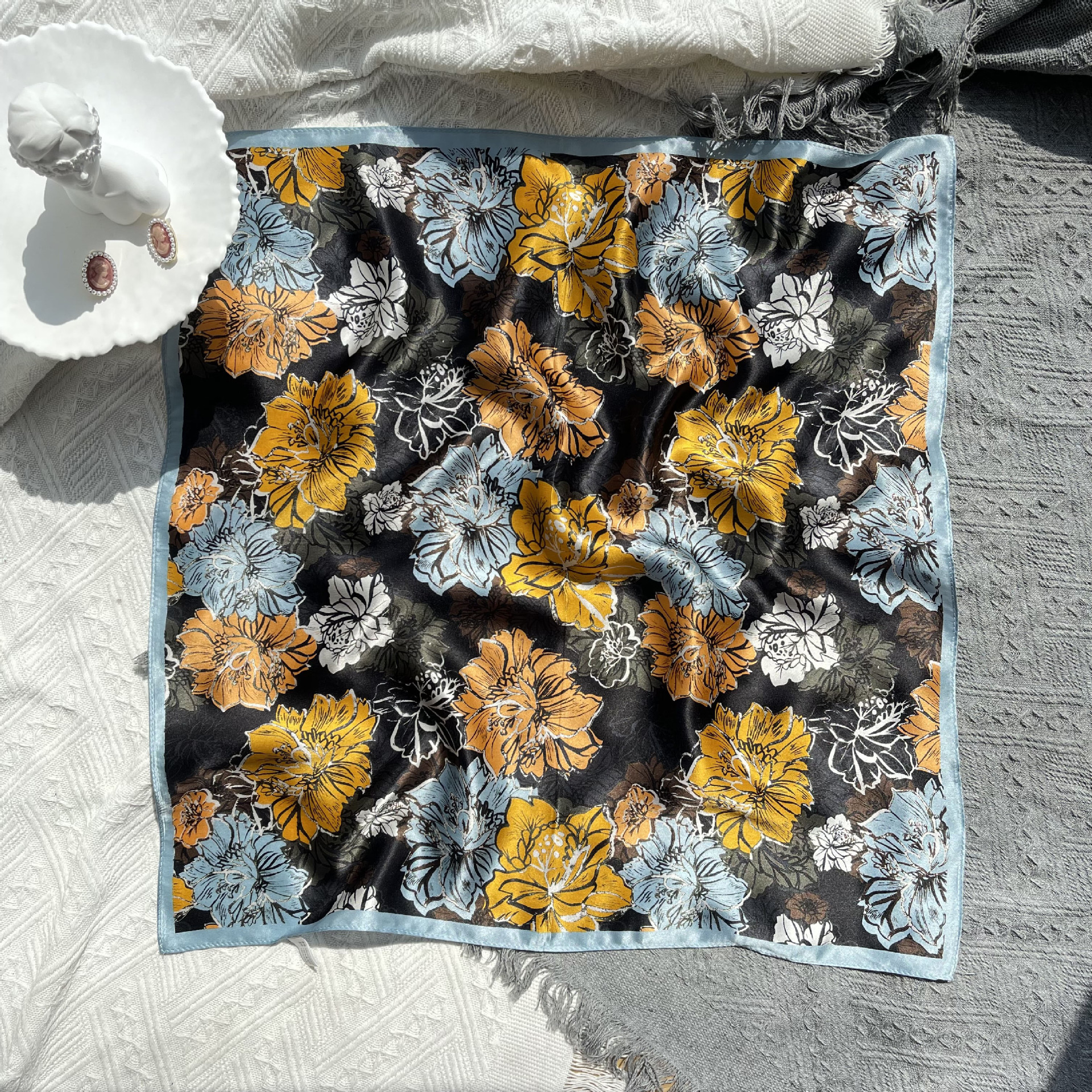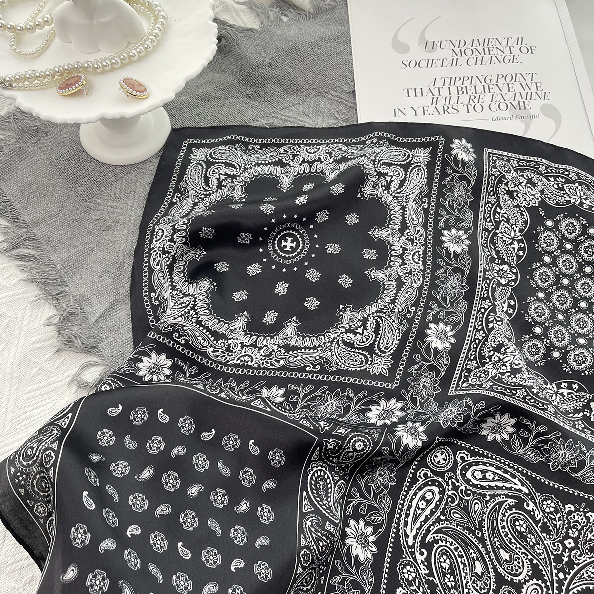 25년 신상 블랙 캐슈 플라워 실크 스카프 여성용 여름 자외선 차단 53cm 스몰 스카프 고급스러운 패션 스카프스토어 가기