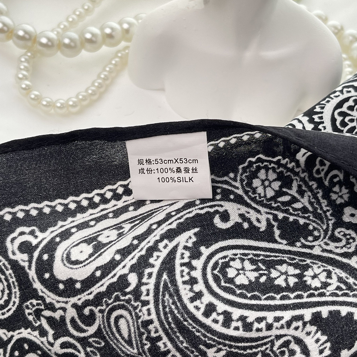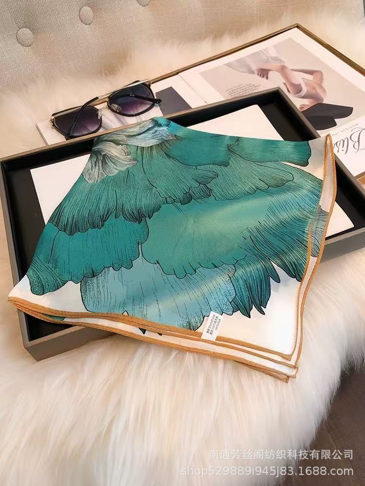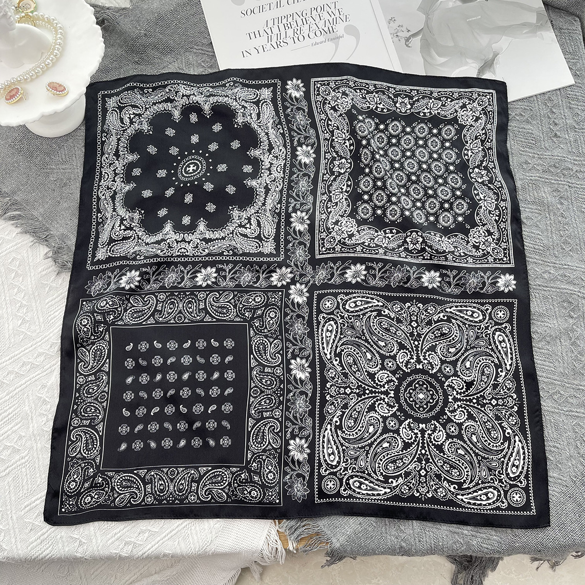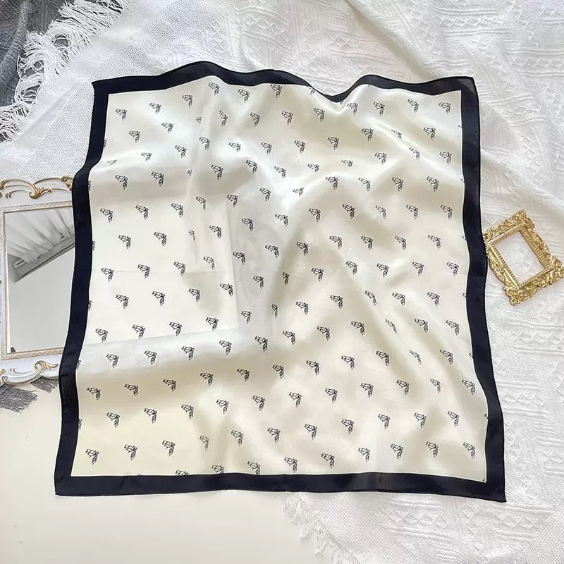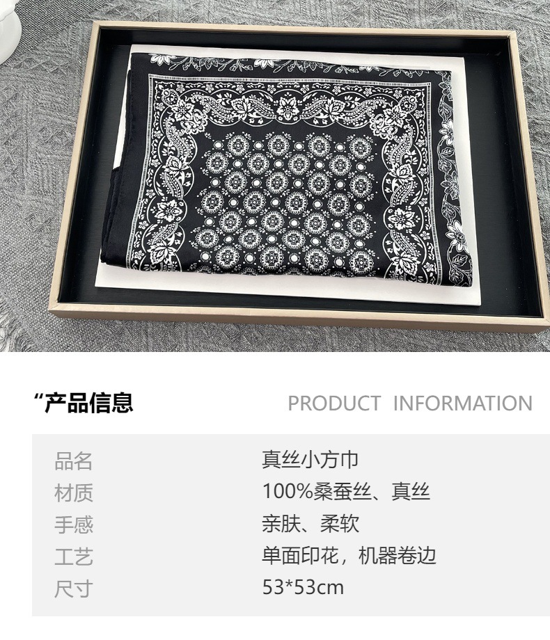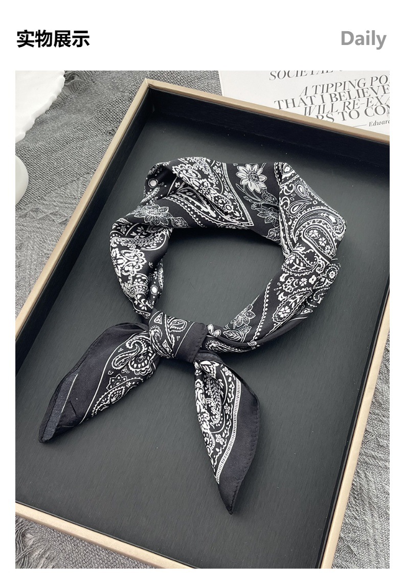 25년 신상 블랙 캐슈 플라워 실크 스카프 여성용 여름 자외선 차단 53cm 스몰 스카프 고급스러운 패션 스카프