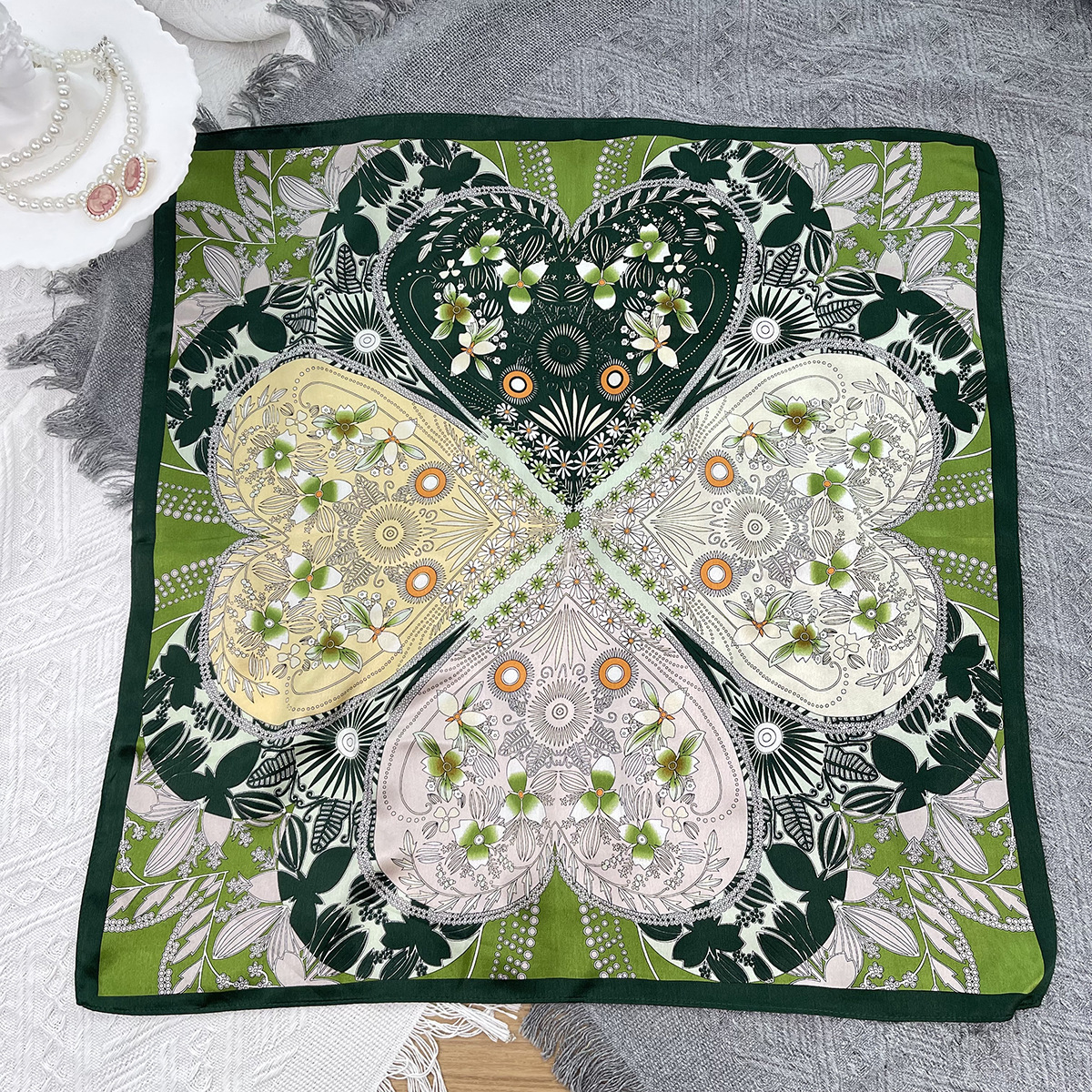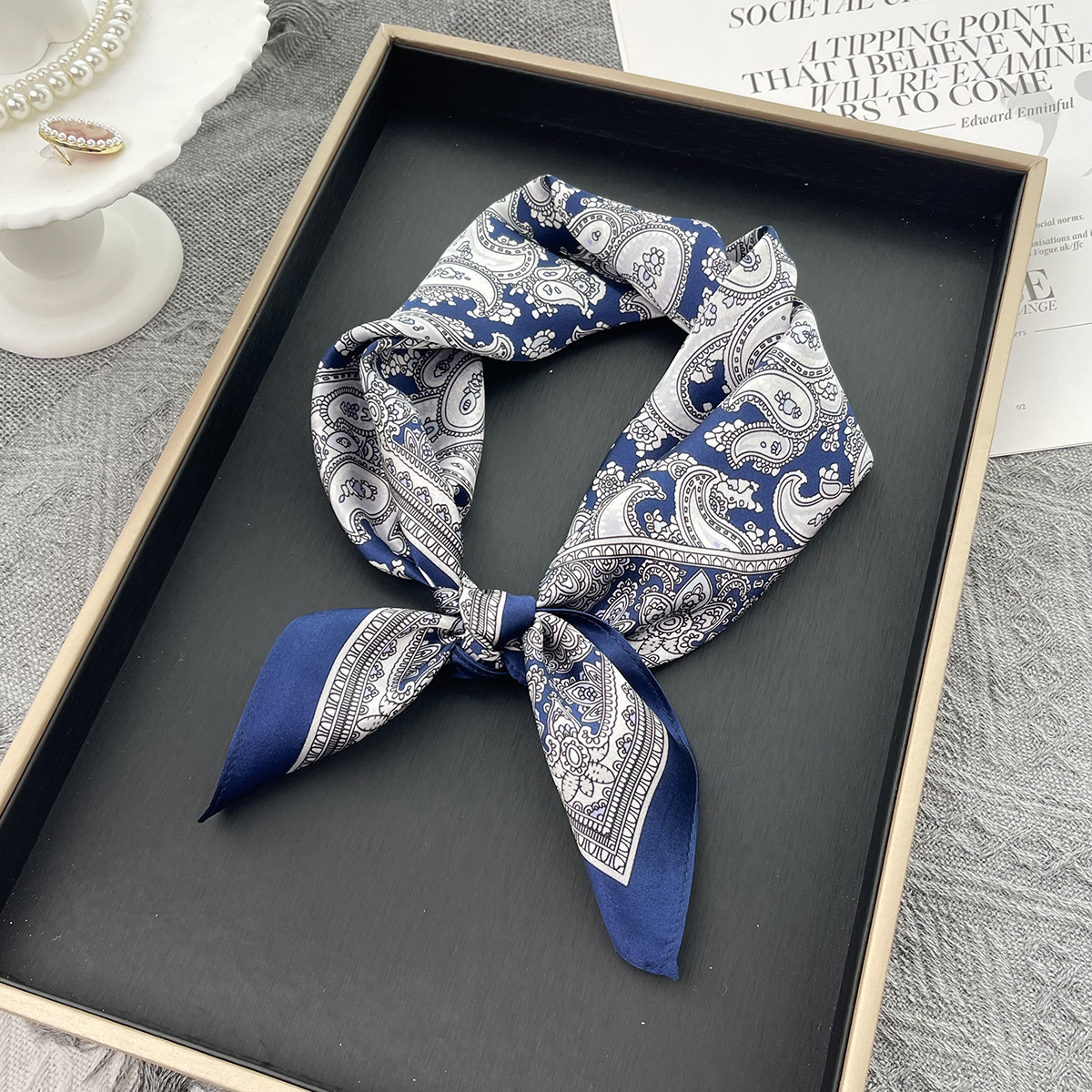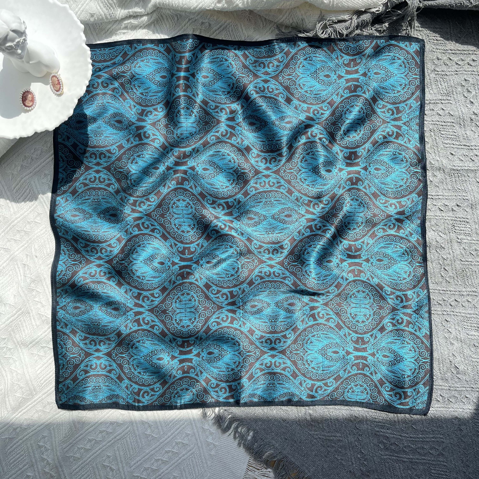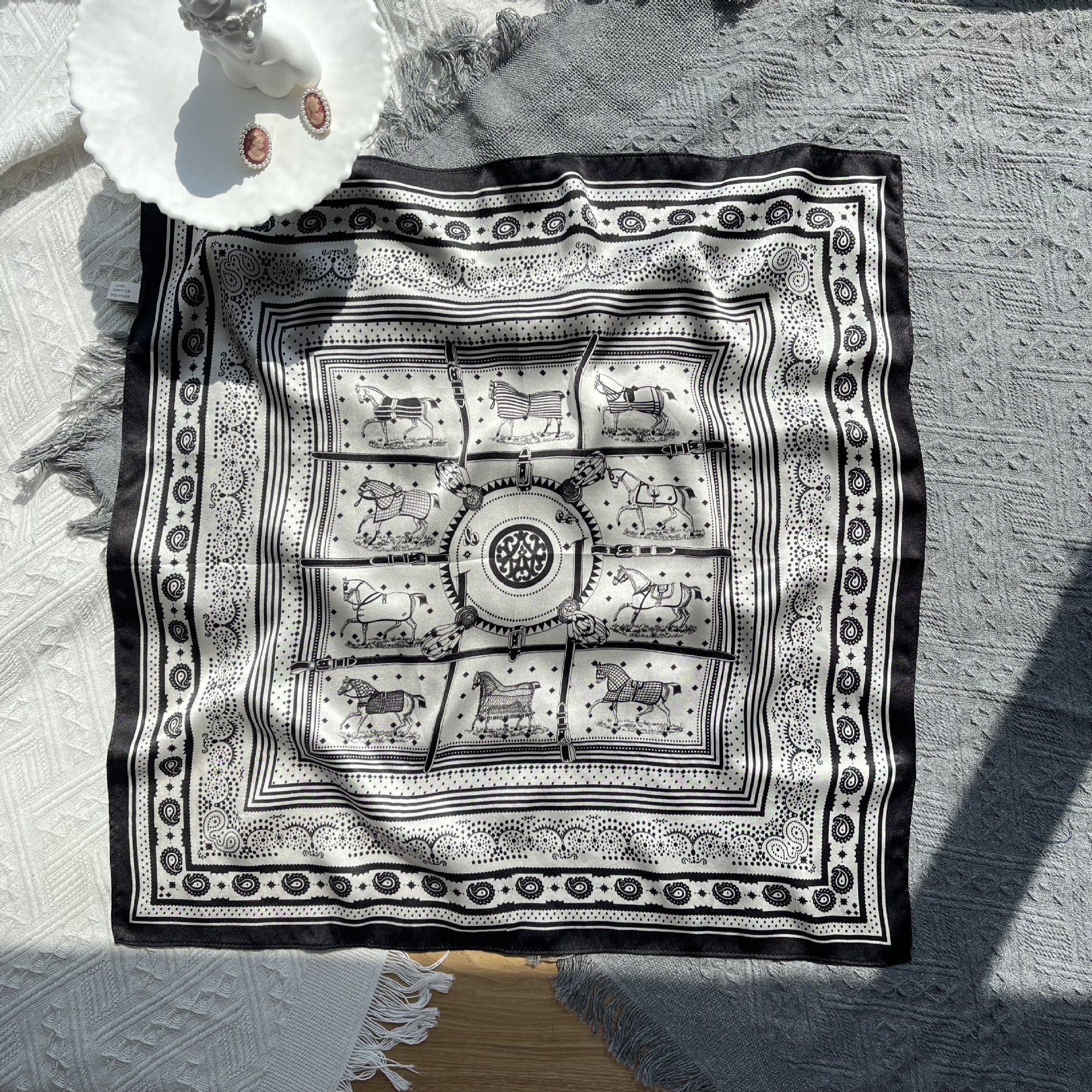 25년 신상 블랙 캐슈 플라워 실크 스카프 여성용 여름 자외선 차단 53cm 스몰 스카프 고급스러운 패션 스카프