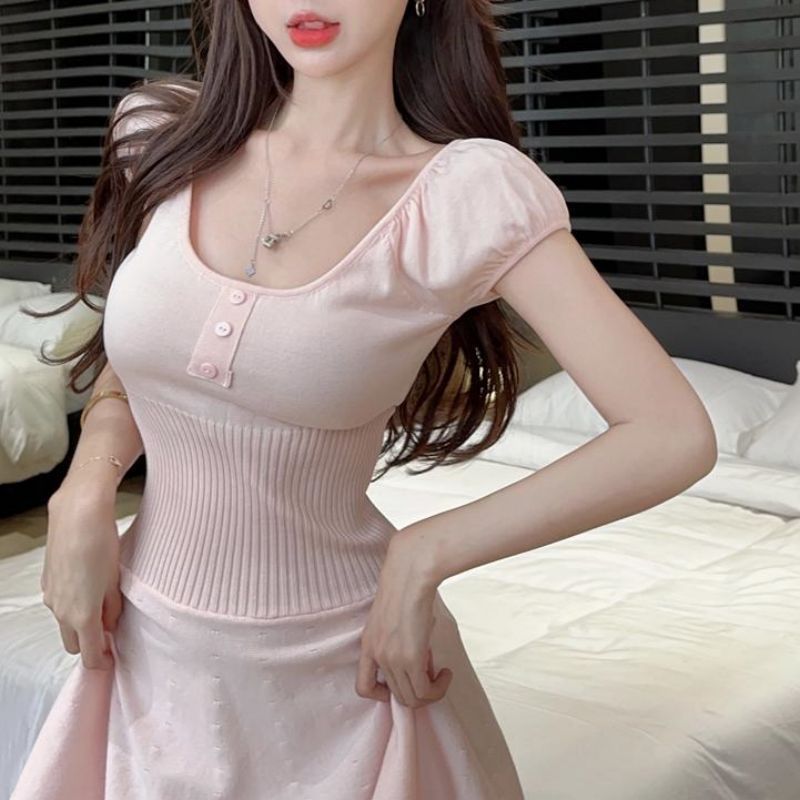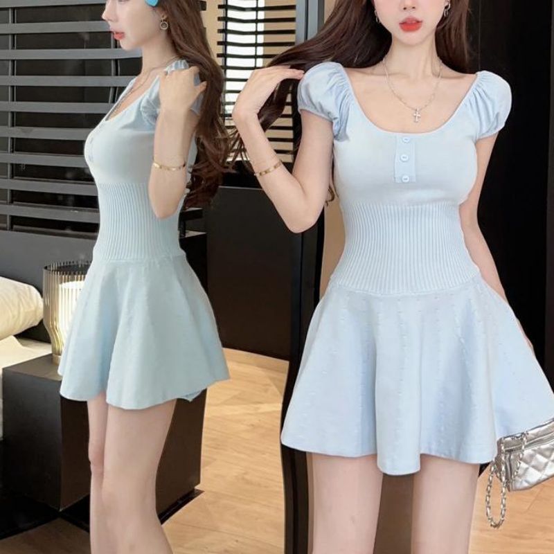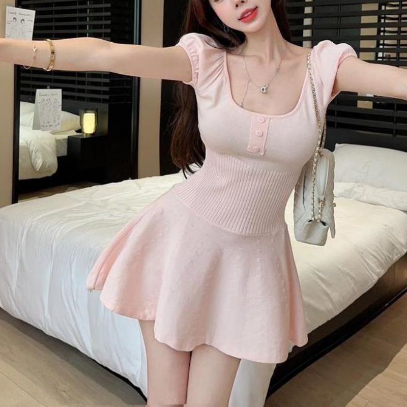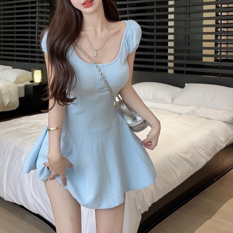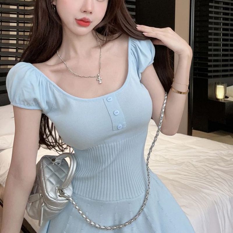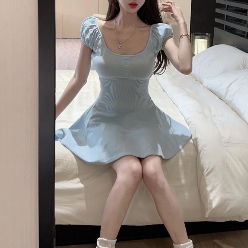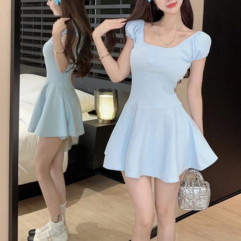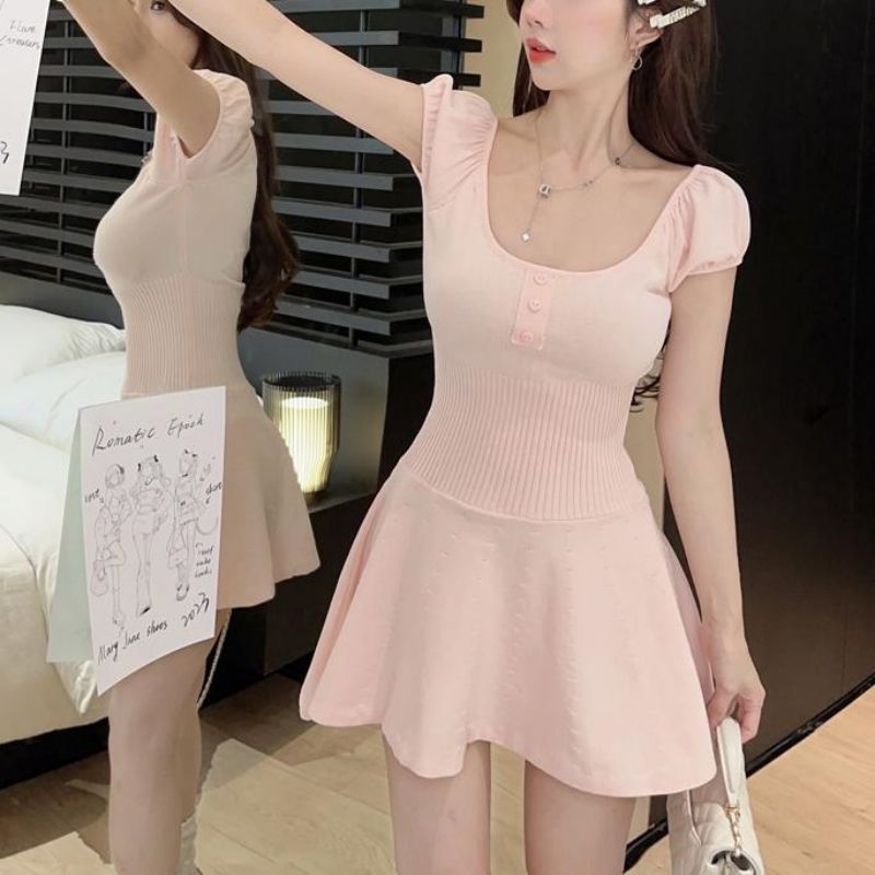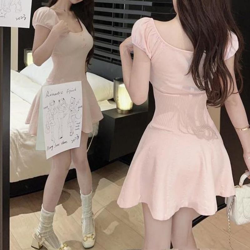 부드러운 스타일 기질 스퀘어 칼라 슬림 핏 원피스 여성 달콤한 첫사랑 여름 압박 슬리밍 기질 A 라인 짧은 치마