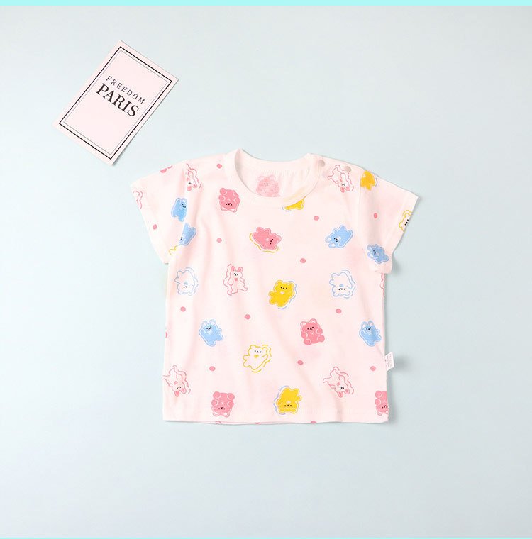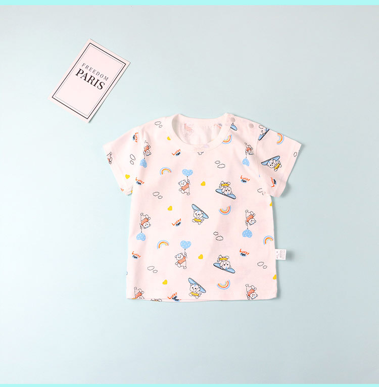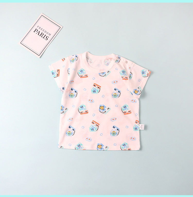 아기의 최고 여름 얇은 순수한 아기 0-3 세 크루 넥 어깨 버클 반팔 티셔츠 면 남자와 여자 아이들의 반소매 옷스토어 가기