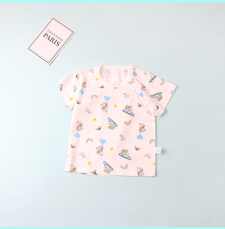 아기의 최고 여름 얇은 순수한 아기 0-3 세 크루 넥 어깨 버클 반팔 티셔츠 면 남자와 여자 아이들의 반소매 옷