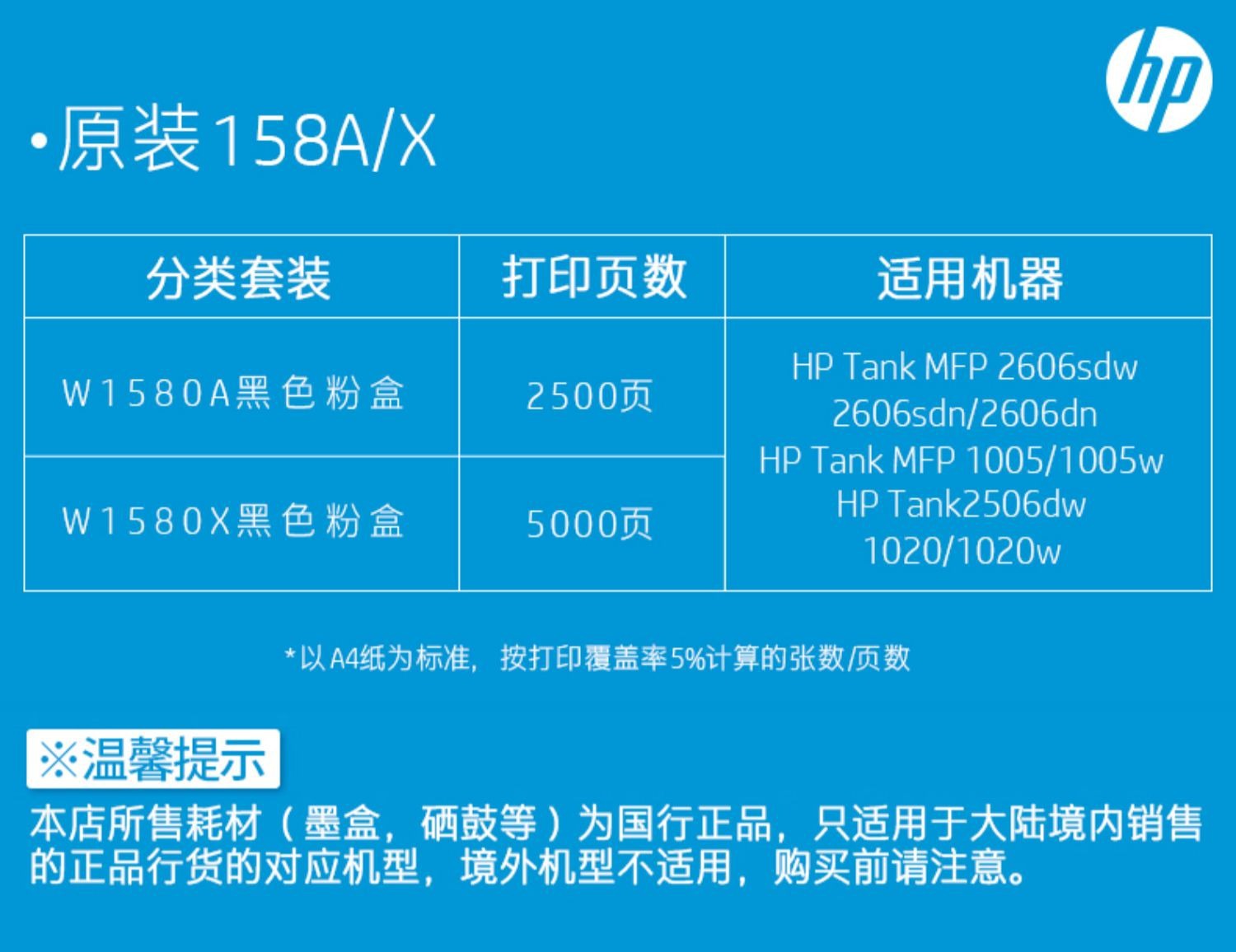 HP 원래 158X 대용량 토너 카트리지 W1580A 지능형 플래시 카트리지 블랙 2606sdw Tank1005