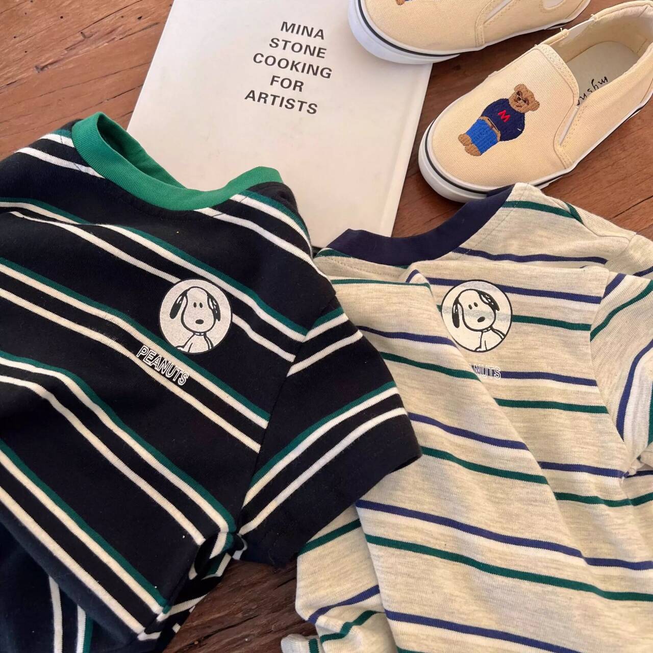 한국 스타일 소년 여름 새로운 스타일 2025 만화 패턴 티셔츠 어린이 줄무늬 반팔 탑 유행 아기 소년 트렌드스토어 가기