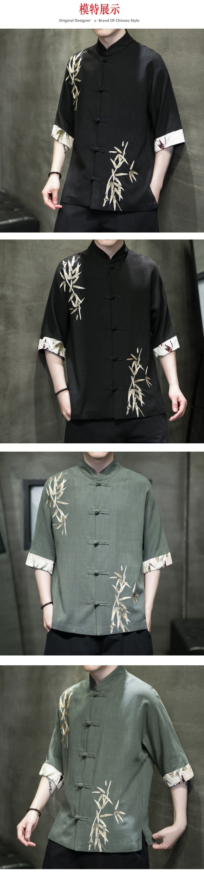 여름 새로운 중국 리넨 버클 5 점 소매 셔츠 대나무 잎 자수 바느질 고대 옷 셔츠 남자의 탑
