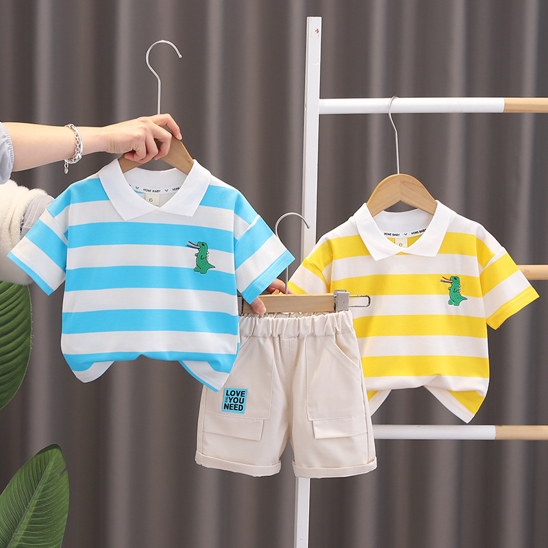 여름 서양식 아기 투피스 세트 소년 새로운 여름 잘 생긴 얇은 줄무늬 무지개 공룡 반팔 세트 쿨