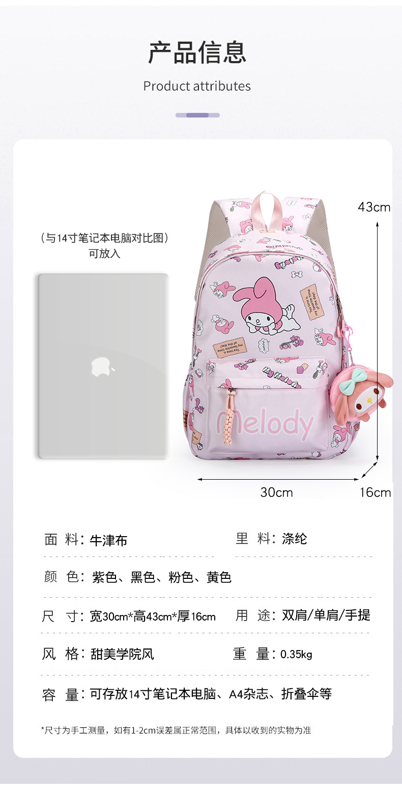 산리오 새로운 어린이 학교 가방 유치원 배낭 만화 귀여운 패션 가방 인쇄 2024 캐주얼