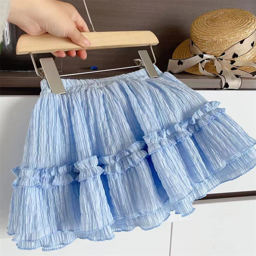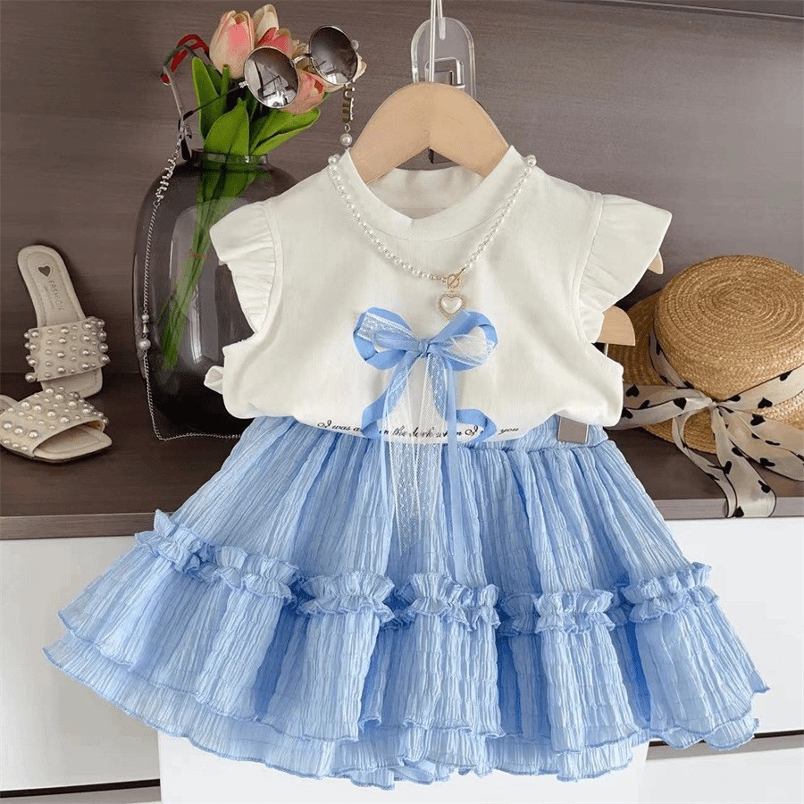 새로운 여자 여름 정장 2025 새로운 유행 활 비행 소매 티셔츠 케이크 스커트 중소 어린이를위한 투피스 세트