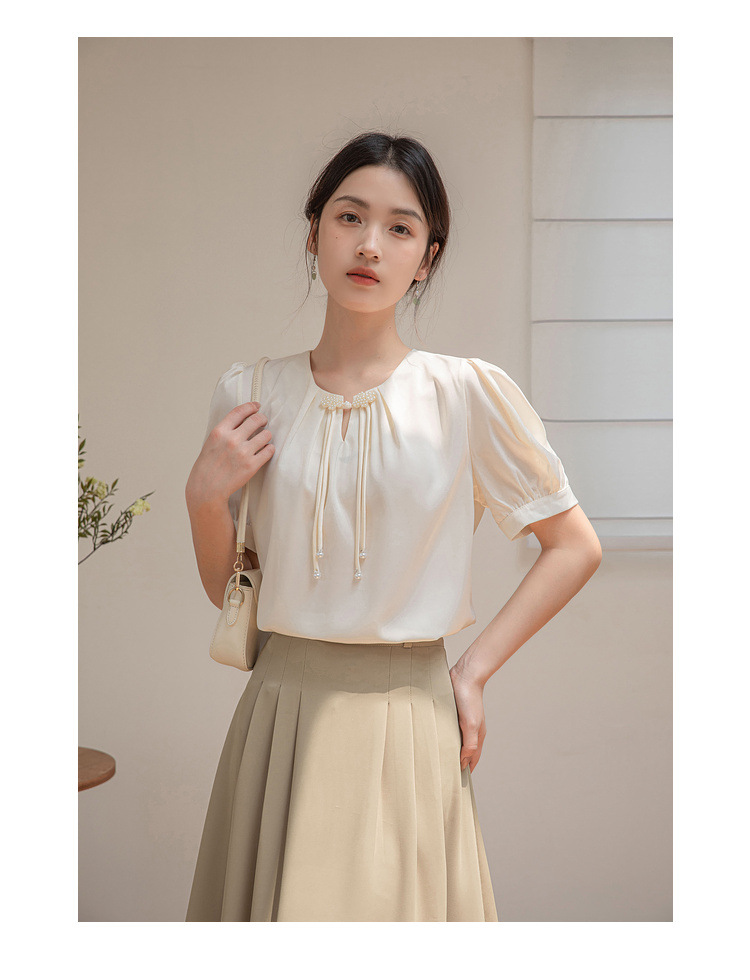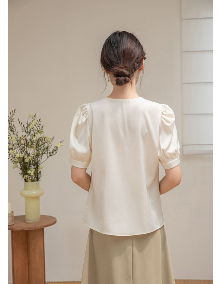 레트로 새로운 중국 버튼 짧은 소매 셔츠 여름 새로운 국가 스타일 V 옷깃 새틴 통근 전문 셔츠 도매
