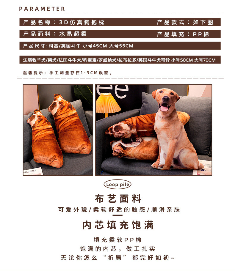 재미있는 3D 시뮬레이션 개 베개 차이 개 불독 봉제 장난감 래브라도 인형 장식품 인형스토어 가기