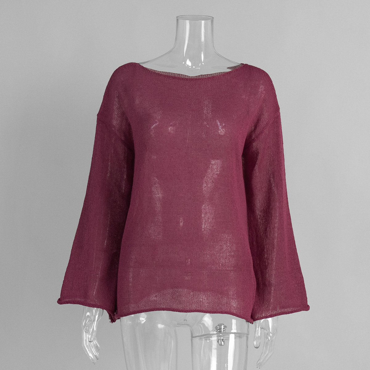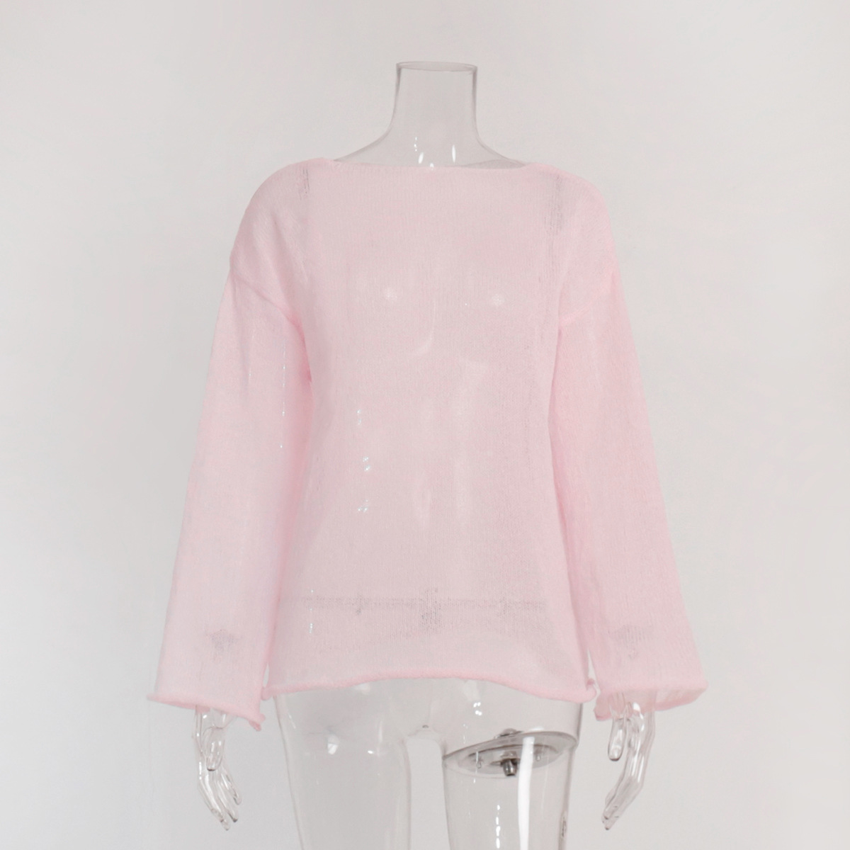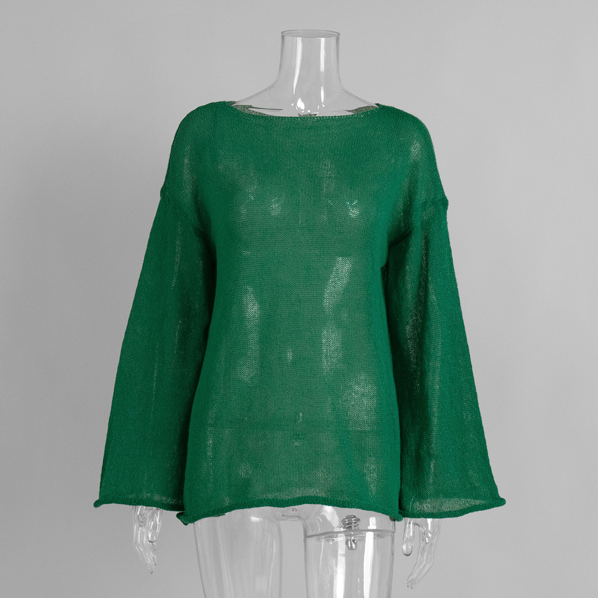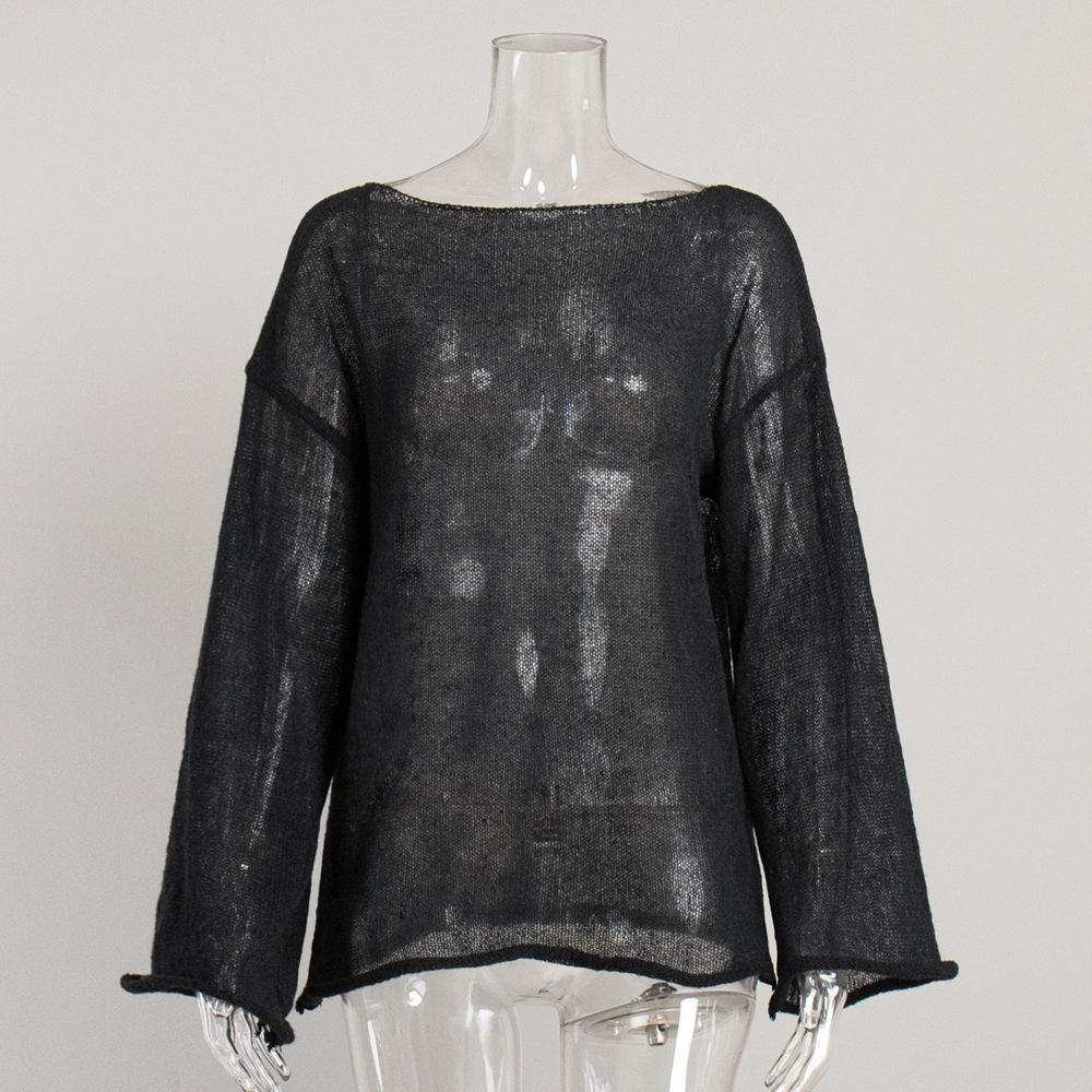 크로스보더 중공 스웨터 유럽과 미국 2025 봄 여름 신작 여성용 시스루 얇은 대형 라운드 넥 벨 슬리브 니트 티셔츠스토어 가기