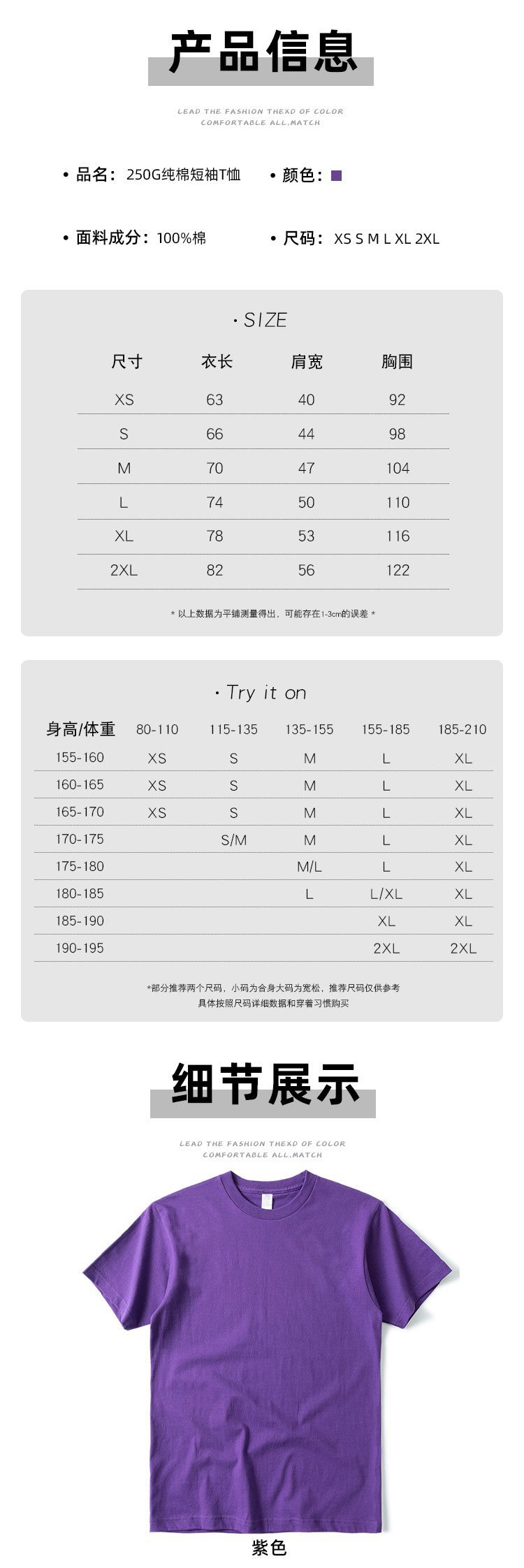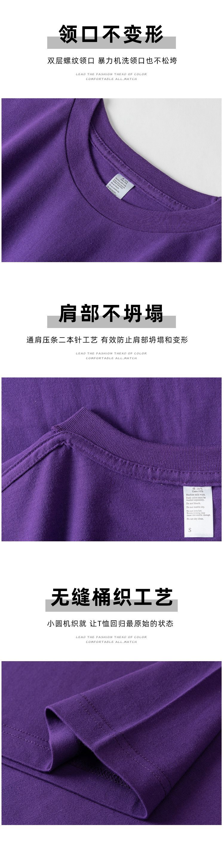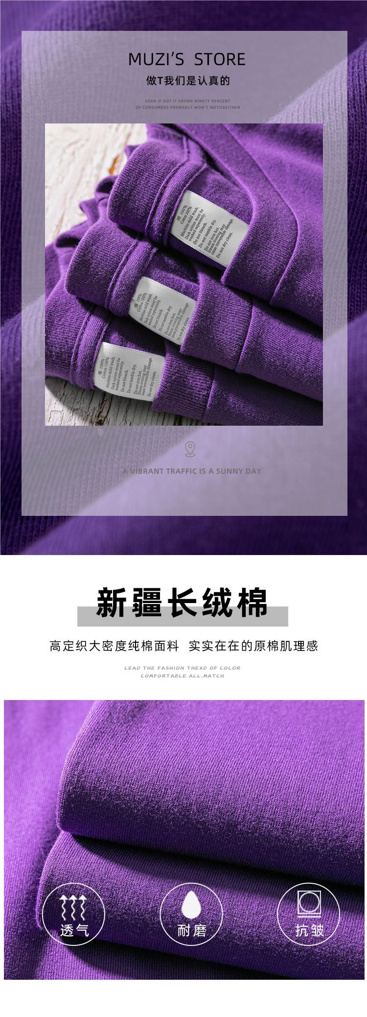 포도 보라색 250g 무거운 신장 면 부드러운 원활한 짧은 소매 티셔츠 단색 질감 남성과 여성을위한 간단한 티셔츠스토어 가기