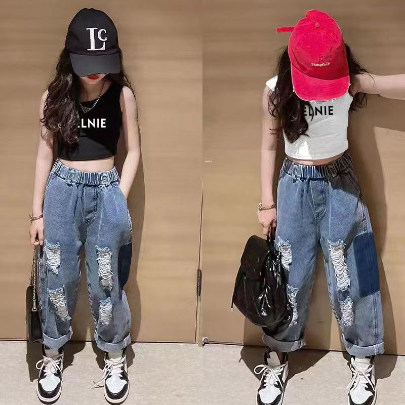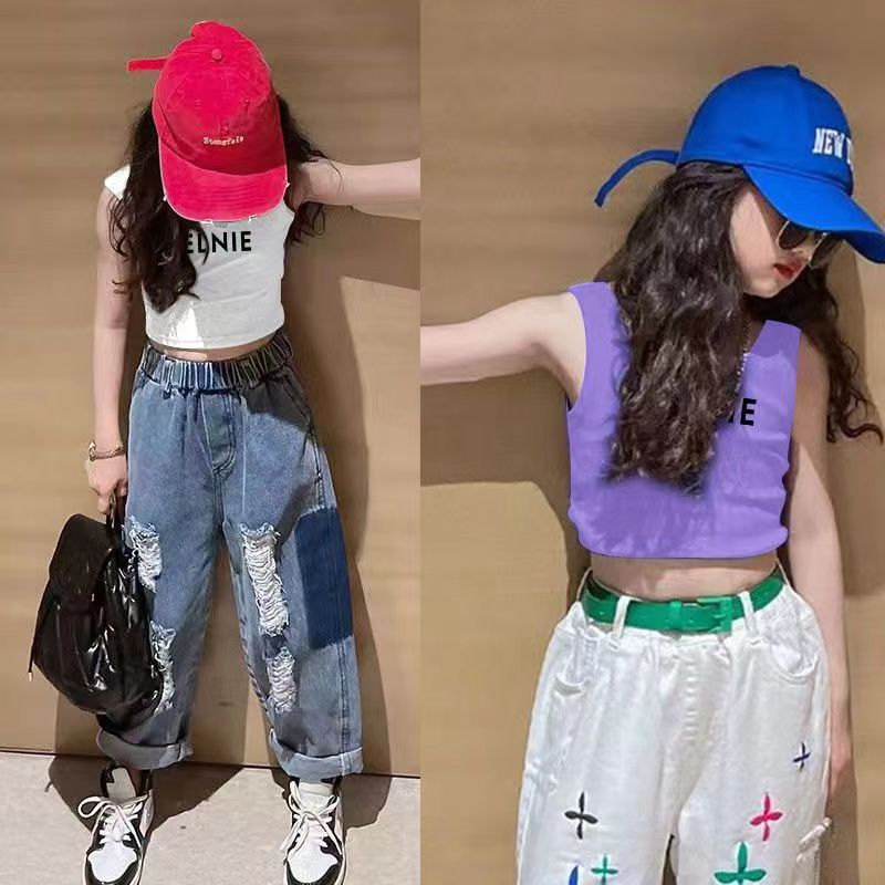 여름 여아 상의, 새로운 한국식 조끼, 짧은 스타일, 중소형 아동용 신축성 있는 멜빵, 배꼽 노출, 하의 셔츠, 인터넷 연예인 스타일스토어 가기
