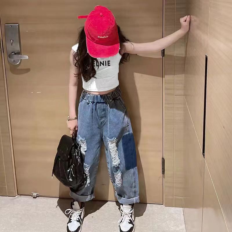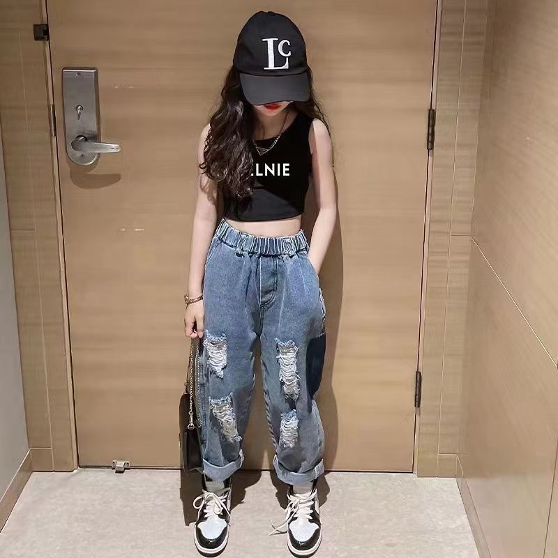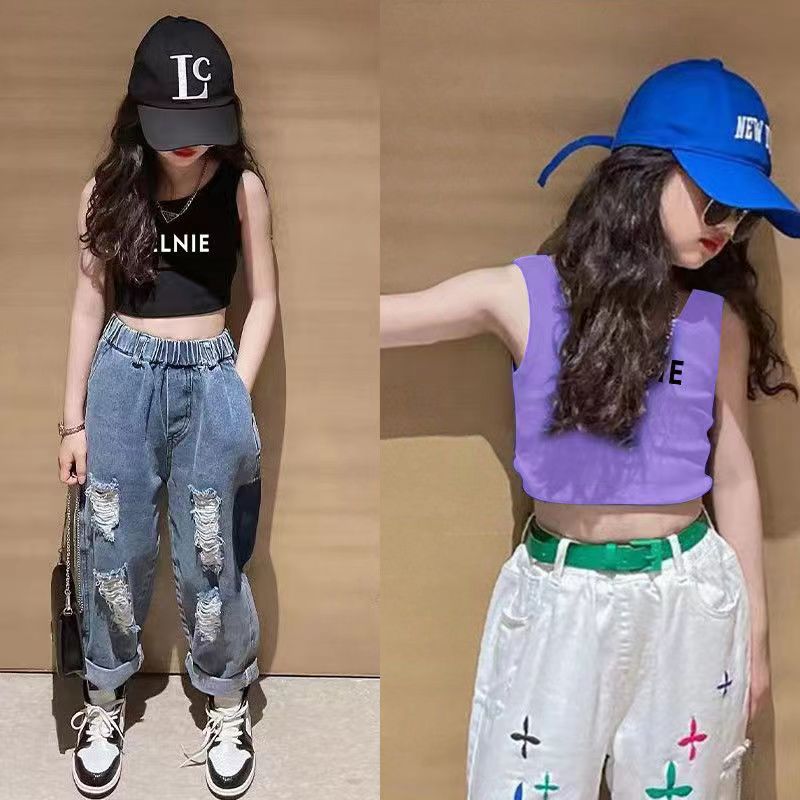 여름 여아 상의, 새로운 한국식 조끼, 짧은 스타일, 중소형 아동용 신축성 있는 멜빵, 배꼽 노출, 하의 셔츠, 인터넷 연예인 스타일
