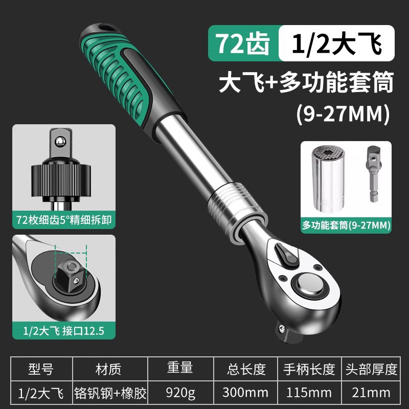• 1/2 텔레스코픽 래칫 렌치 - 72개 톱니 대형 플라이 + 범용 소켓(9-27mm)