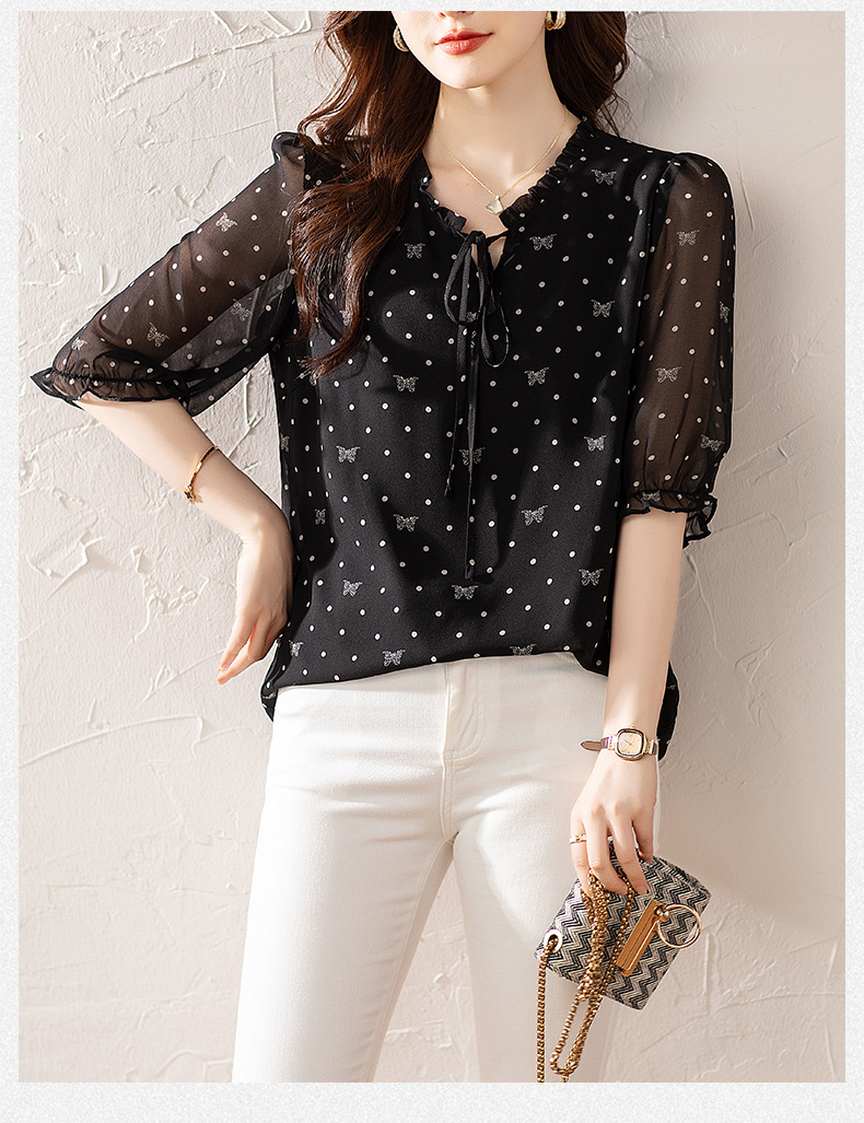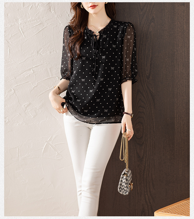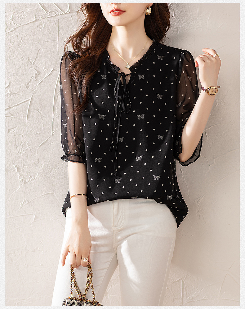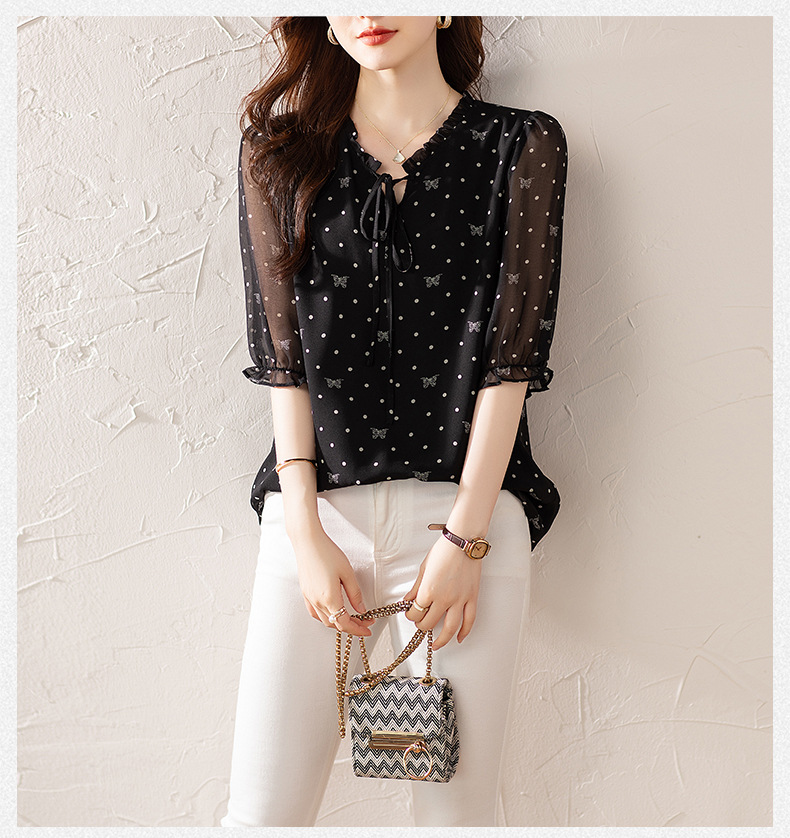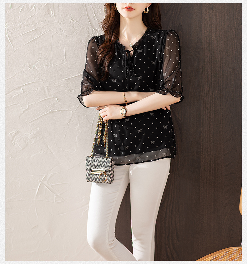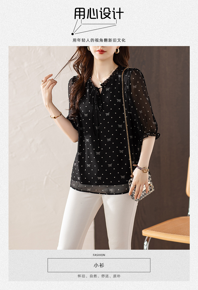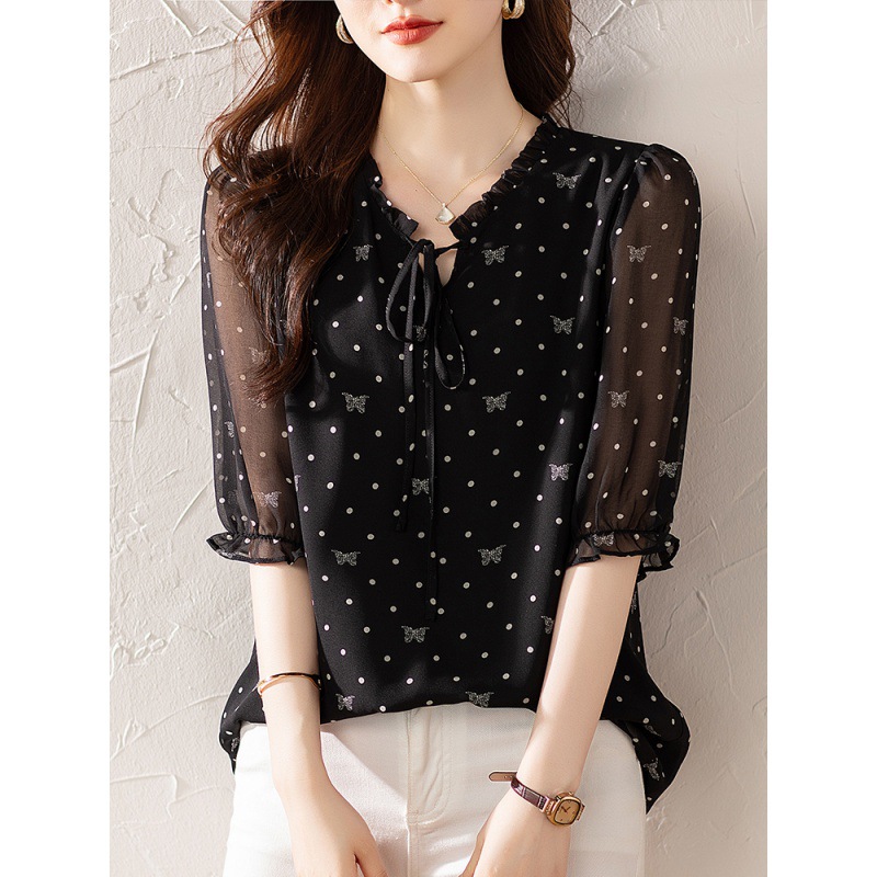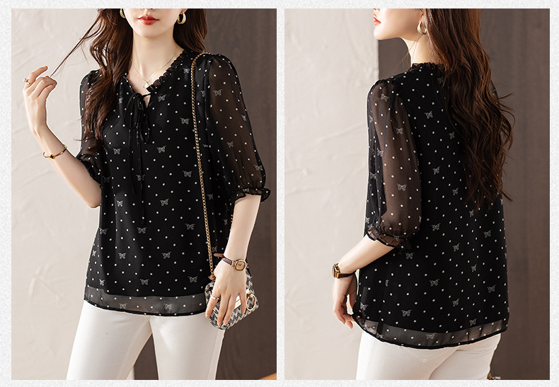 플러스 사이즈 스타일의 나이를 줄이는 느슨한 꽃 쉬폰 셔츠 여성의 2024 년 여름 새로운 최고 느슨한 반팔 셔츠스토어 가기