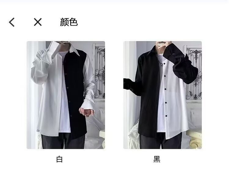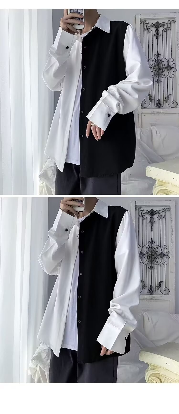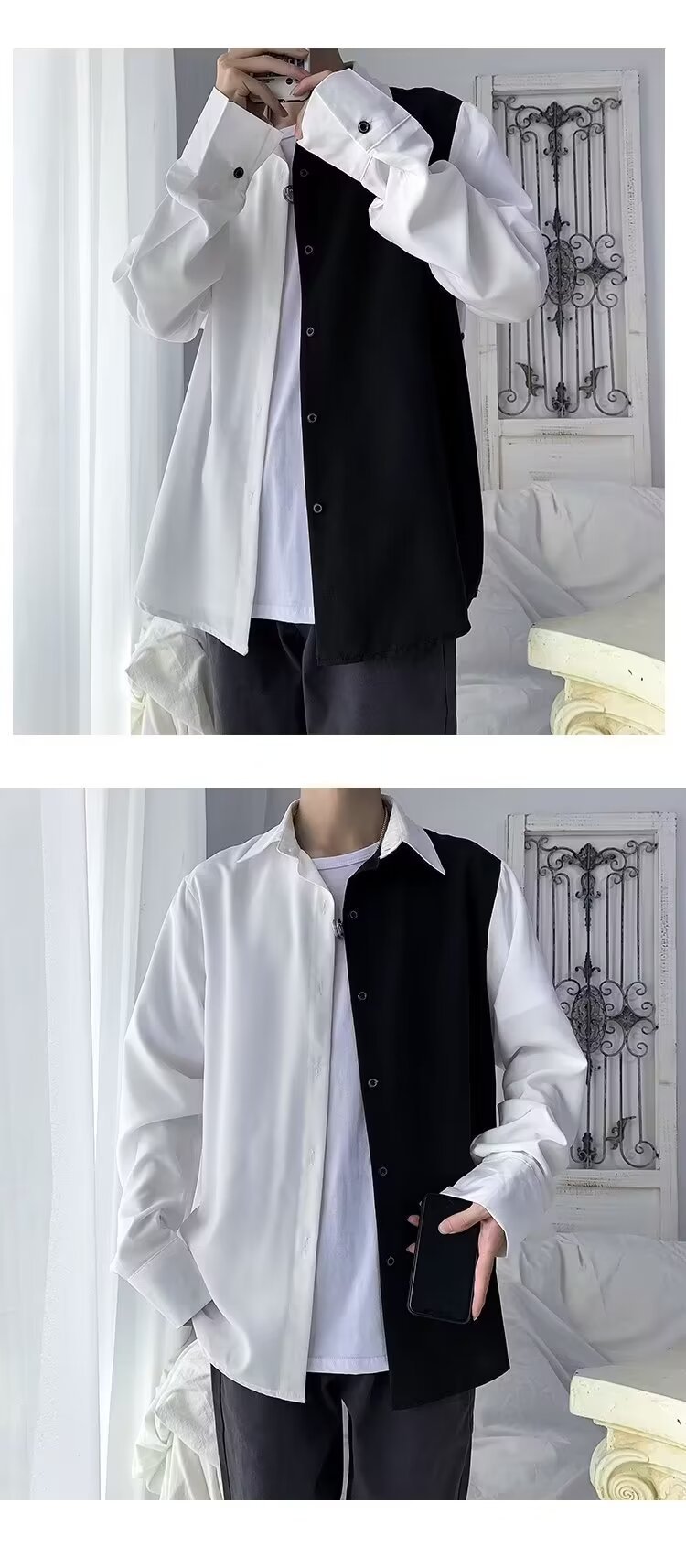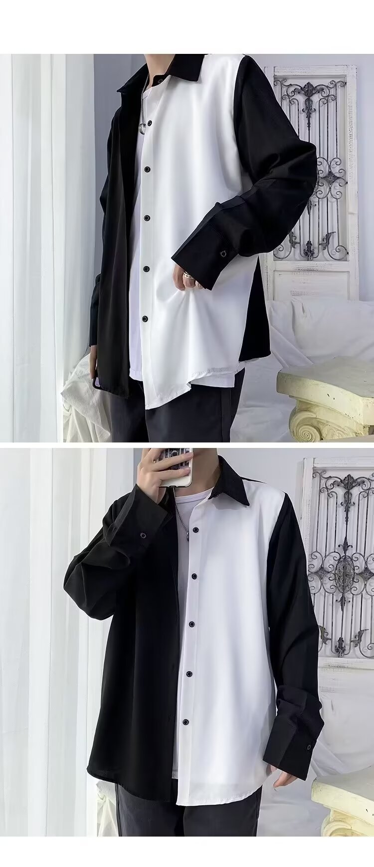 바느질 긴 소매 셔츠 남성 INS 홍콩 스타일 대조 컬러 셔츠 디자인 센스 틈새 최고 봄 여름 흑백 프라이드 스트리트 재킷스토어 가기