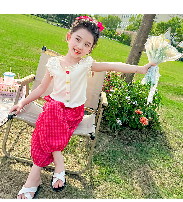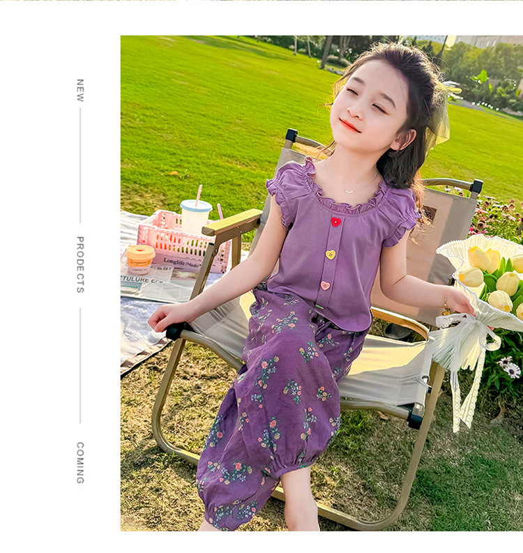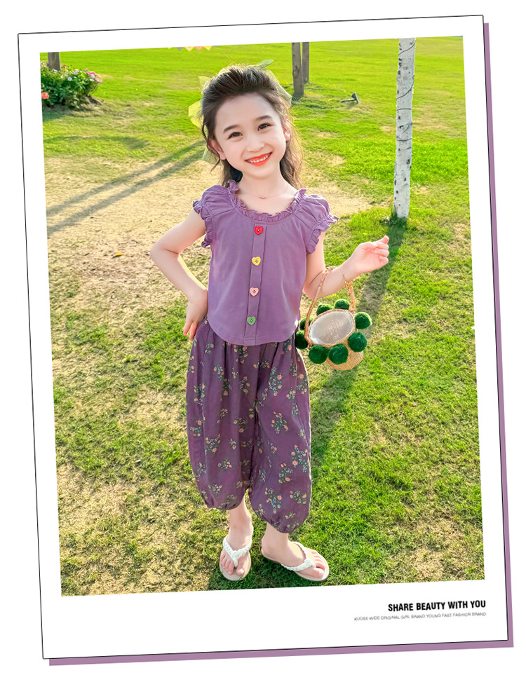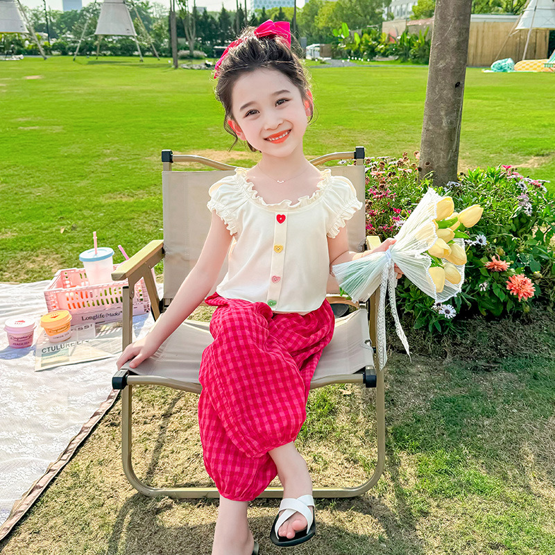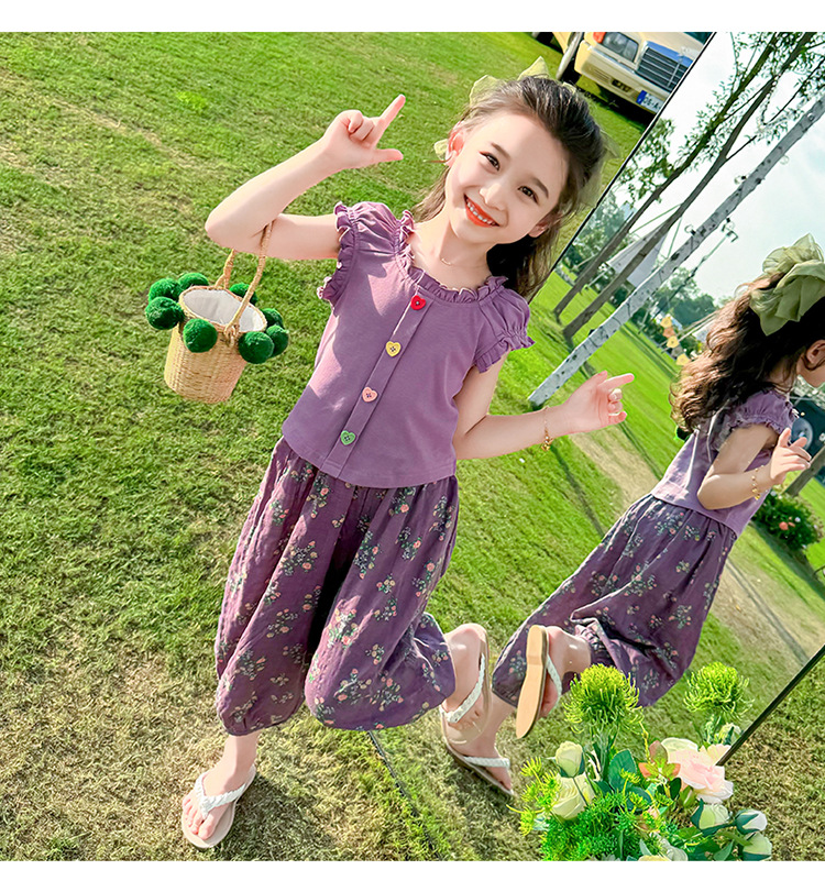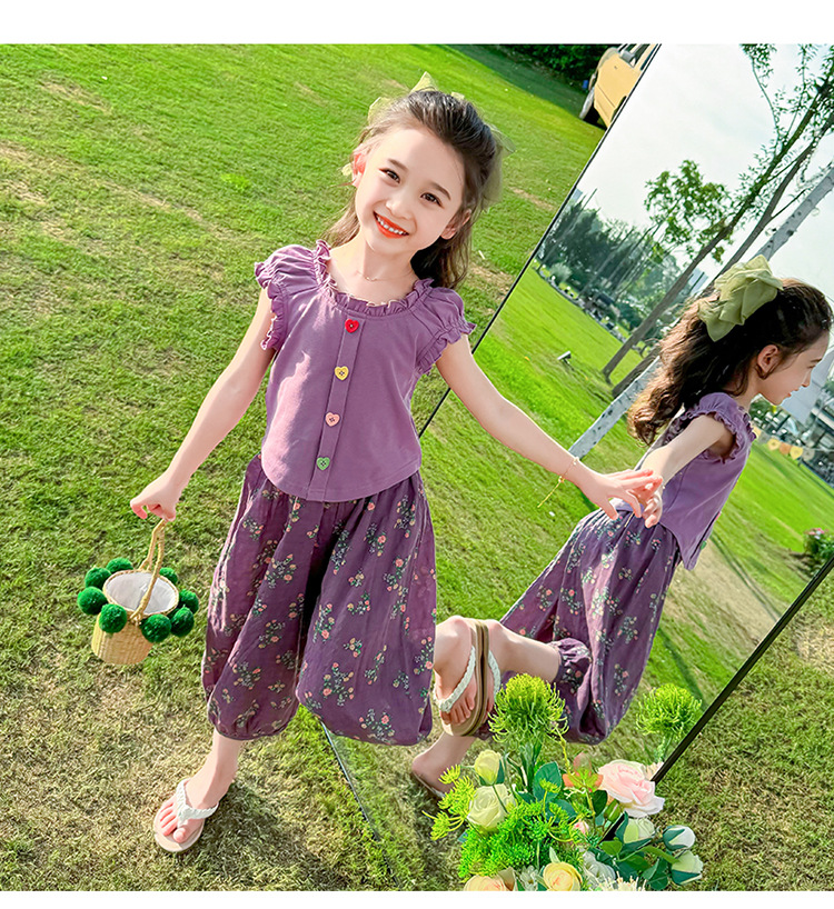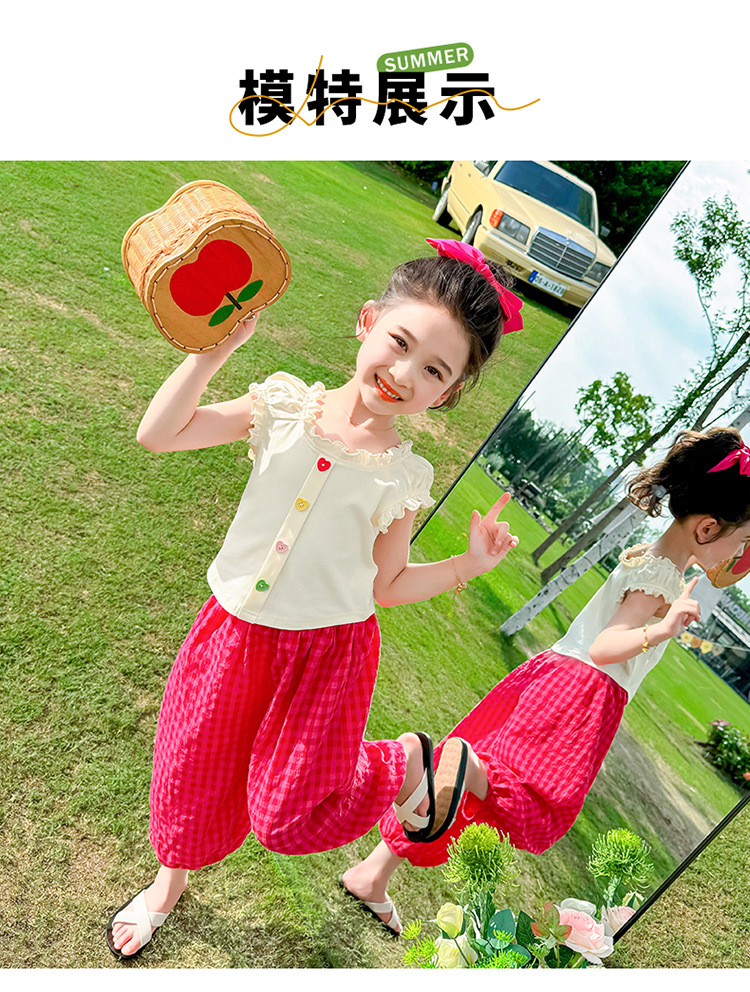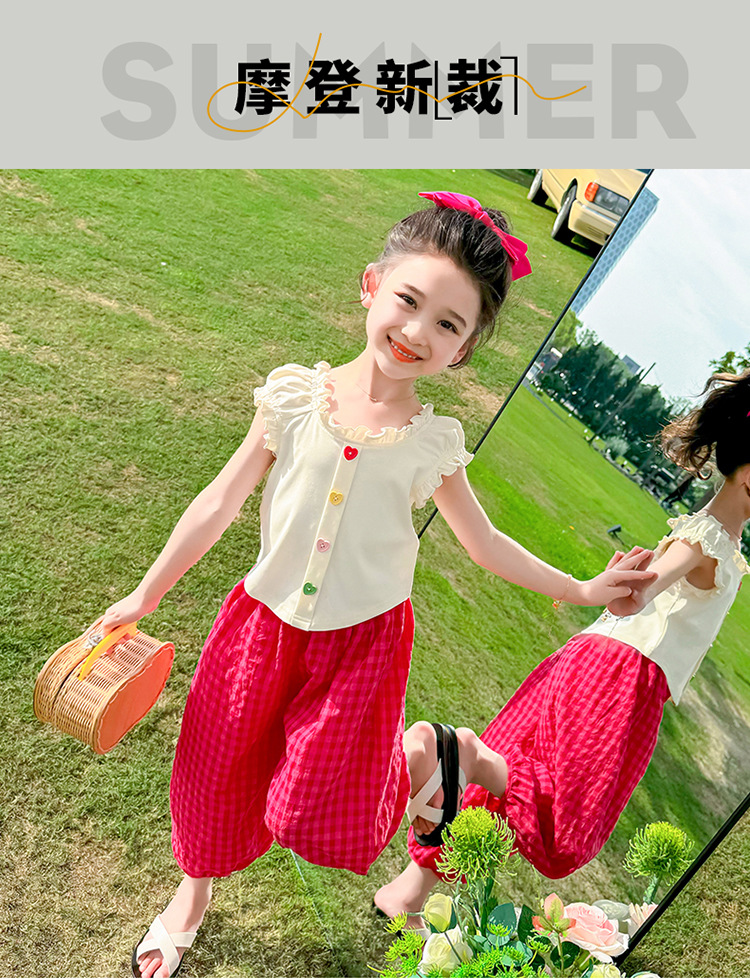소녀 여름 세트 2024 새로운 패션 어린 소녀 사랑 버클 안티 모기 바지 세트 어린이 투피스 세트