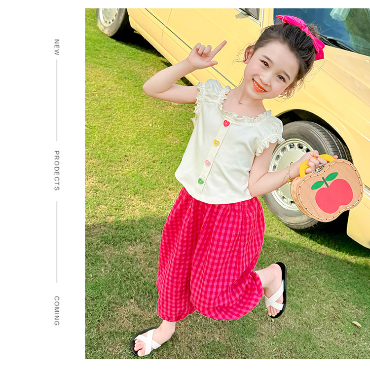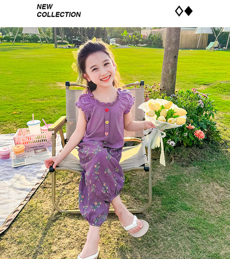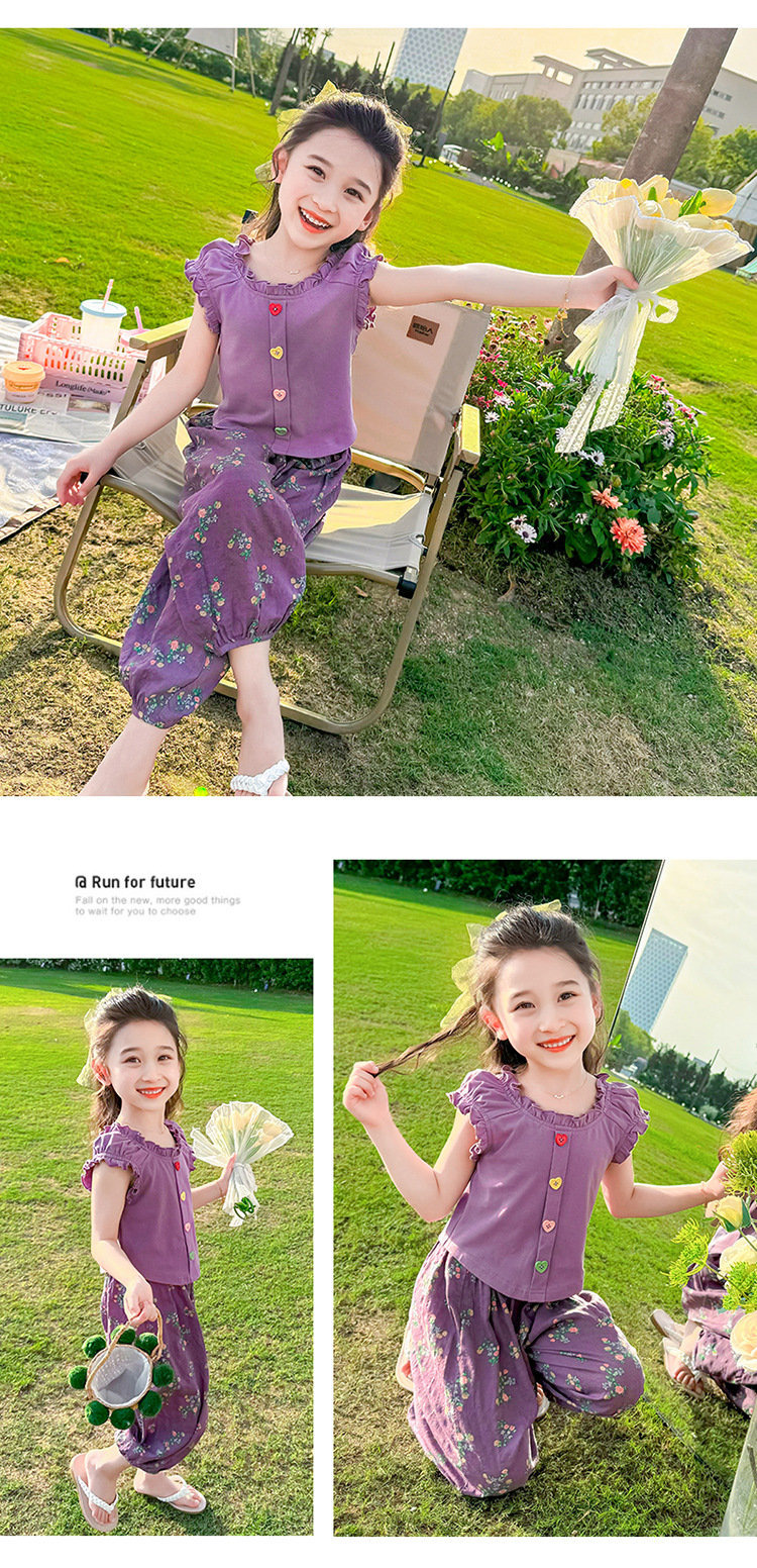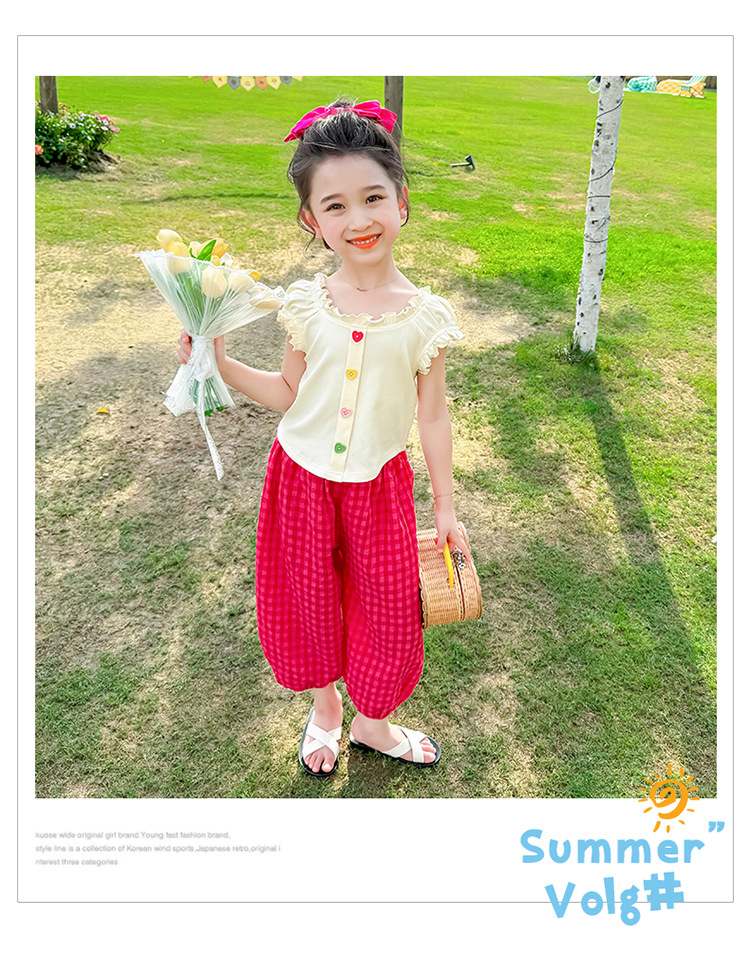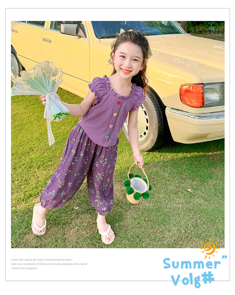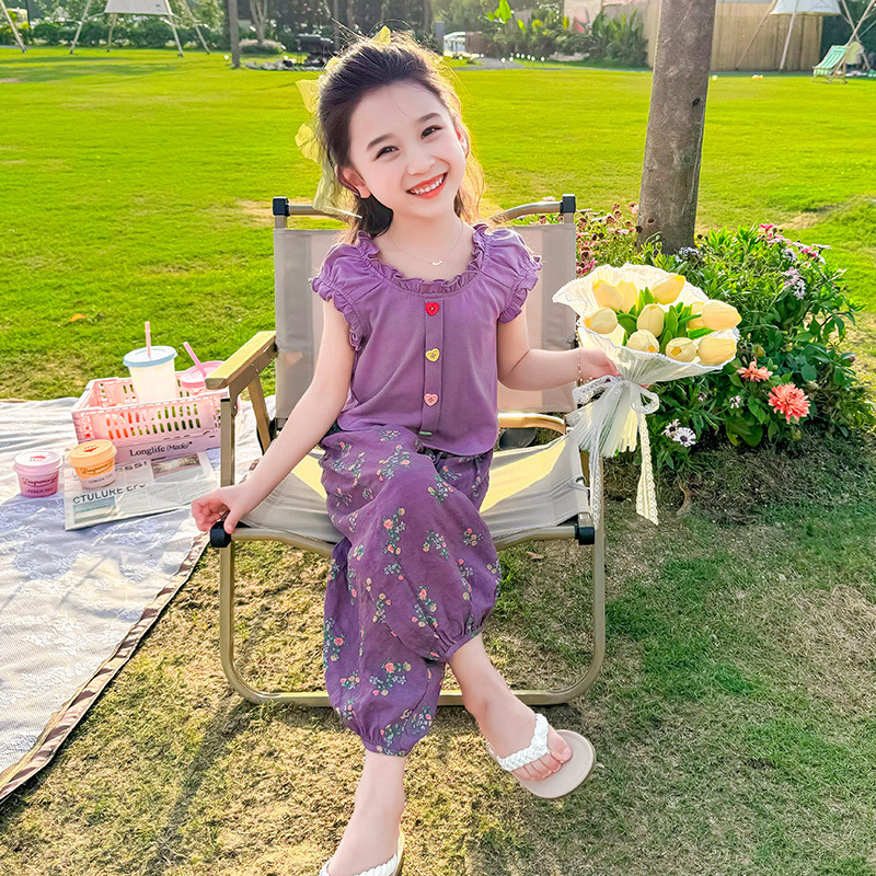 소녀 여름 세트 2024 새로운 패션 어린 소녀 사랑 버클 안티 모기 바지 세트 어린이 투피스 세트