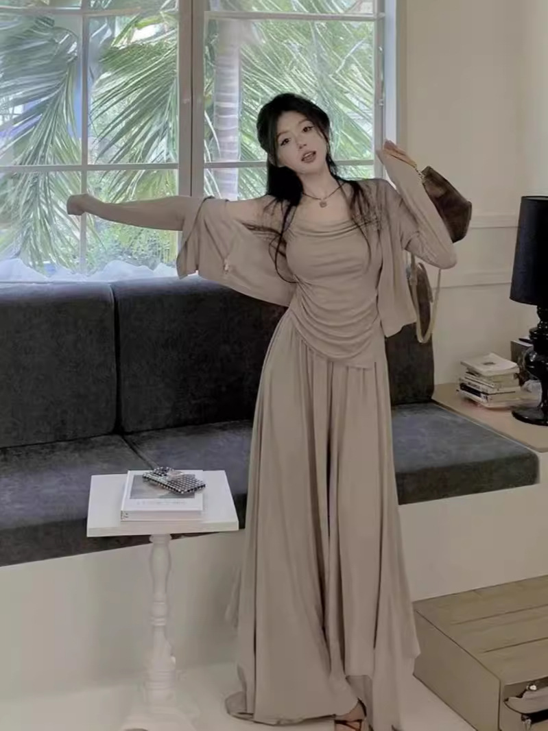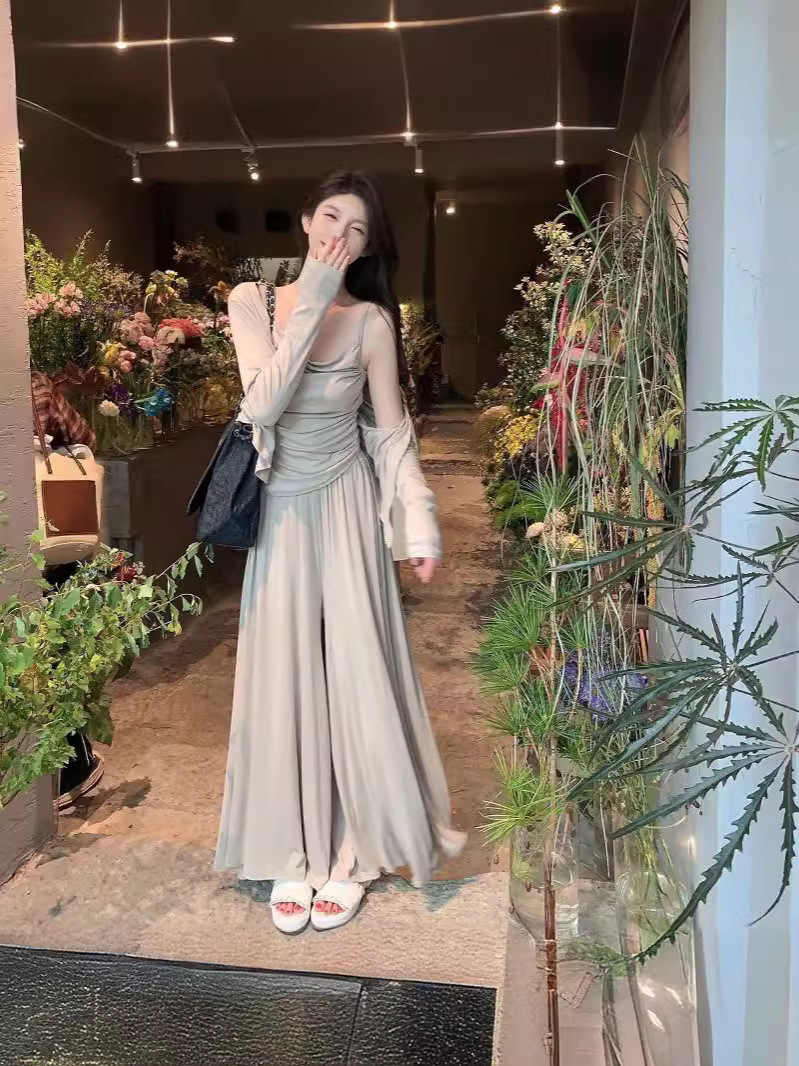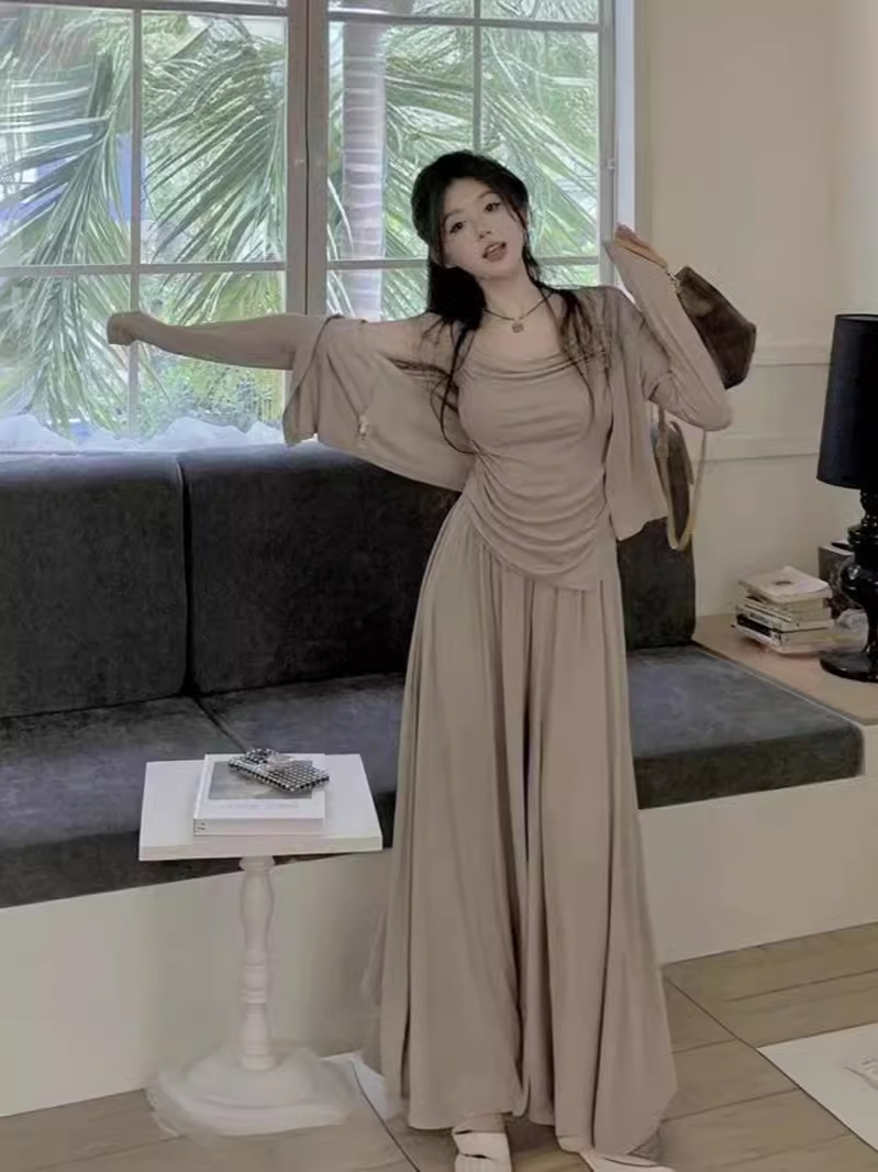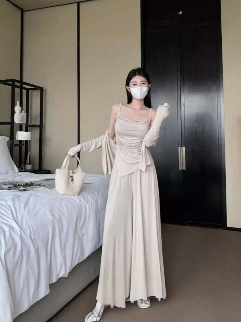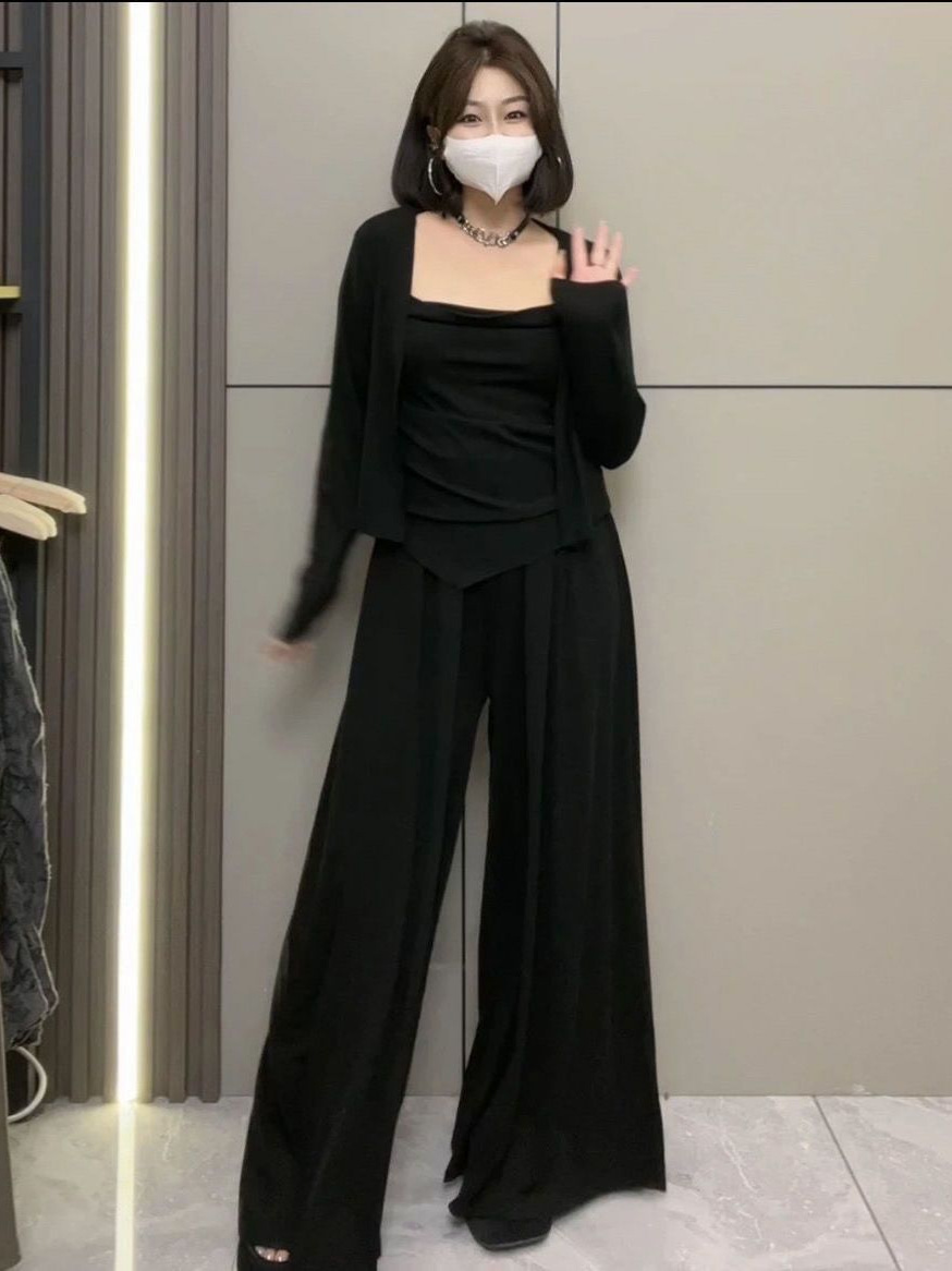 [쓰리 피스 세트] 순수한 욕망 바람 세트 여성 캐미솔 카디건 탑 여성 봄과 가을 드레이프 캐주얼 와이드 레그 팬츠