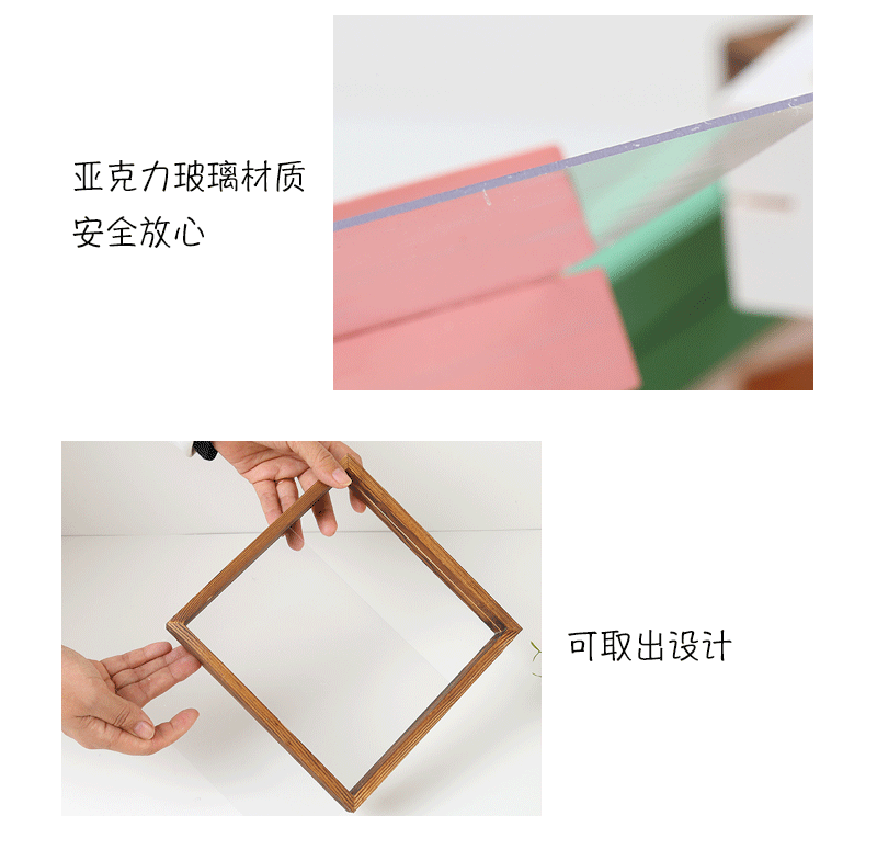 亚克力画框单层和双层的区别:单层主要用来涂鸦、画画等。双层主要 用来夹相片、干花、蝴蝶标本等
