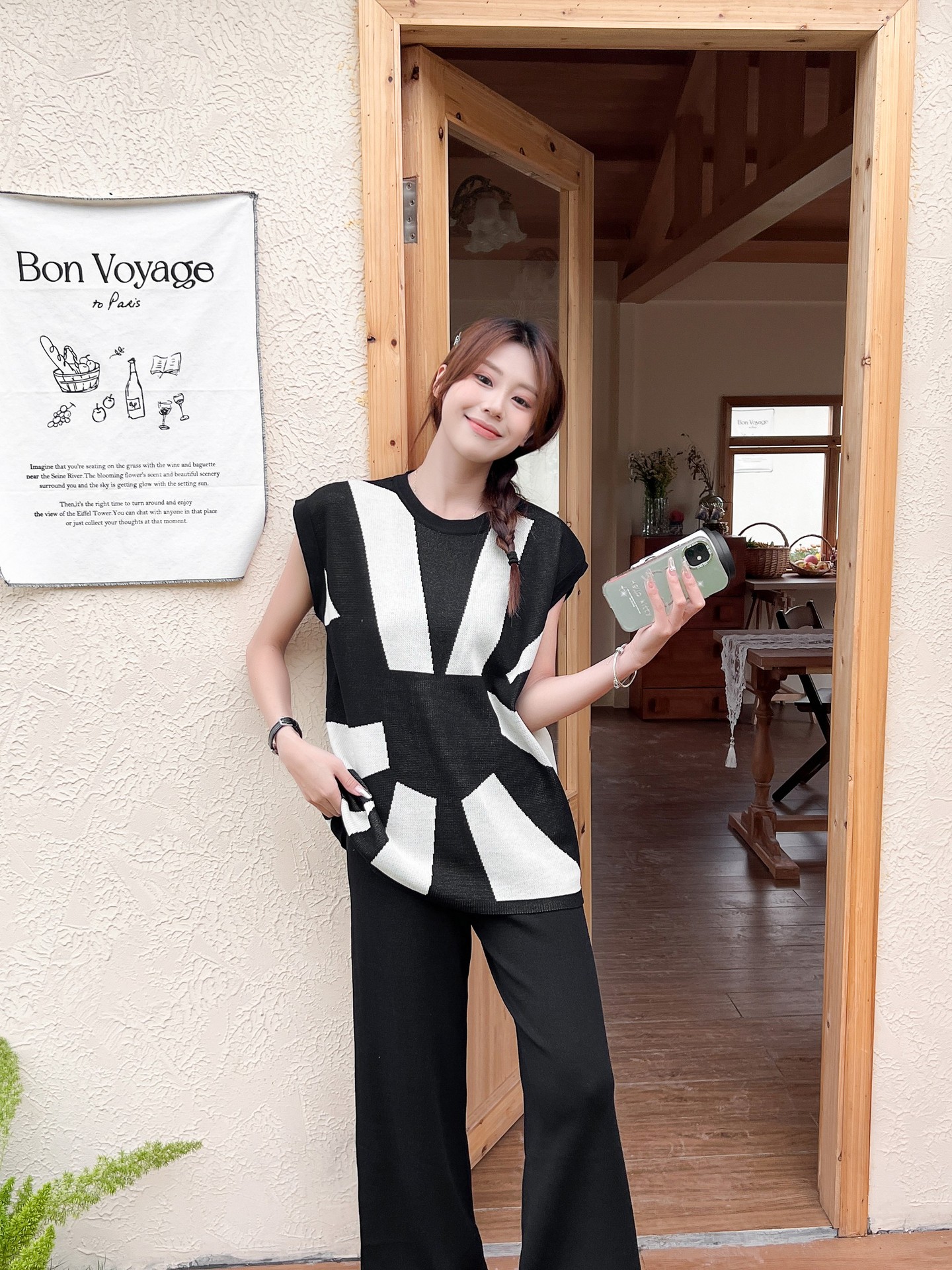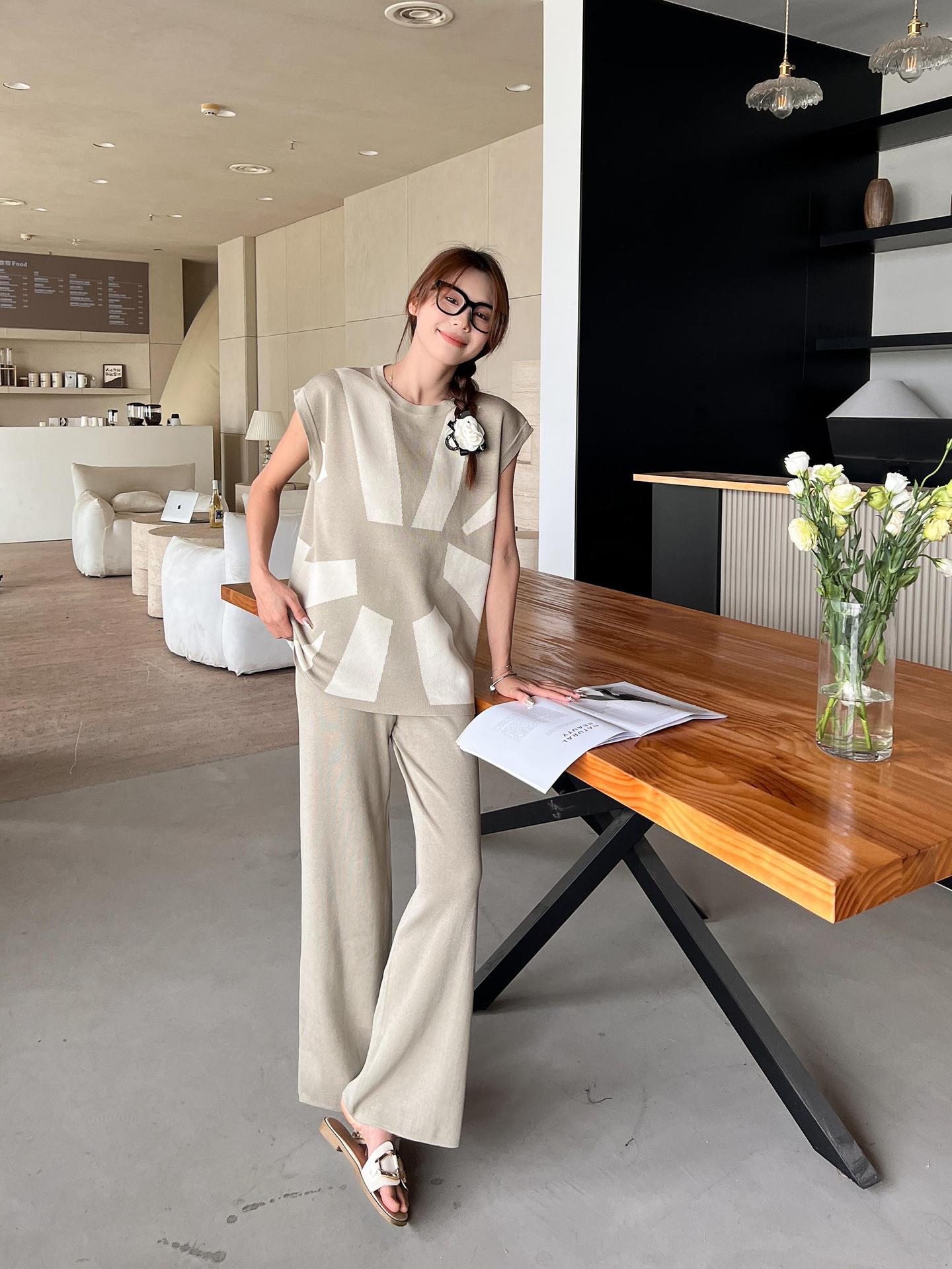 2024 사교계 새로운 올 매치 디자인 센스 민소매 가운 어깨 느슨한 니트 탑 슬림 룩 와이드 레그 바지 여성용 2 피스 세트스토어 가기