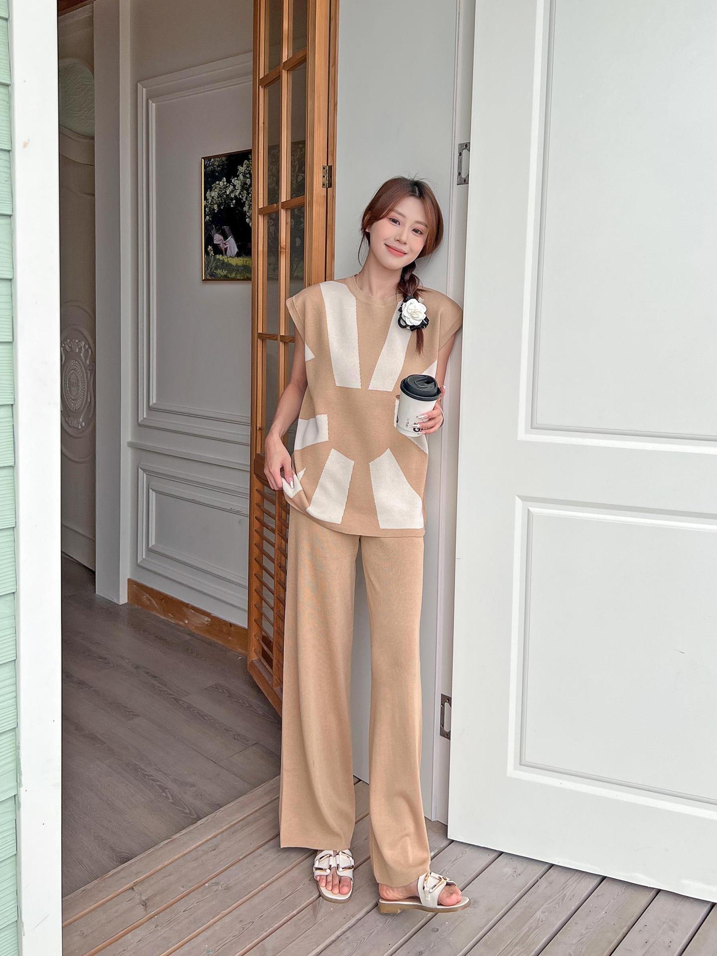 2024 사교계 새로운 올 매치 디자인 센스 민소매 가운 어깨 느슨한 니트 탑 슬림 룩 와이드 레그 바지 여성용 2 피스 세트