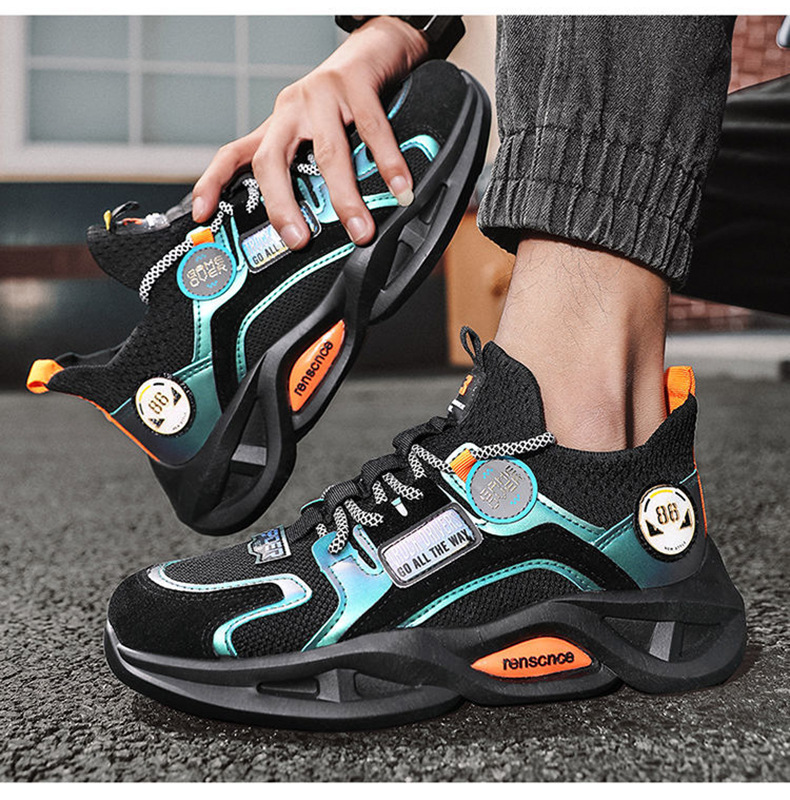 봄 새로운 패션 남성 신발 레이스 업 통기성 플라이 짠 운동화 패션 블레이드 두꺼운 바닥 편안한 운동화 세대스토어 가기