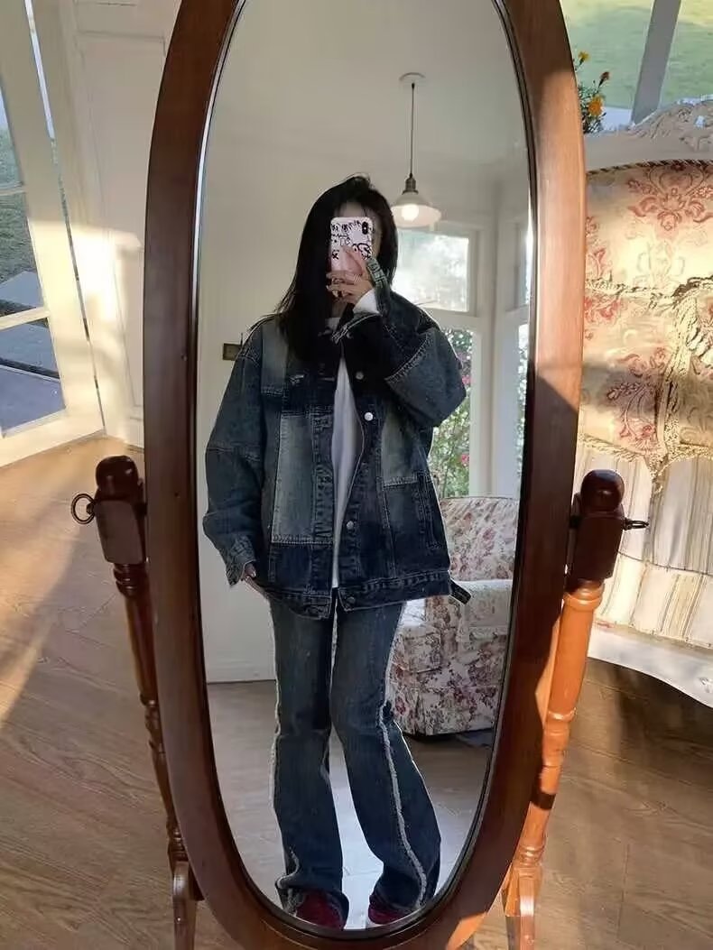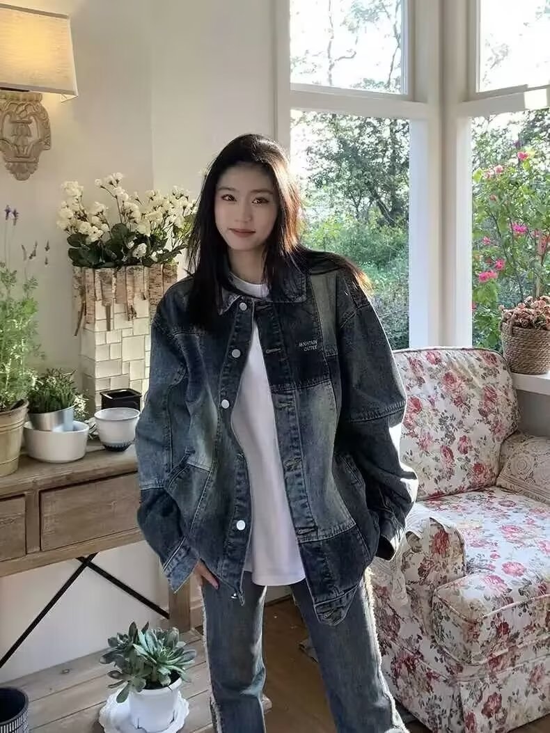 아메리칸 스타일 레트로 블루 스티칭 데님 재킷 여성의 2024 가을 새로운 느슨한 틈새 디자인 재킷 탑스토어 가기