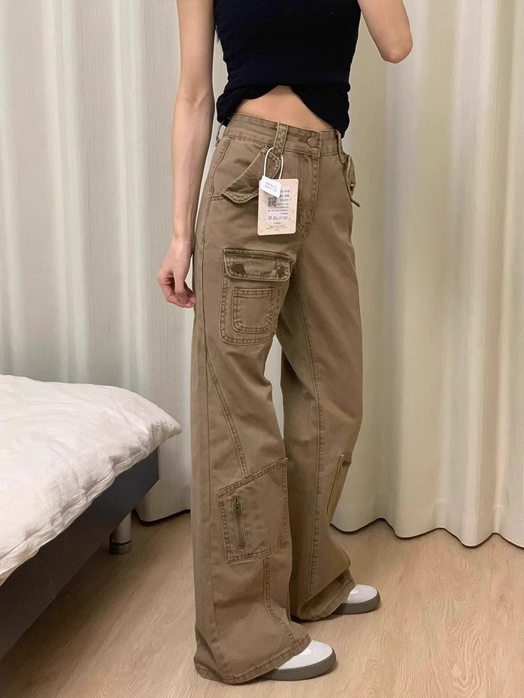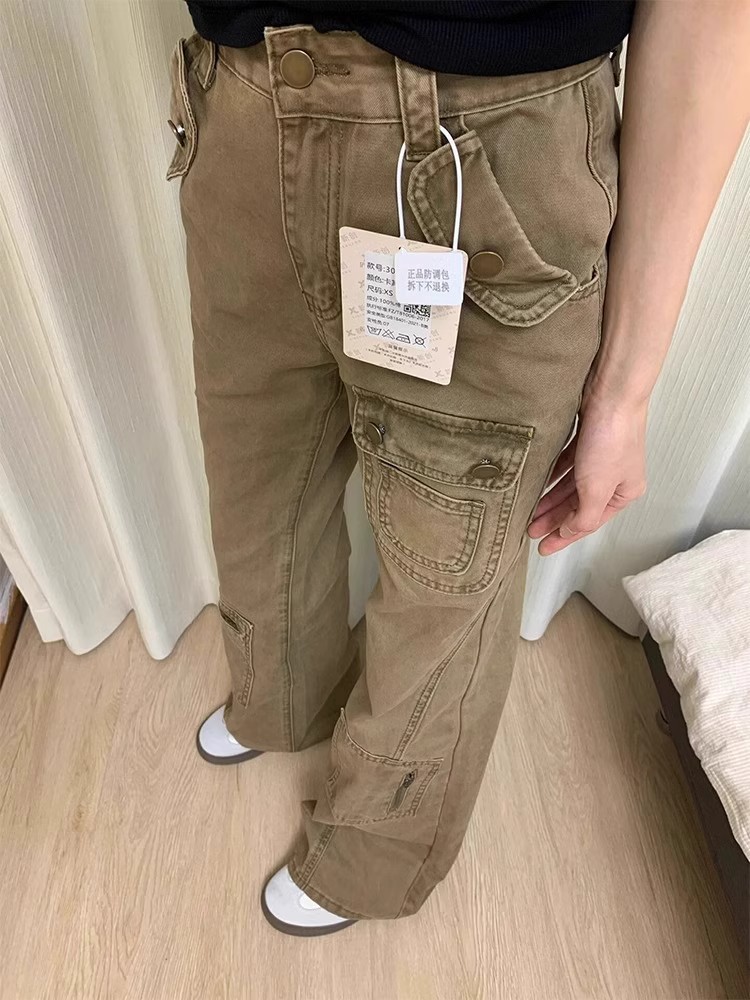 미국 복고풍 카키 마이크로-라라, 여성 여름 새로운 디자인 센스 스트레이트 루즈 와이드 레그 데님 바지스토어 가기