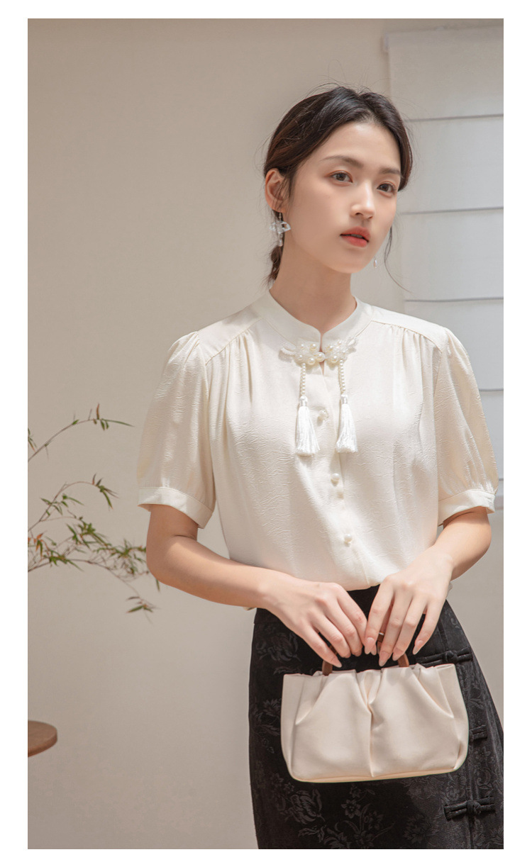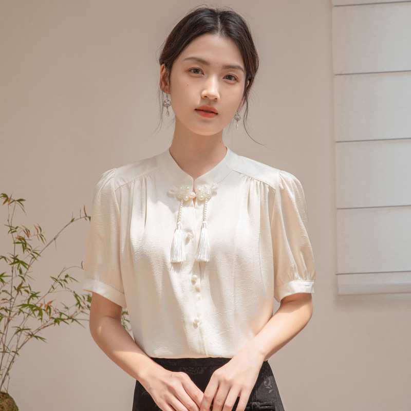 새로운 중국 반팔 셔츠 여성 여름 스타일 빈티지 디자인 틈새 느슨한 전문 통근 셔츠 도매
