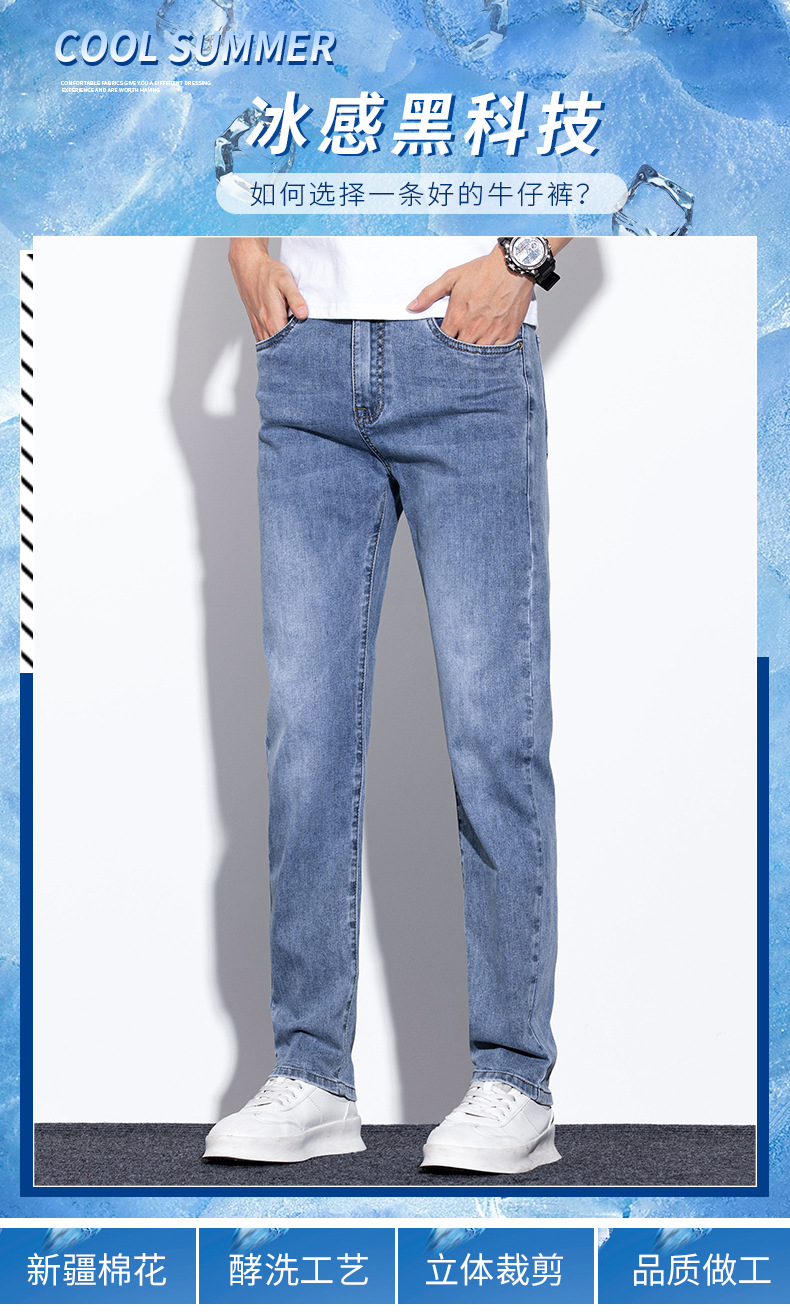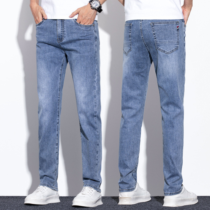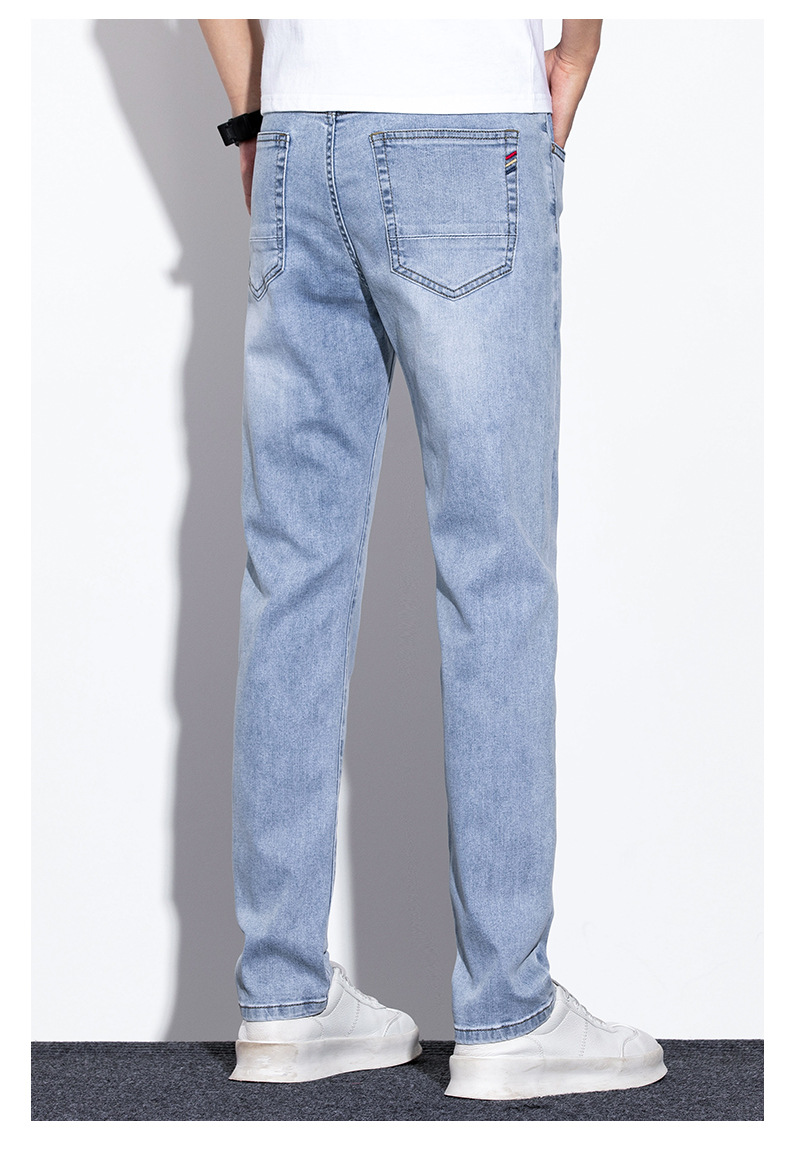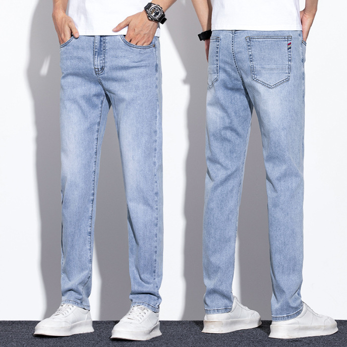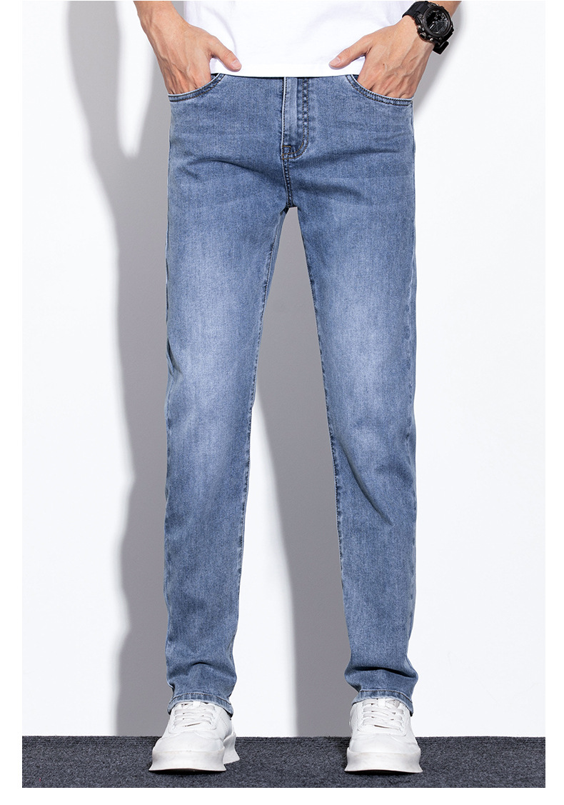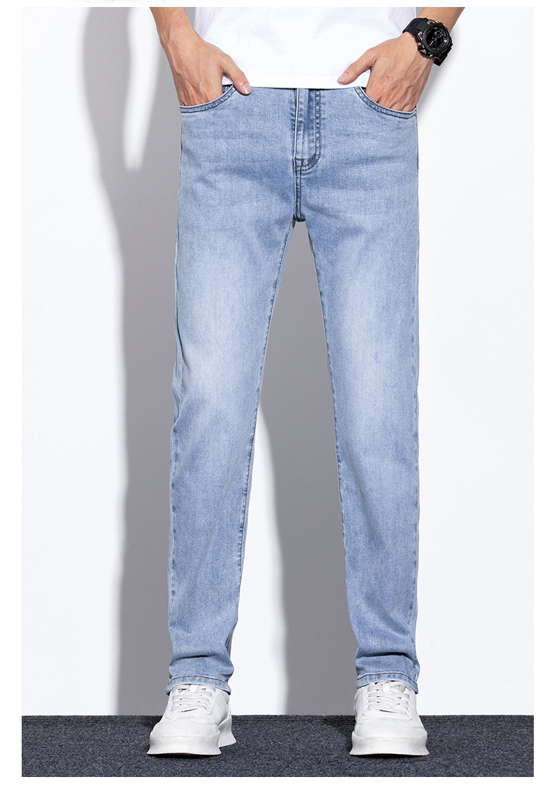 라이트 블루 청바지 남성 2024 년 여름 새로운 얇은 직선 캐주얼 바지 슬림 핏 비즈니스 스트레치 바지