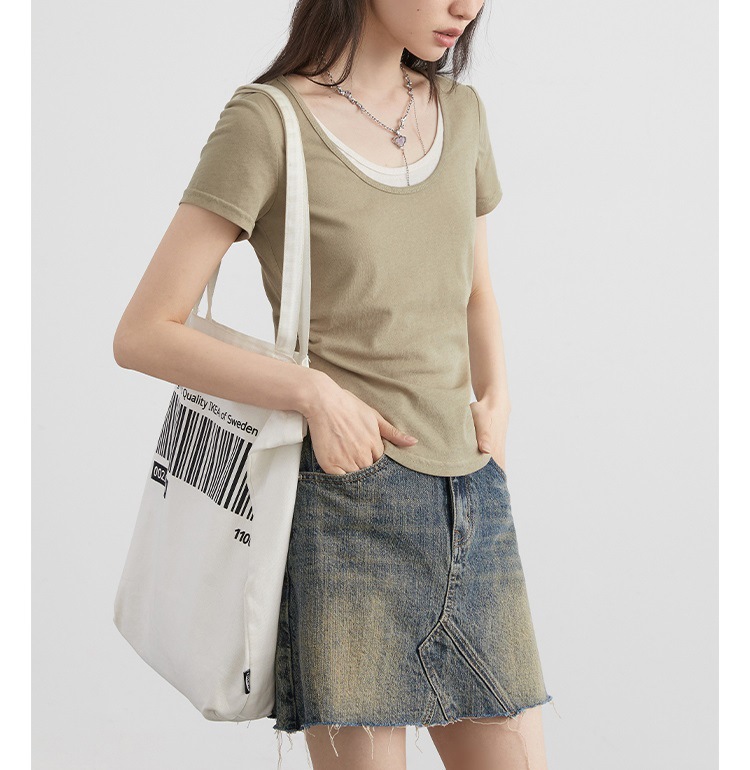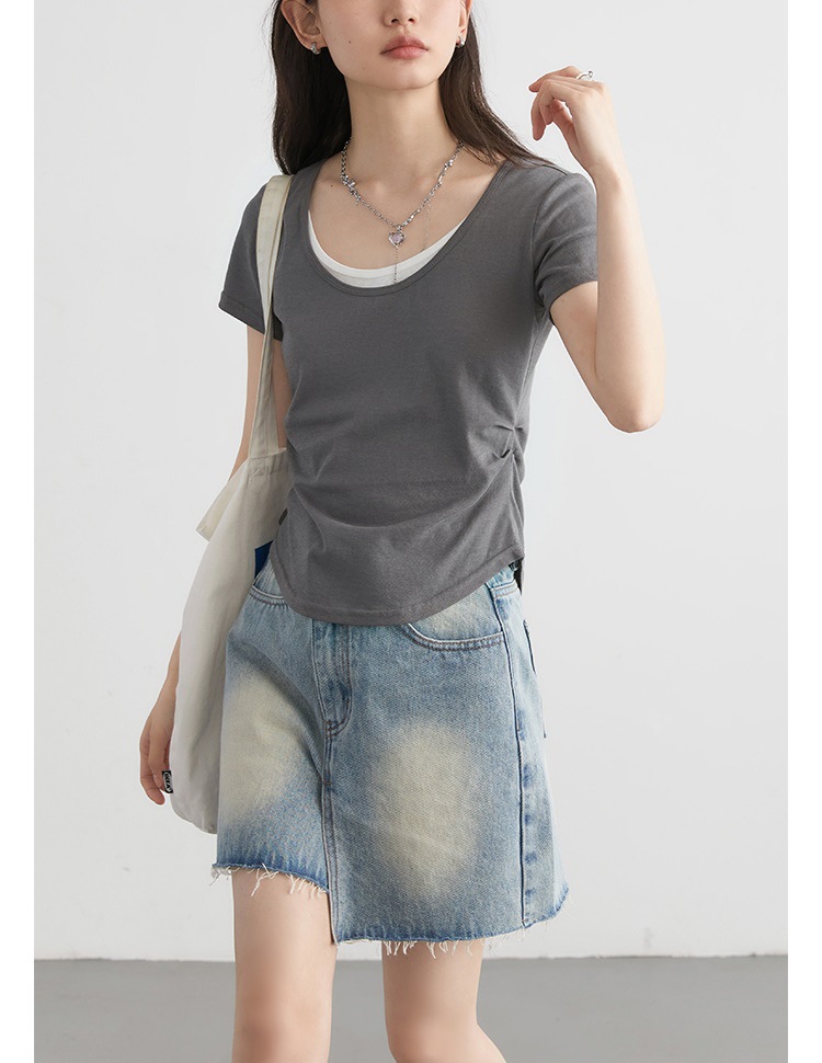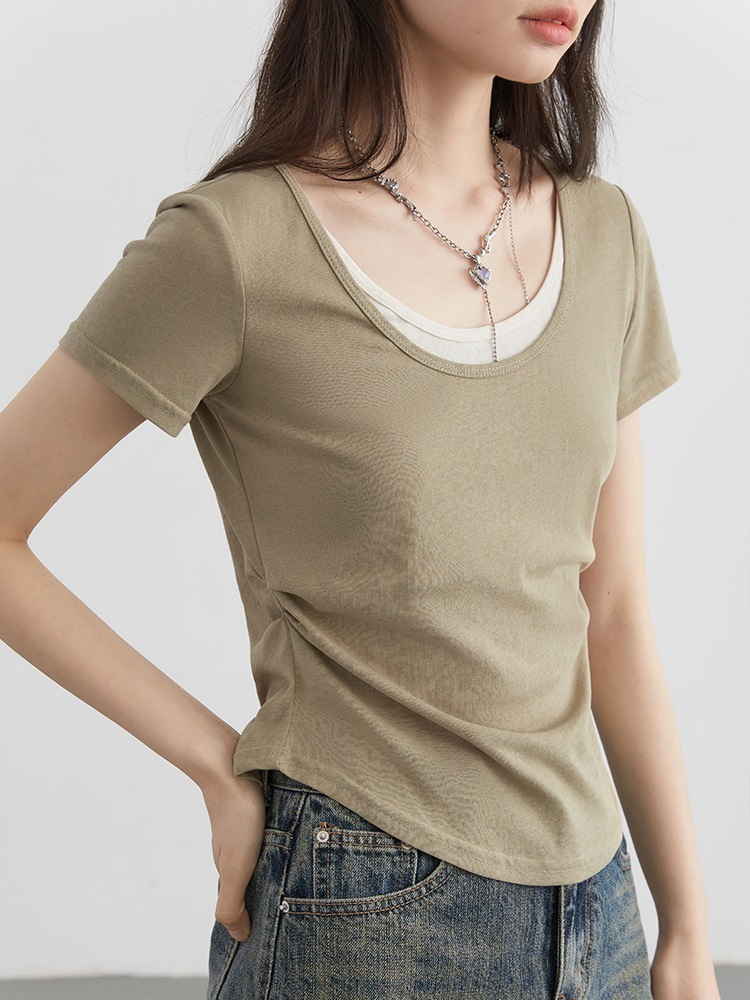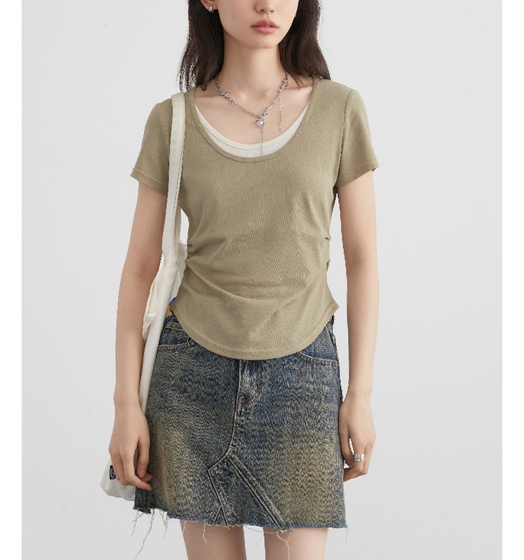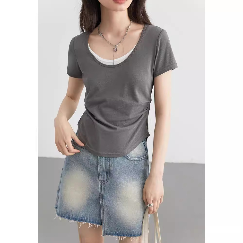 유럽 역 여성 2024 여름 새로운 디자인 U-칼라 대비 컬러 가짜 투피스 플리츠 티셔츠 어깨 반팔 탑스토어 가기