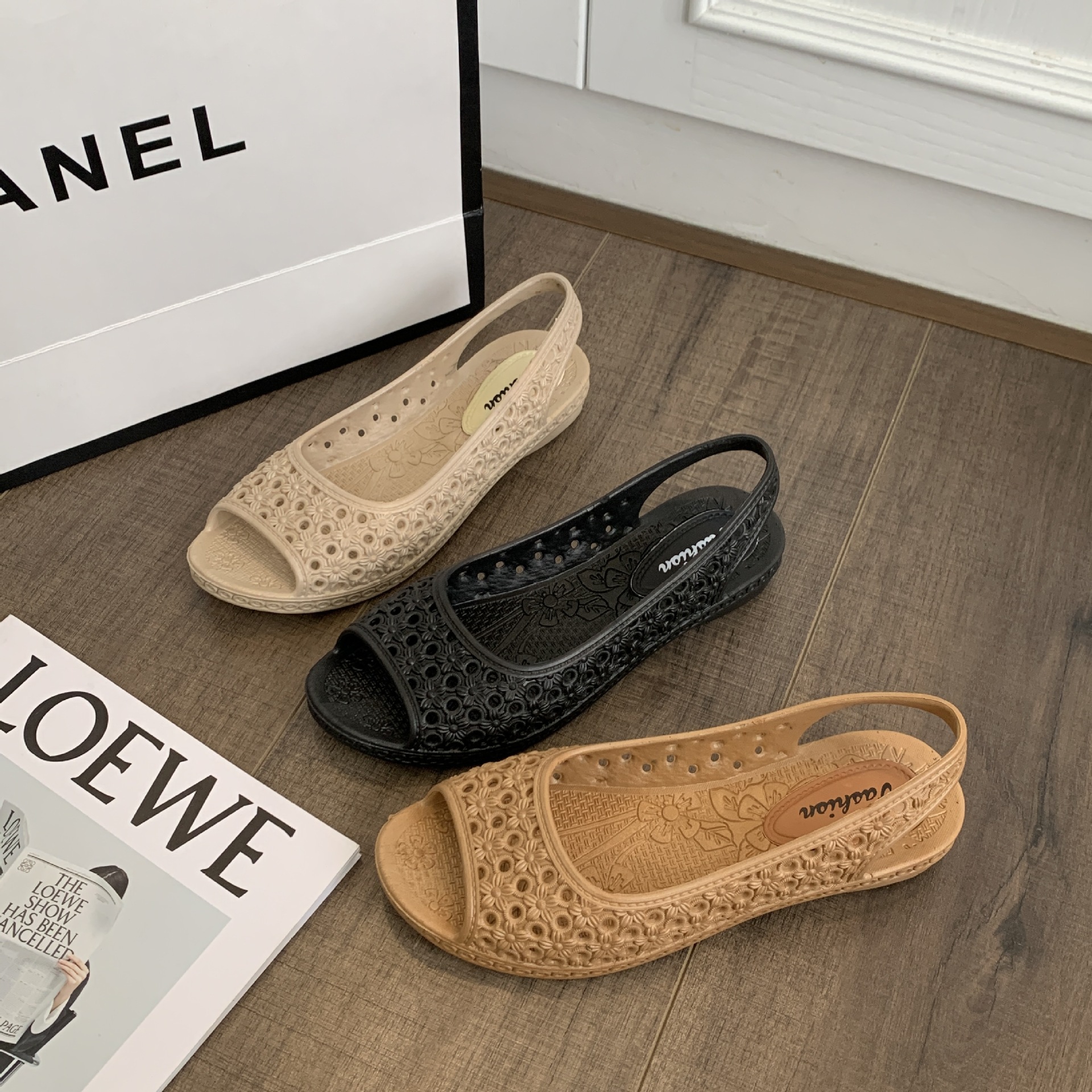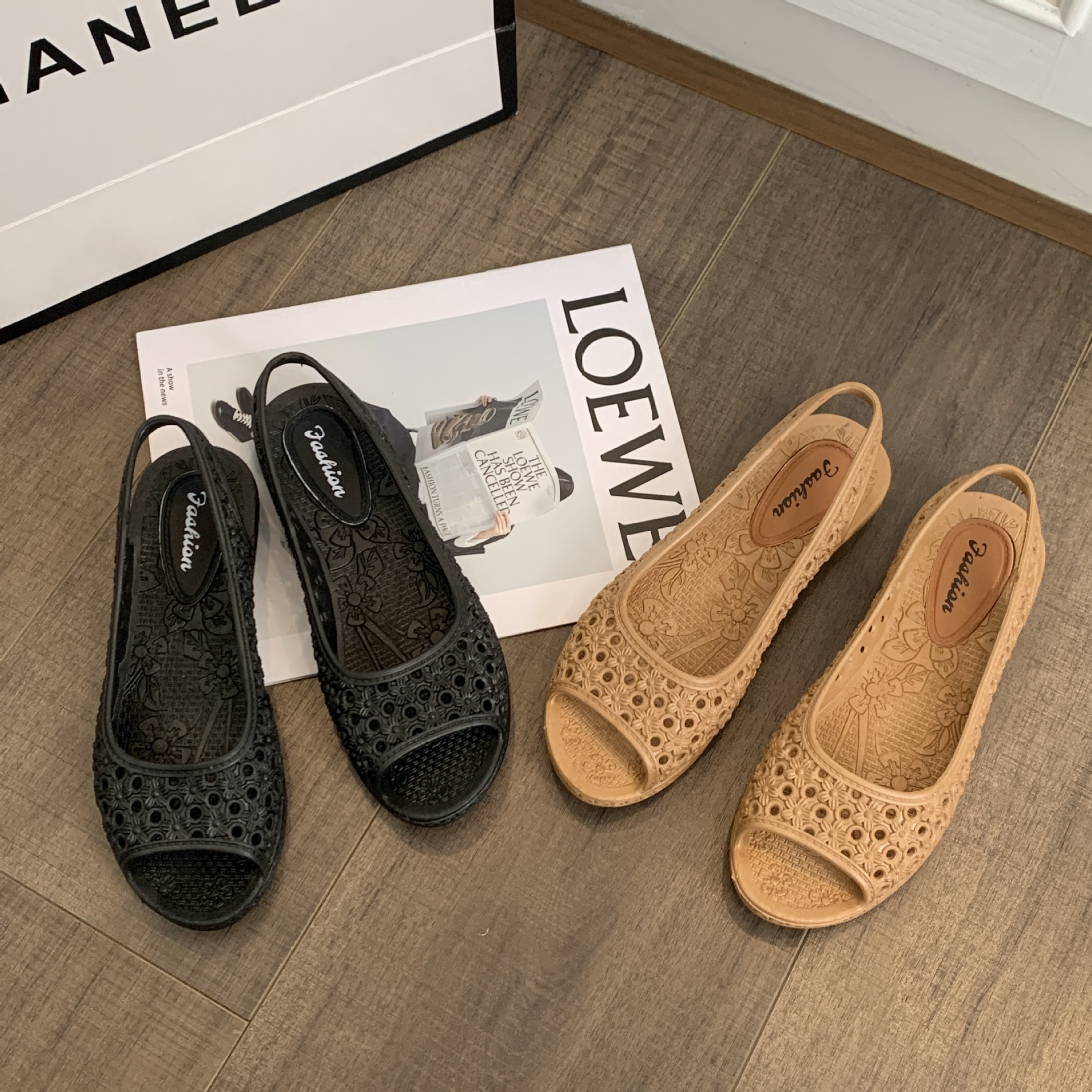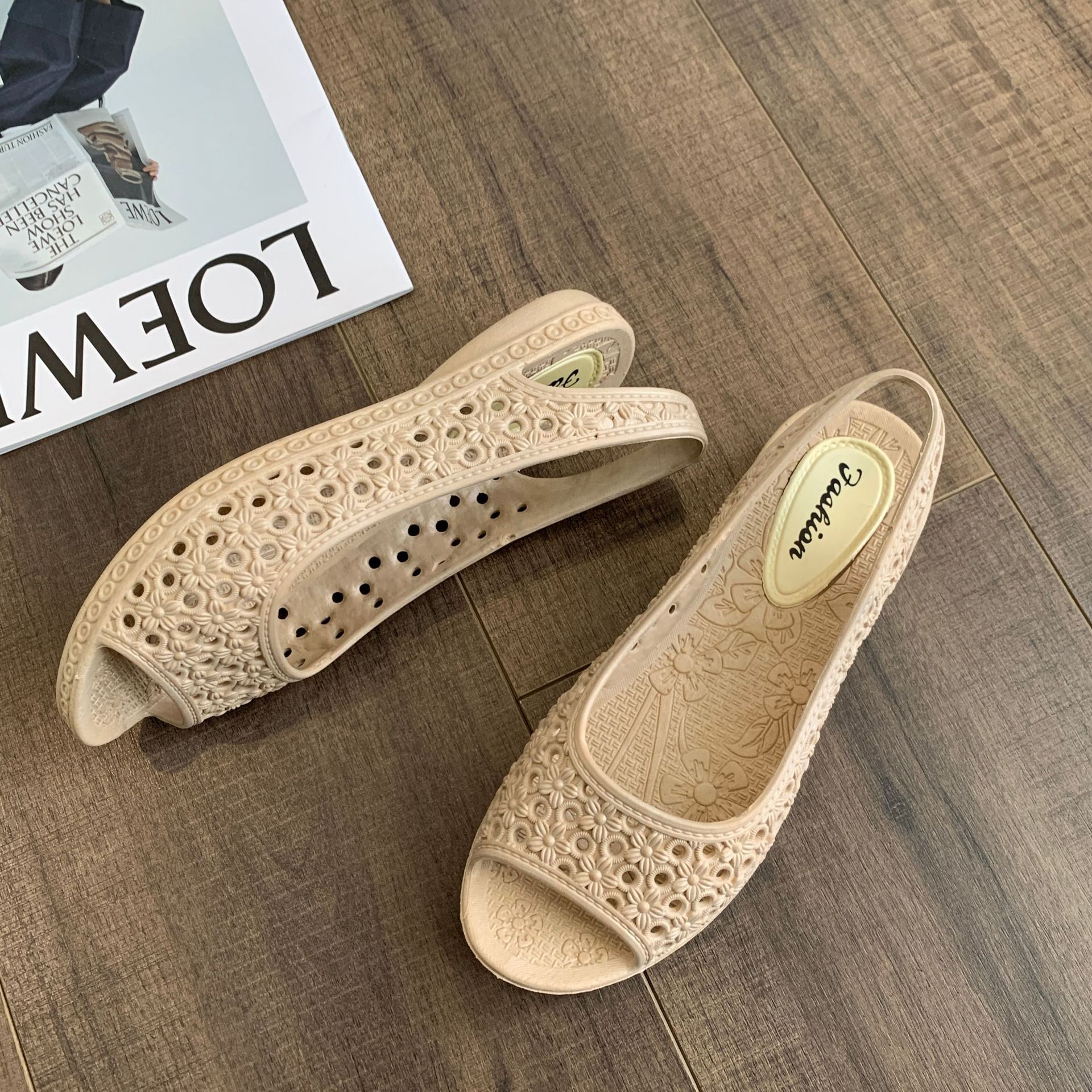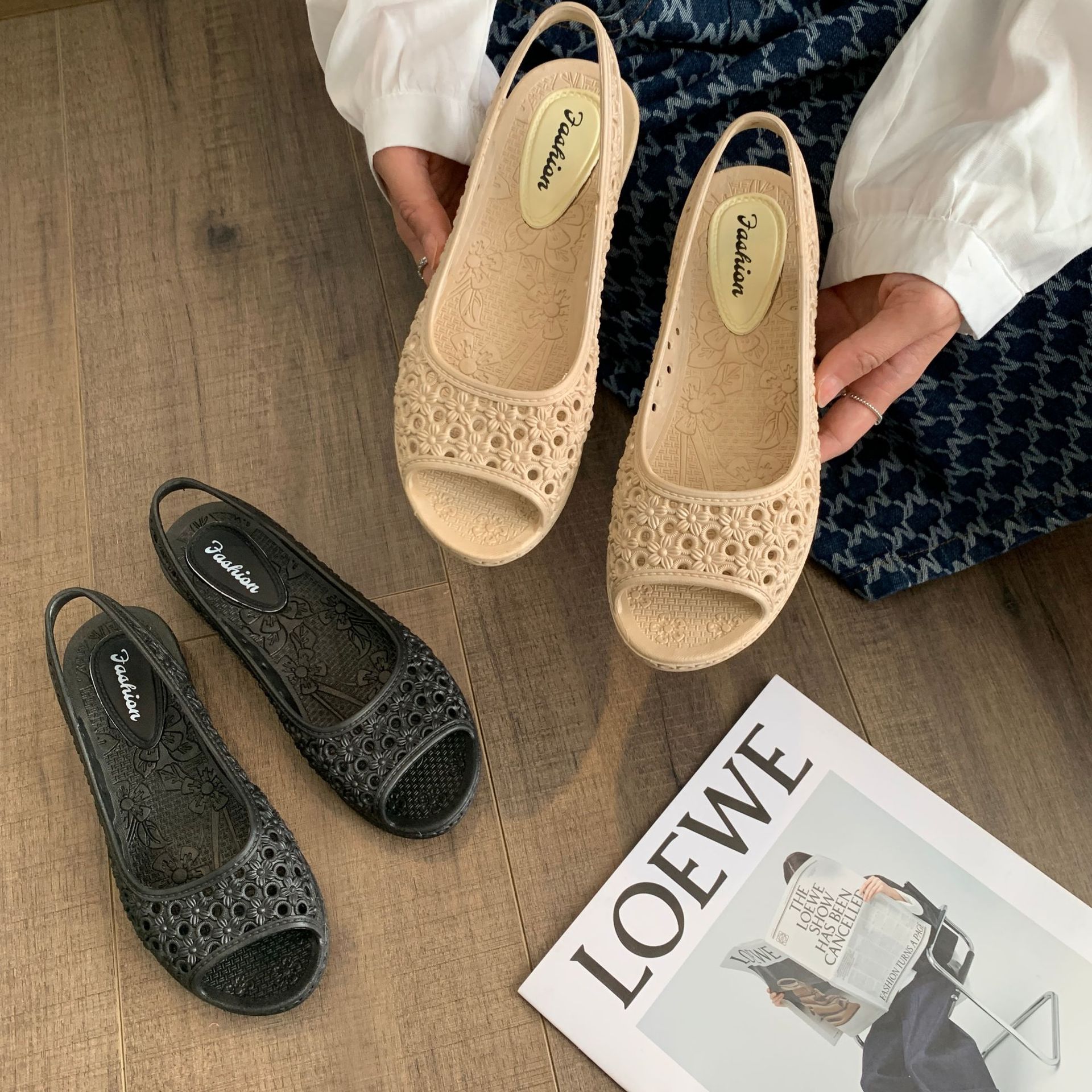 새로운 여름 샌들 솔리드 컬러 캐주얼 아웃웨어 패션 할로우 비치 플랫 리어 쿨 스트랩 여성용 신발스토어 가기